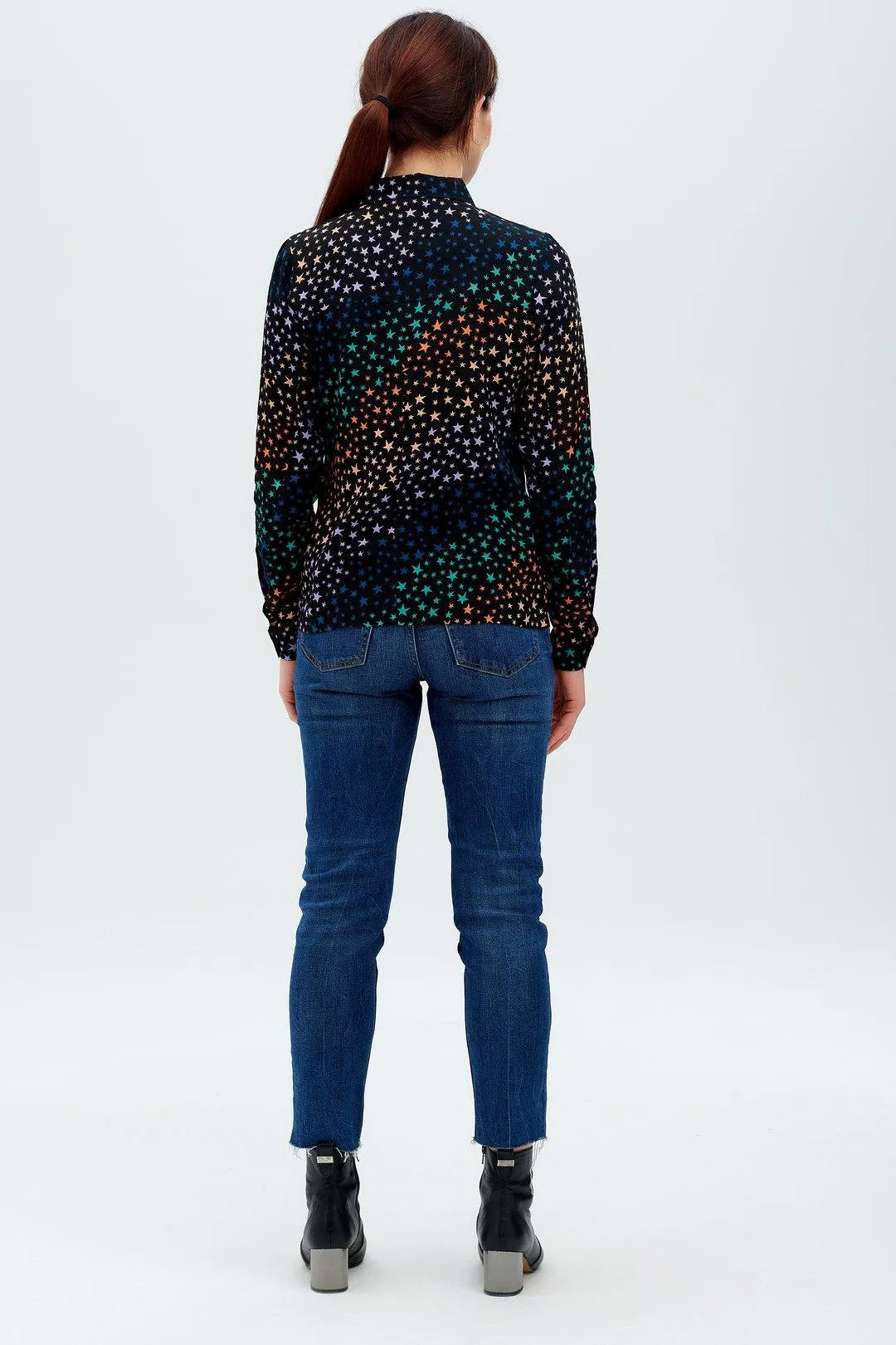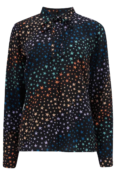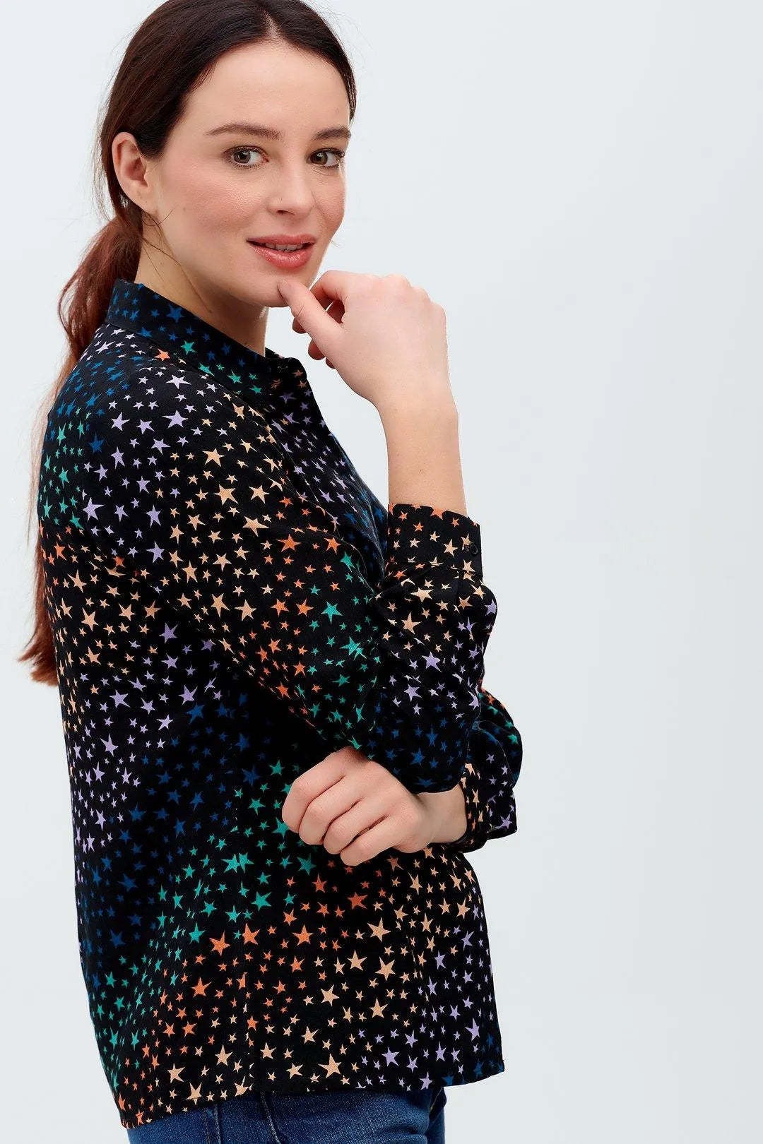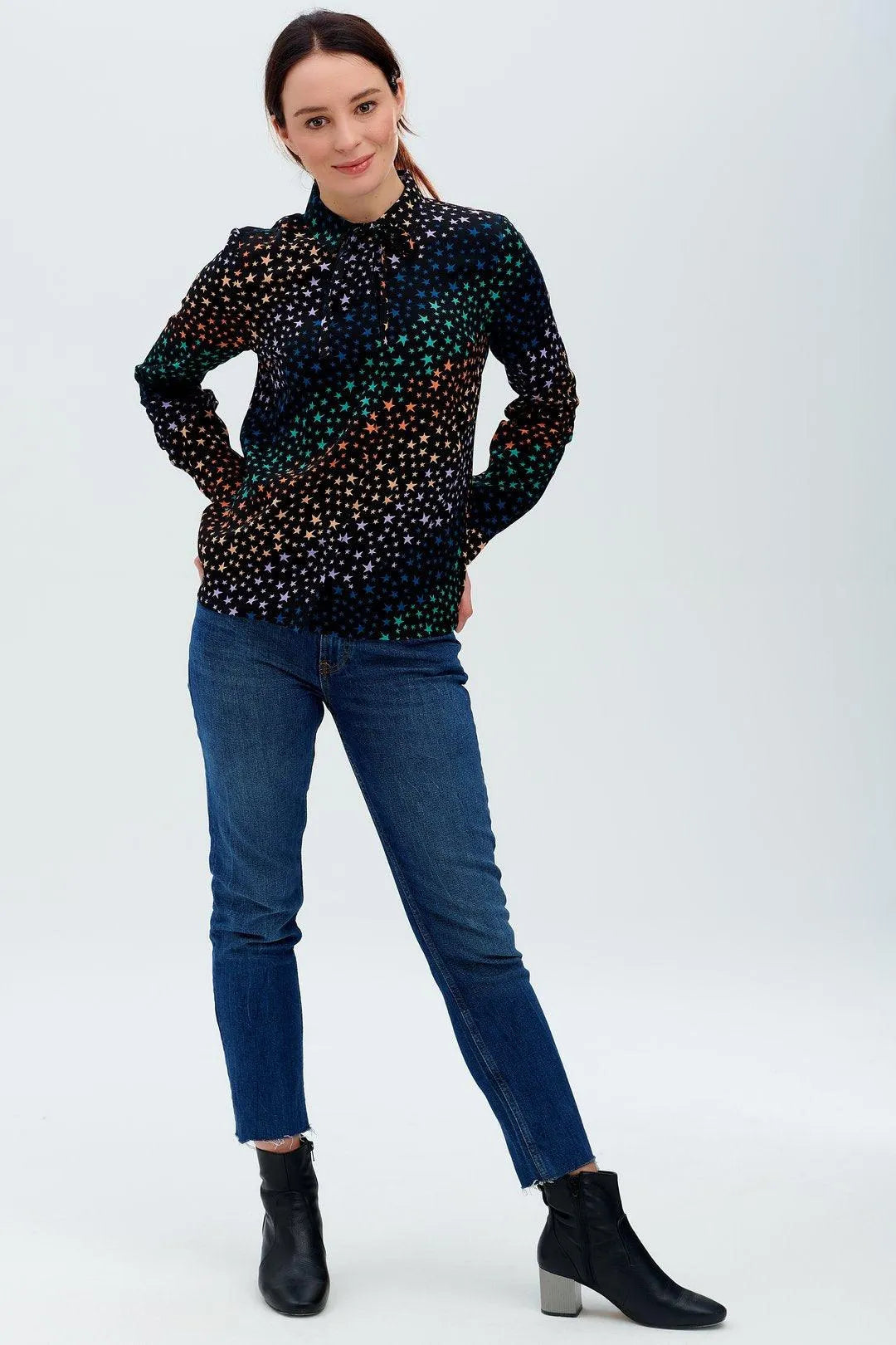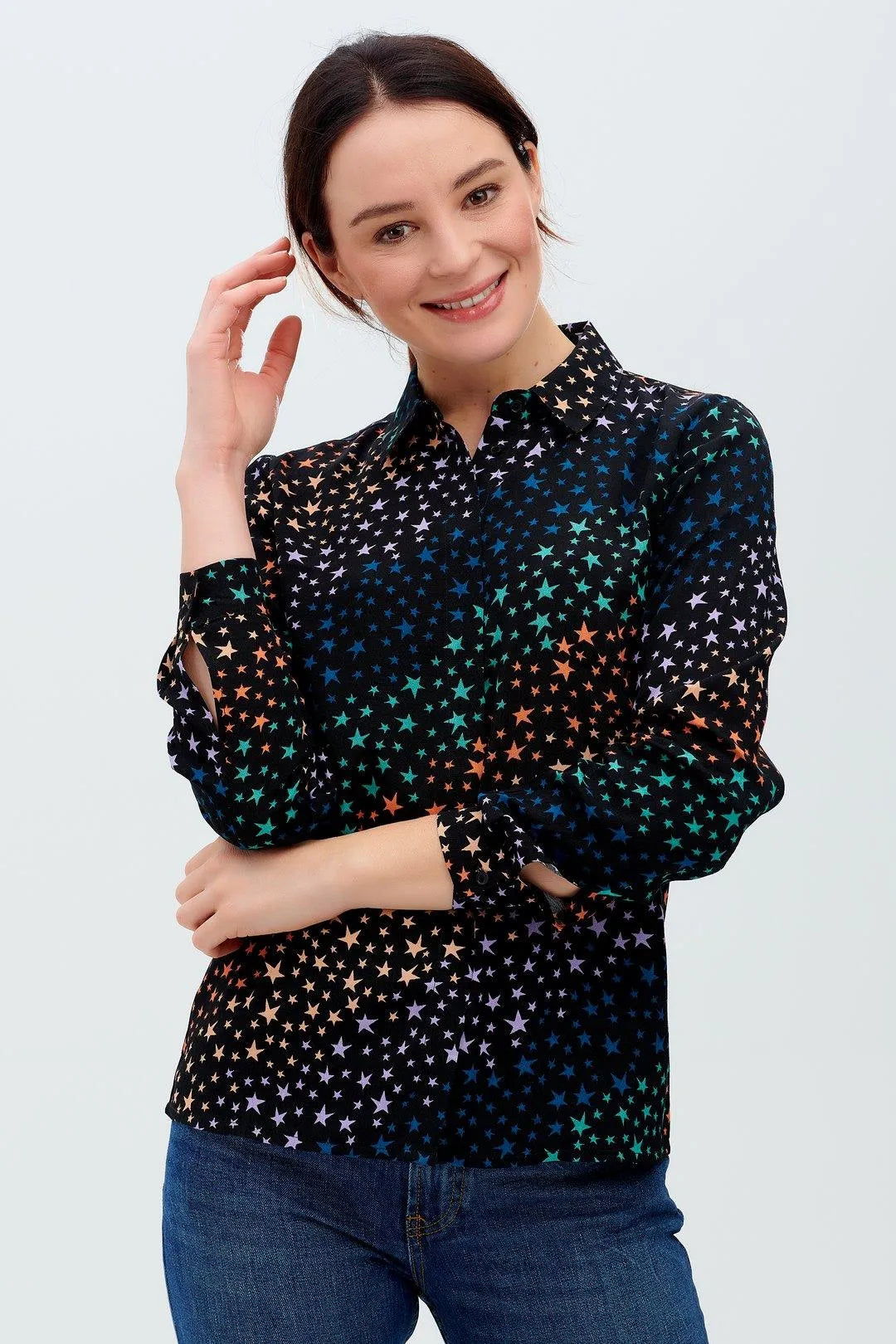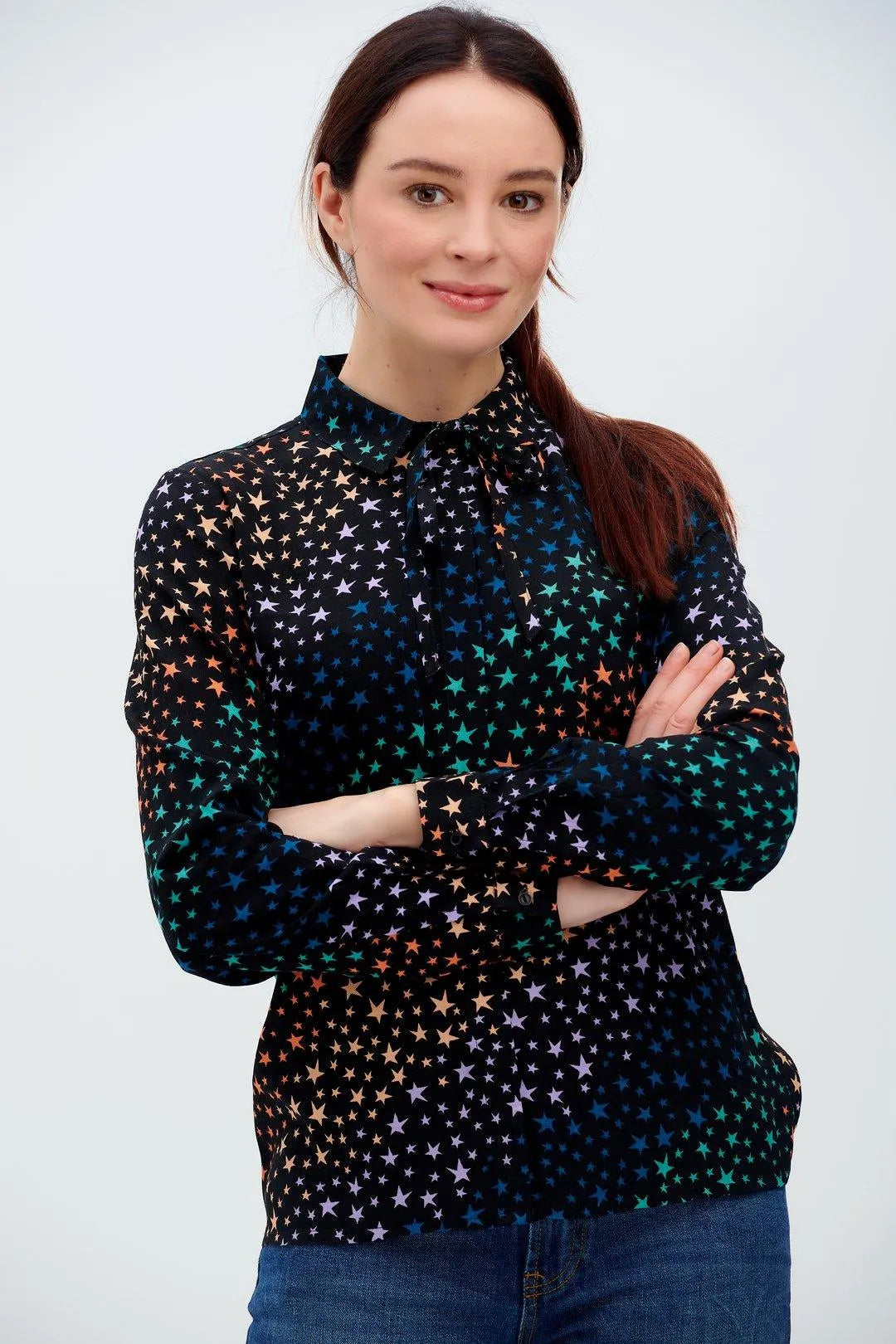 Una camisa llamativa es clave para crear un armario cápsula. Usable todo el año, el Catrina presenta nuestro estampado de estrellas en tonos joya en colores dulces sobre una simple base negra. Además de un frente de botón funcional oculto, el Catrina viene completo con una corbata extraíble, lo que le da un ambiente de los 70. Retro, relajado y muy fácil de llevar.