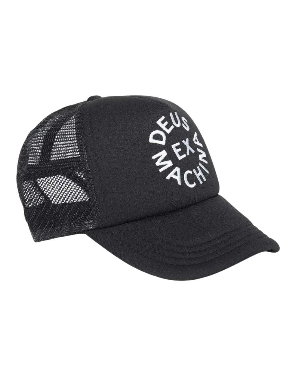 Esta gorra de camionero tiene paneles laterales de nailon / malla con un estampado de plastisol y un detalle de bordado de nuestro logotipo Deus Circle y un botón de presión de plástico en la parte posterior. Una talla le queda a la mayoría.