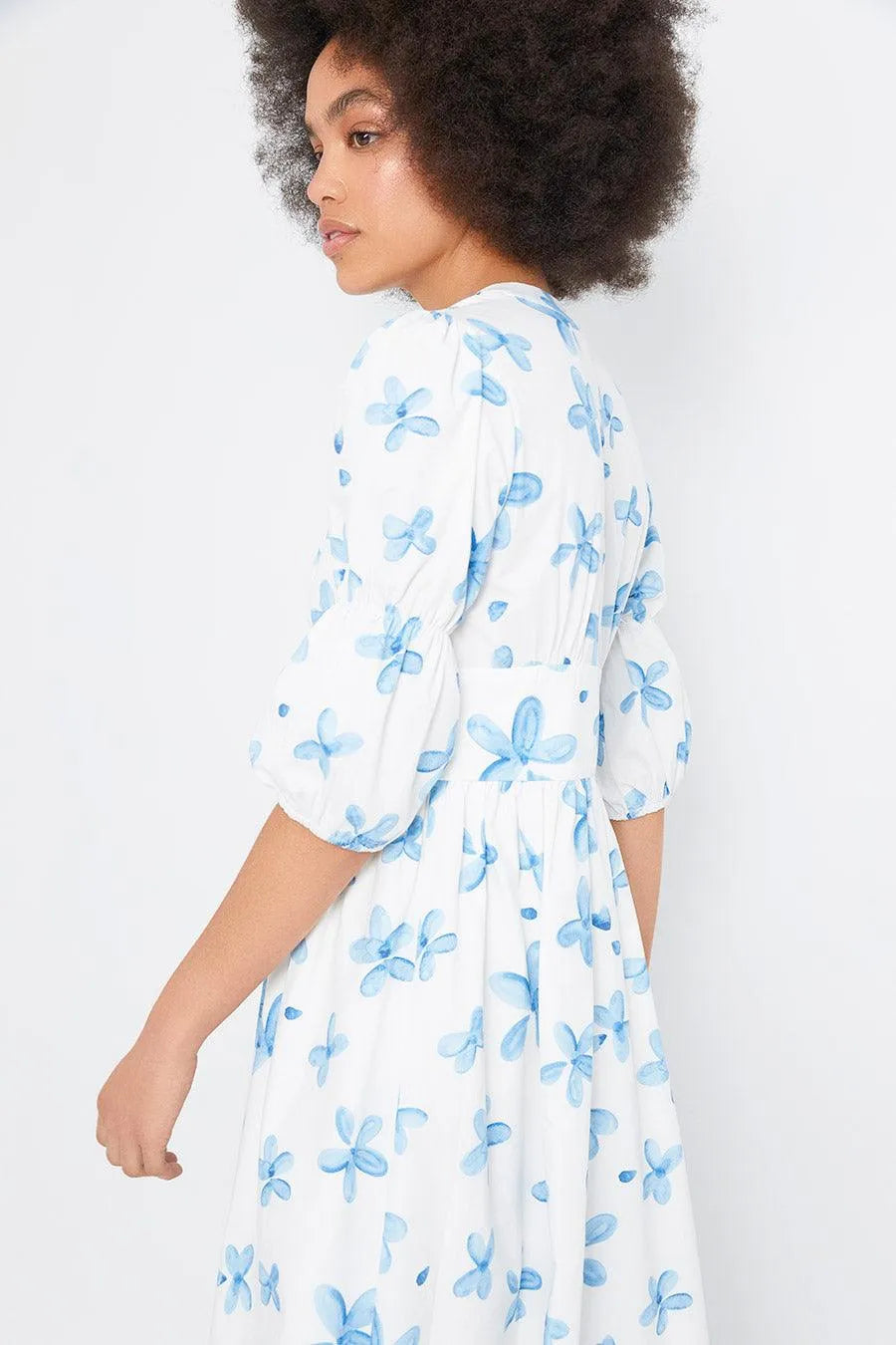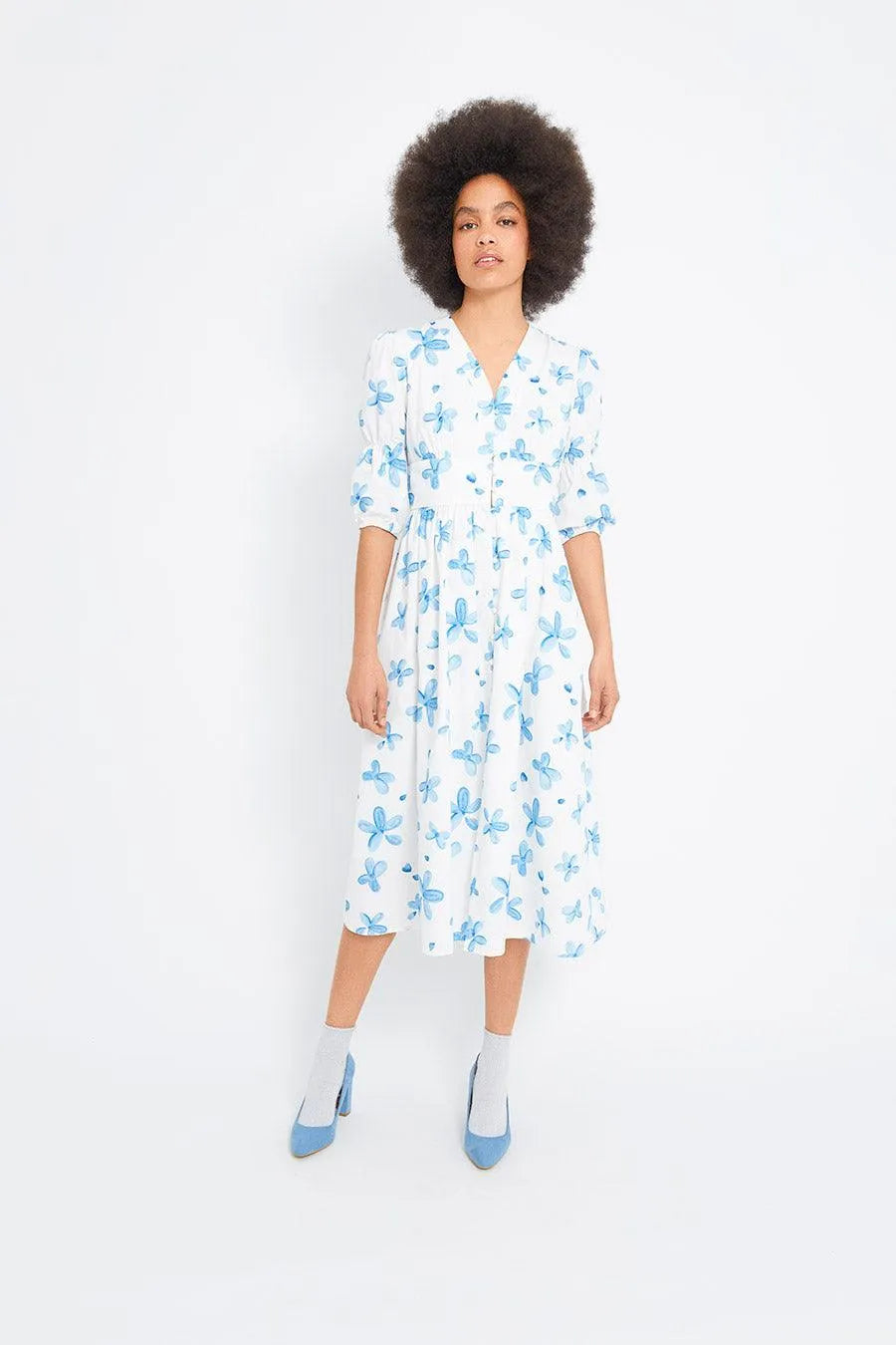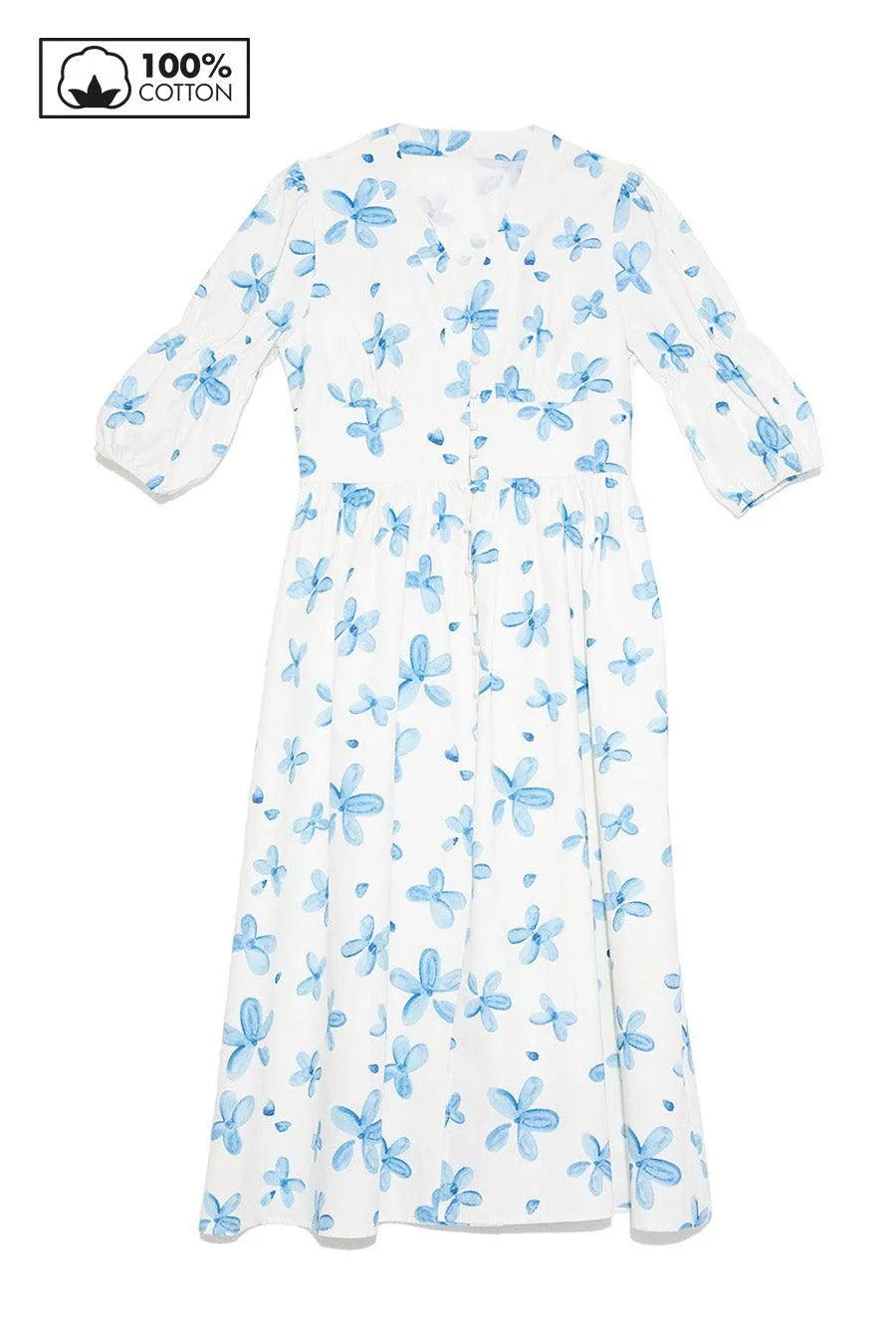 Vestido largo blanco con estampado de flores azules, cuello pico y manga tres cuartos.