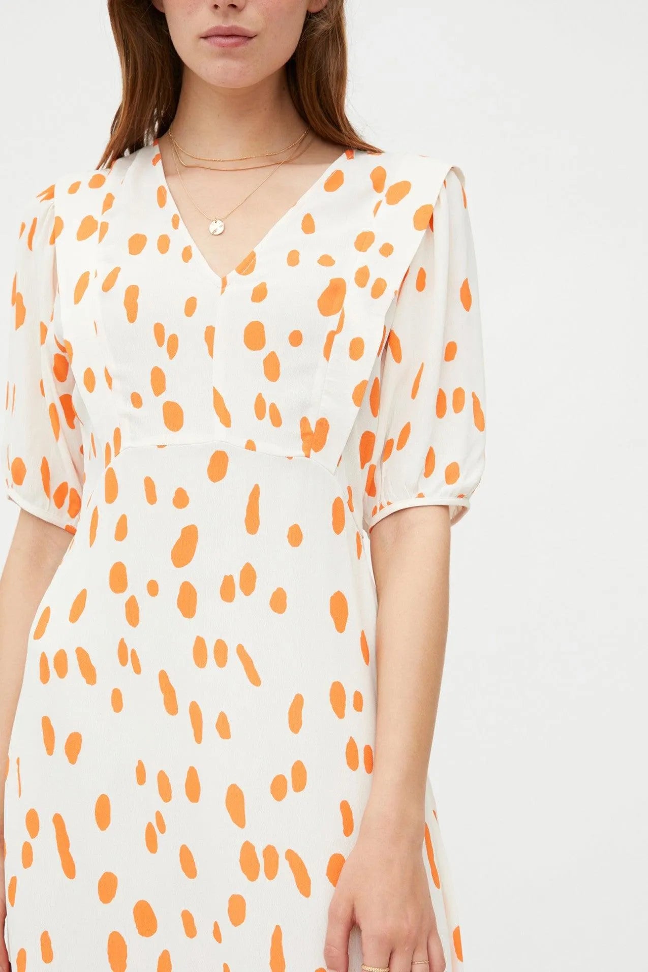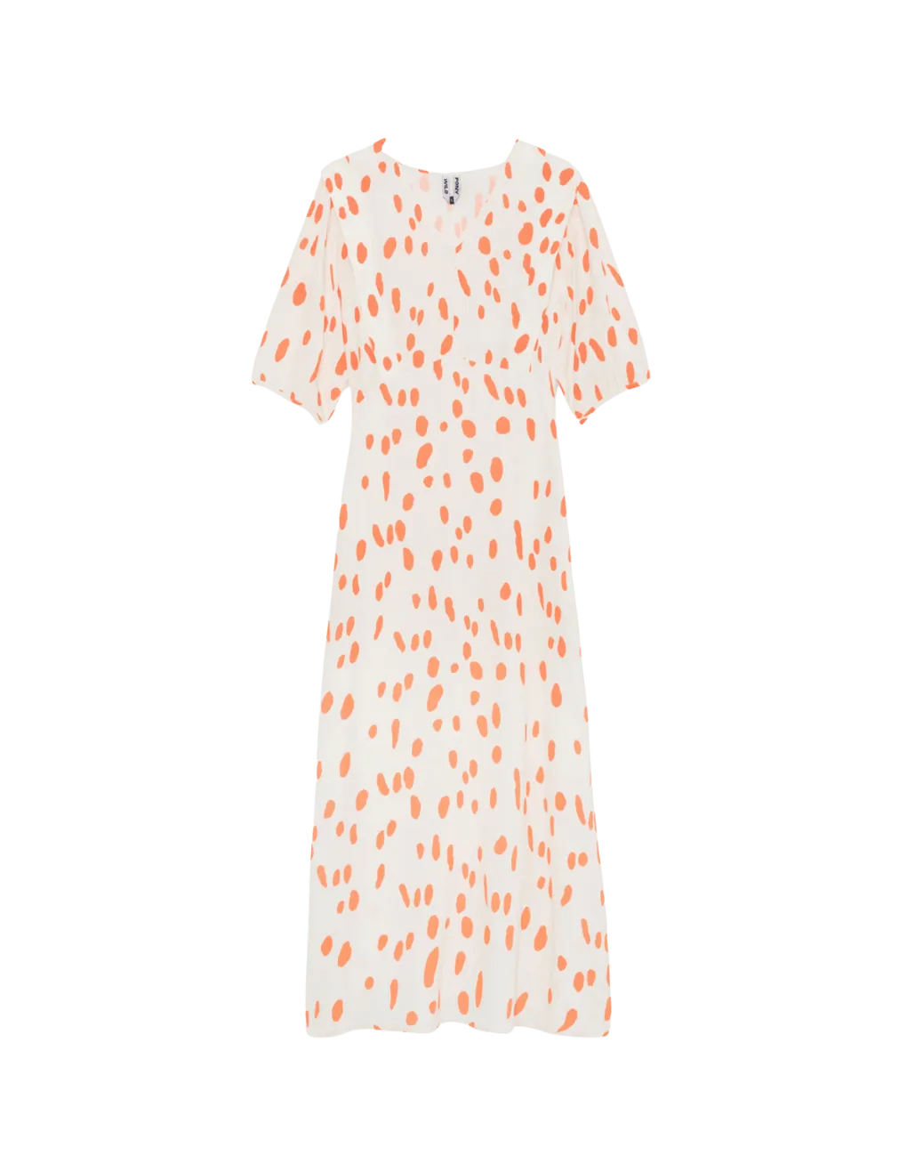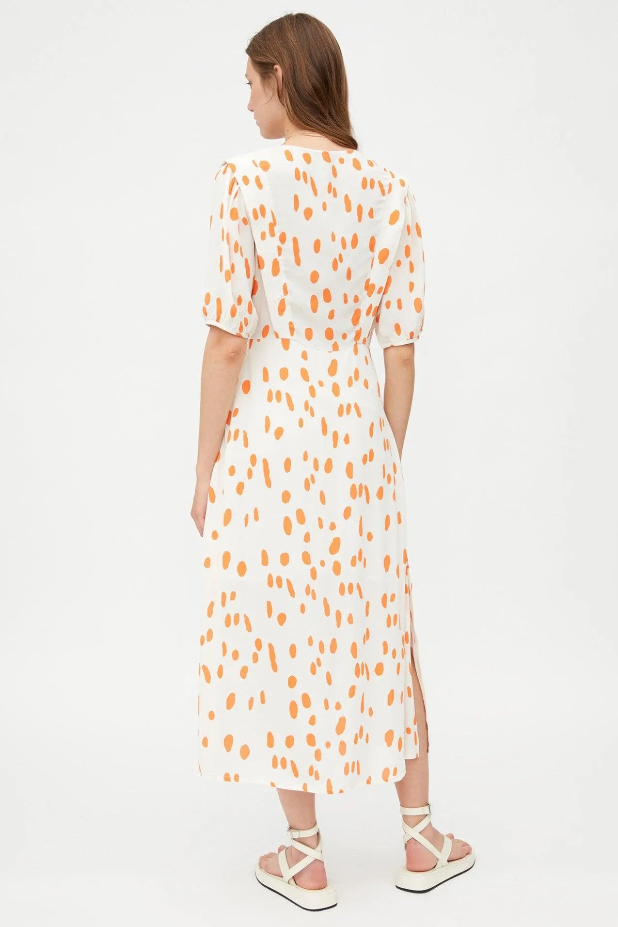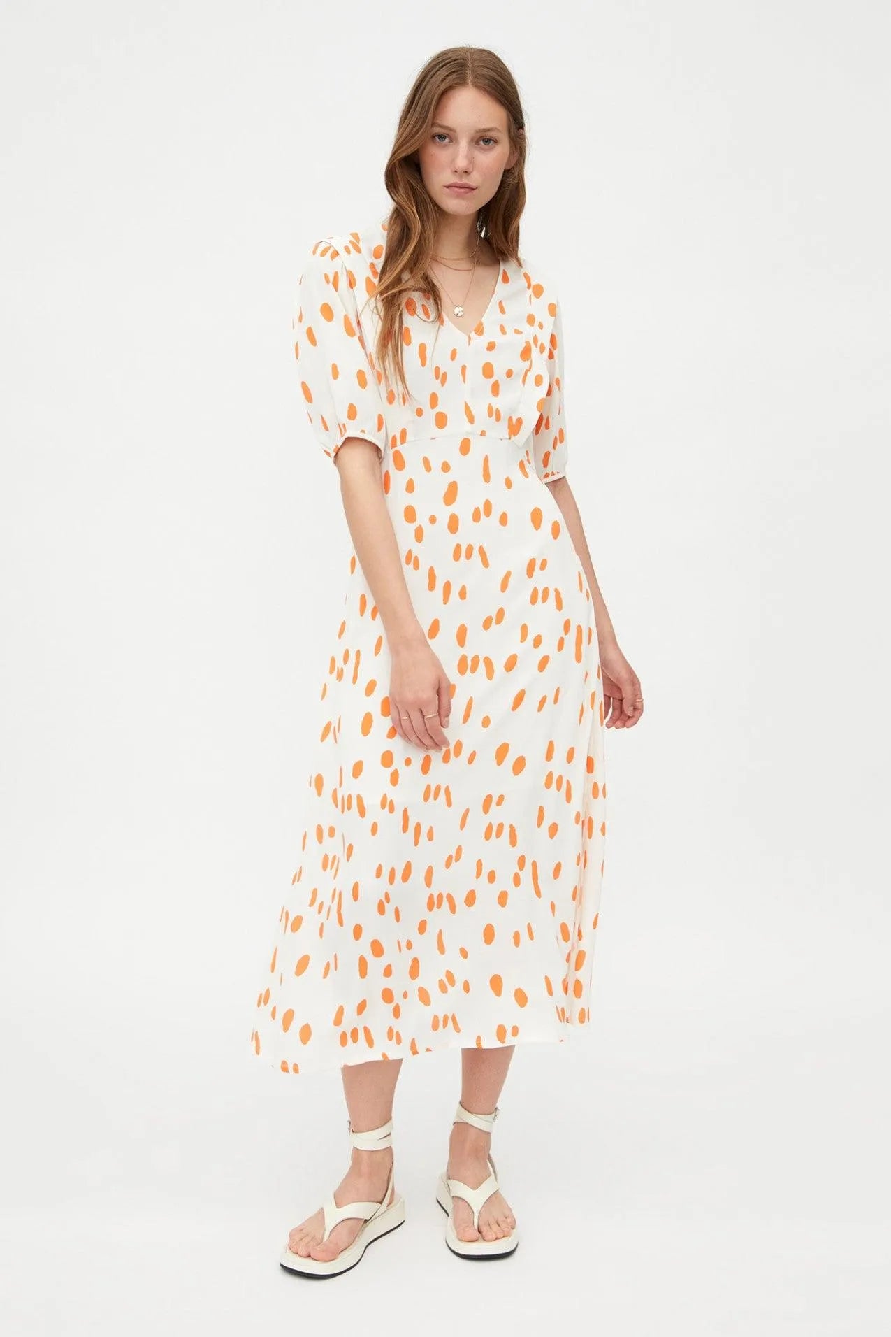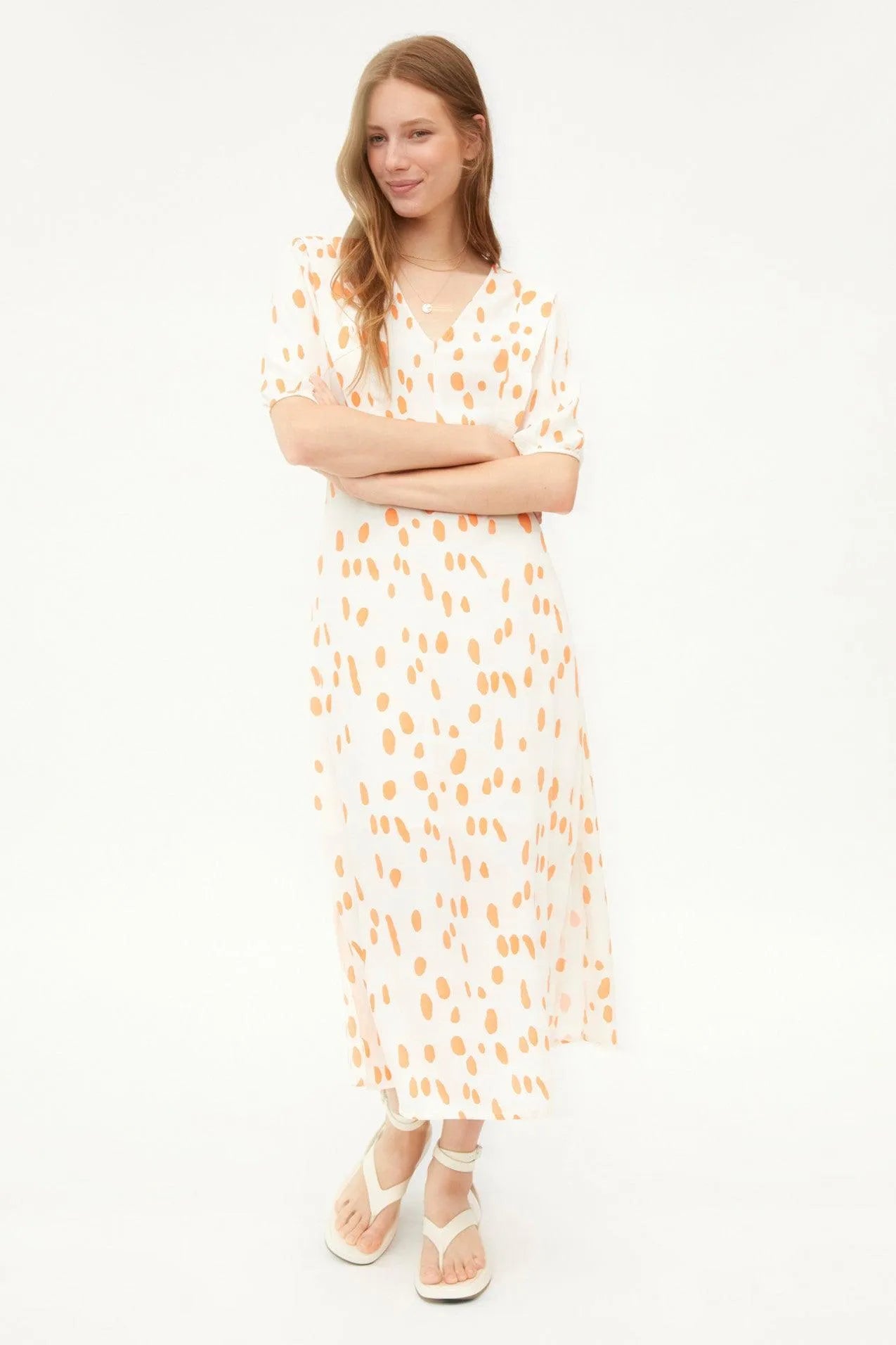 Vestido midi con estampado de lunares. Con escote pico y manga corta abullonada. Cierre lateral con cremallera oculta. Detalle frontal y trasero. La modelo mide 179 cm y lleva la talla S.
