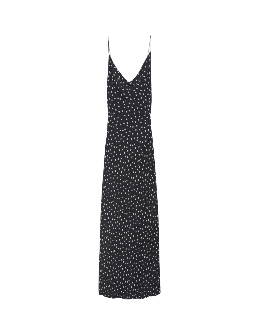 Vestido midi tipo lencero con estampado de lunares. Con escote abierto y tirantes finos. Cierre lateral con cremallera oculta. La modelo mide 179 cm y lleva la talla S.