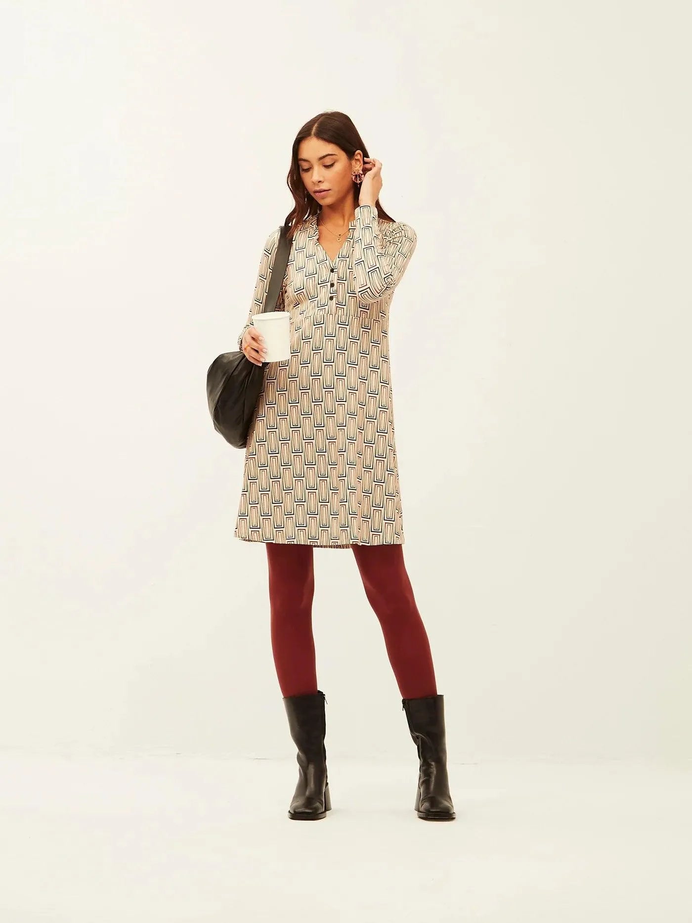 Vestido en estampado Off White Geometric Lines. Modelo de corte evasé y Manga Larga.
