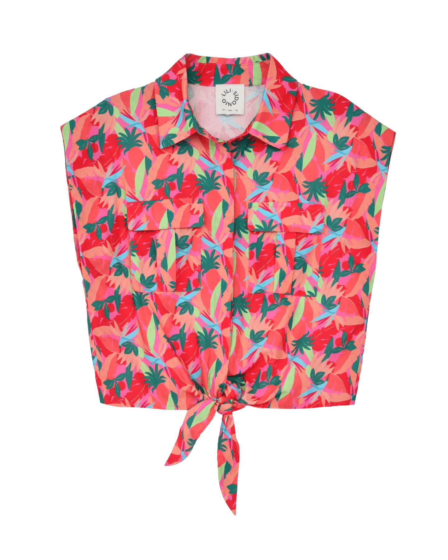 Camisa de manga corta de mariposa, bolsillos frontales y lazada ajustable en el bajo. Modelo con estampado gráfico.
