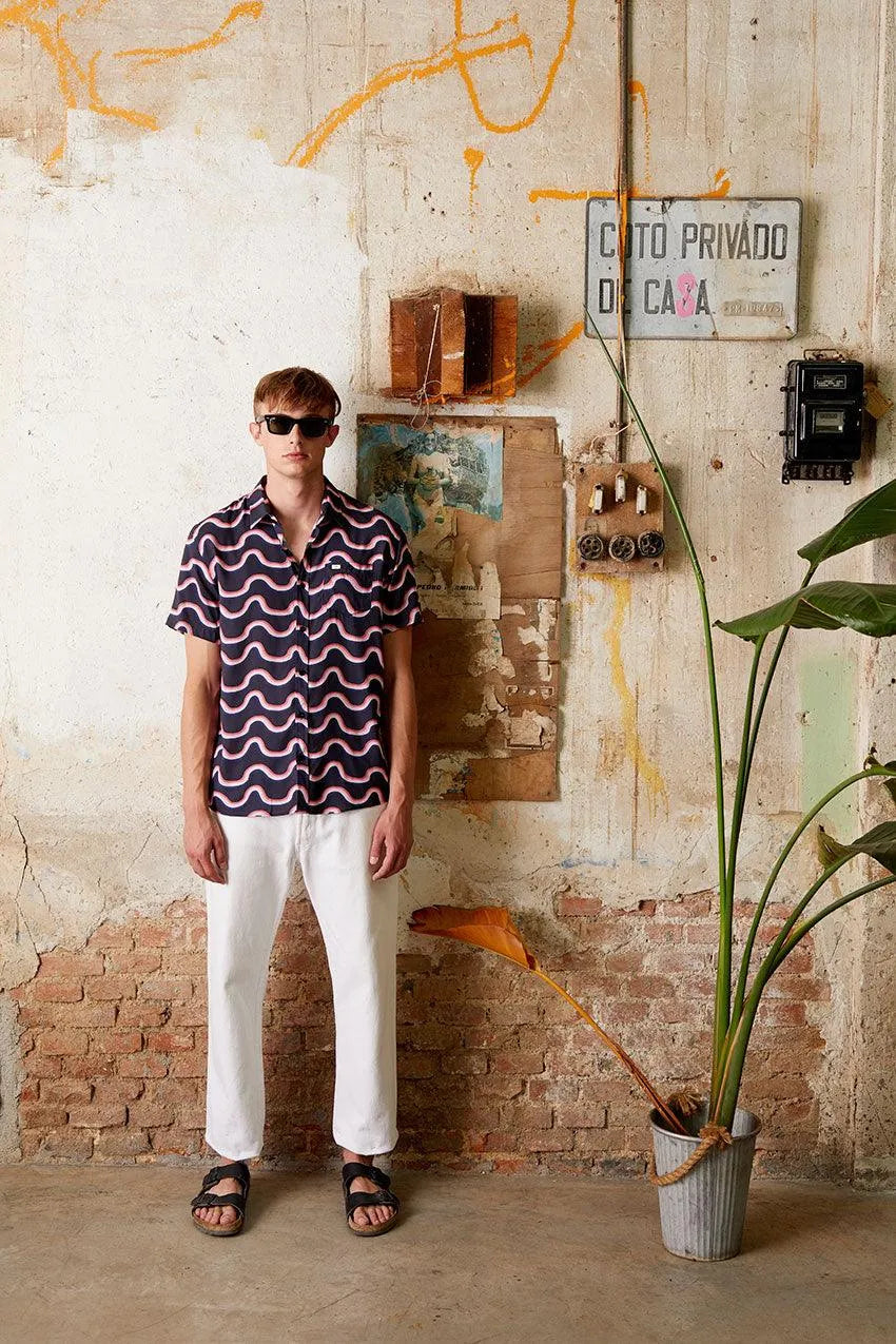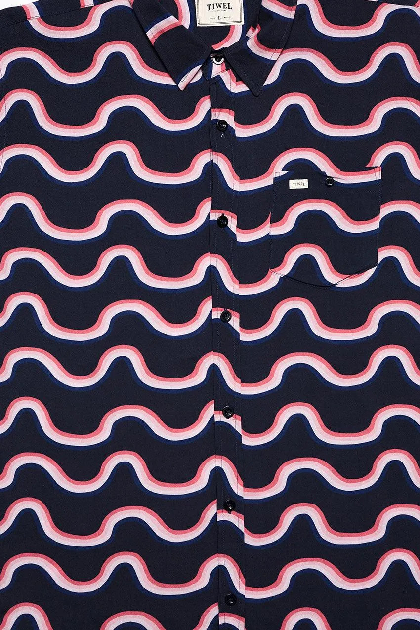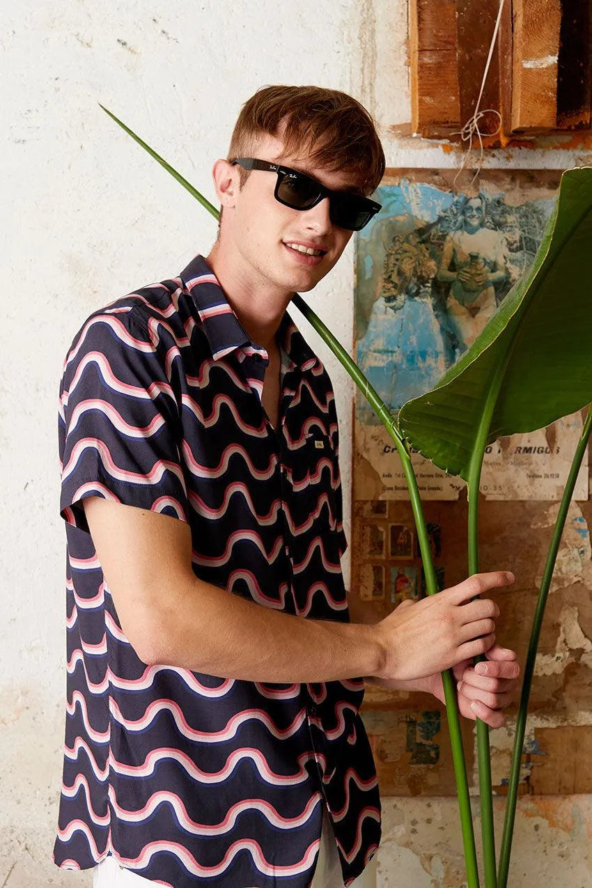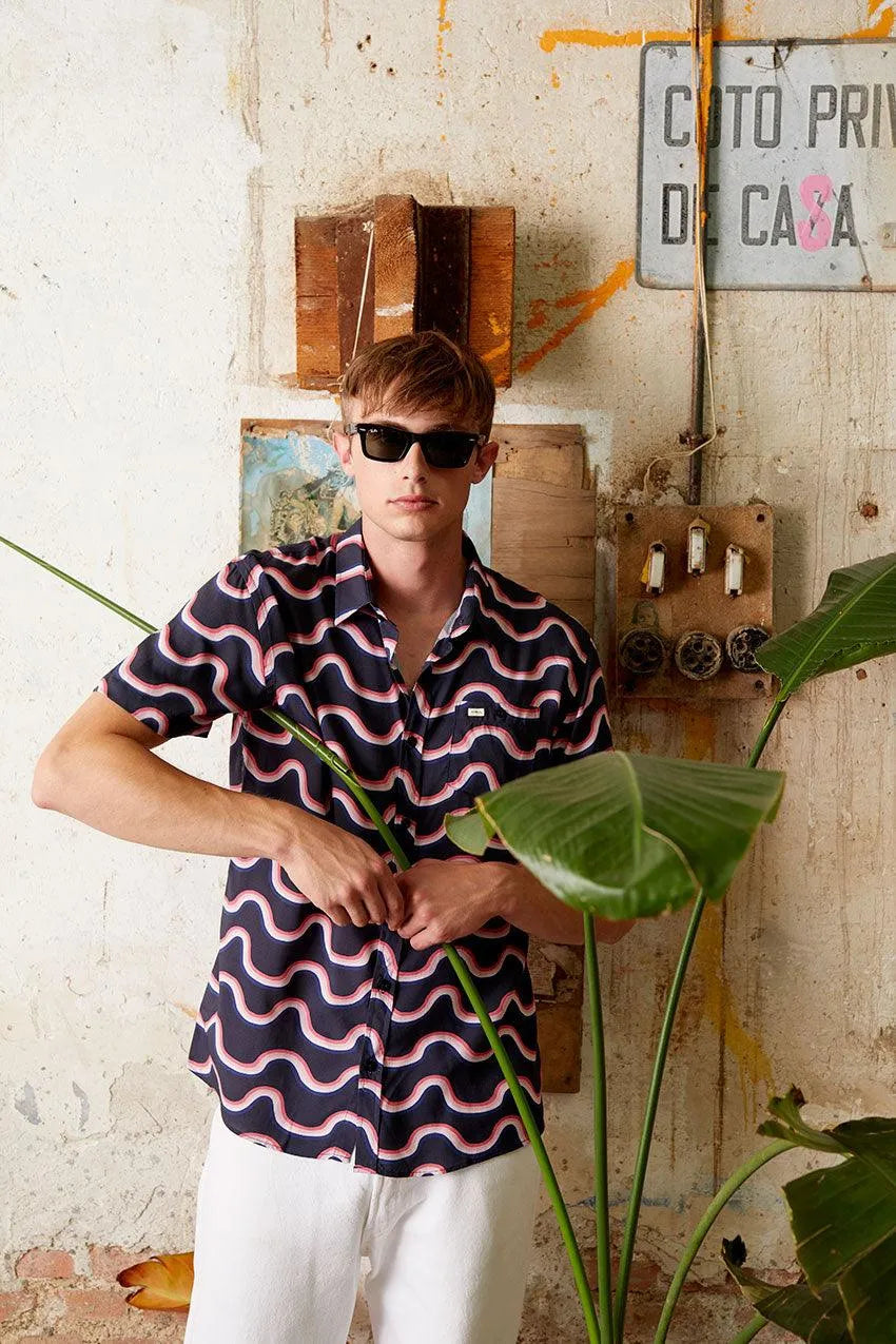Camisa Waver de manga corta 100% Soft viscose con decoración y estampado all-over-print estilo olas, diseñada para la nueva colección spring-summer “Lucky Blue”. Botones frontales a juego. Bolsillo frontal en el pecho y etiqueta con el logo de Tiwel en manga izquierda y ajuste básico.
