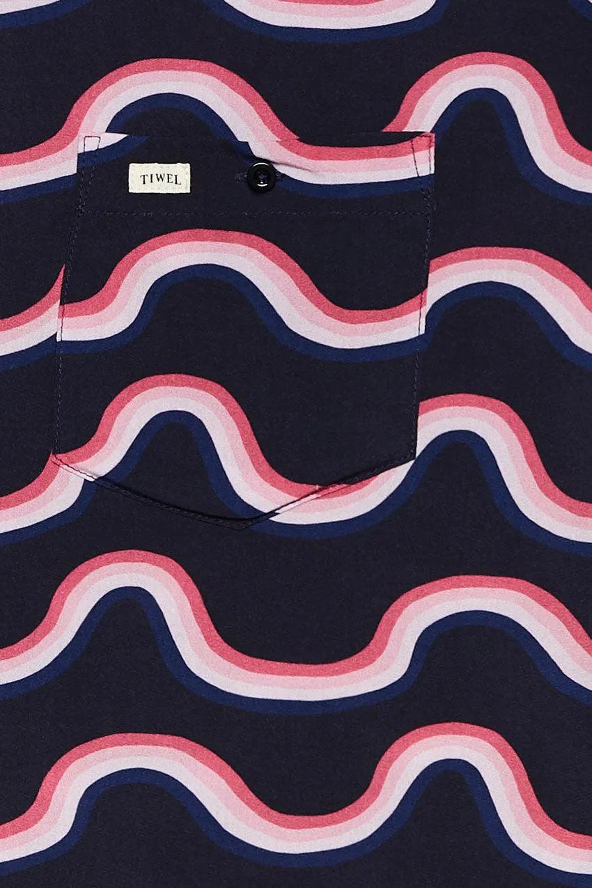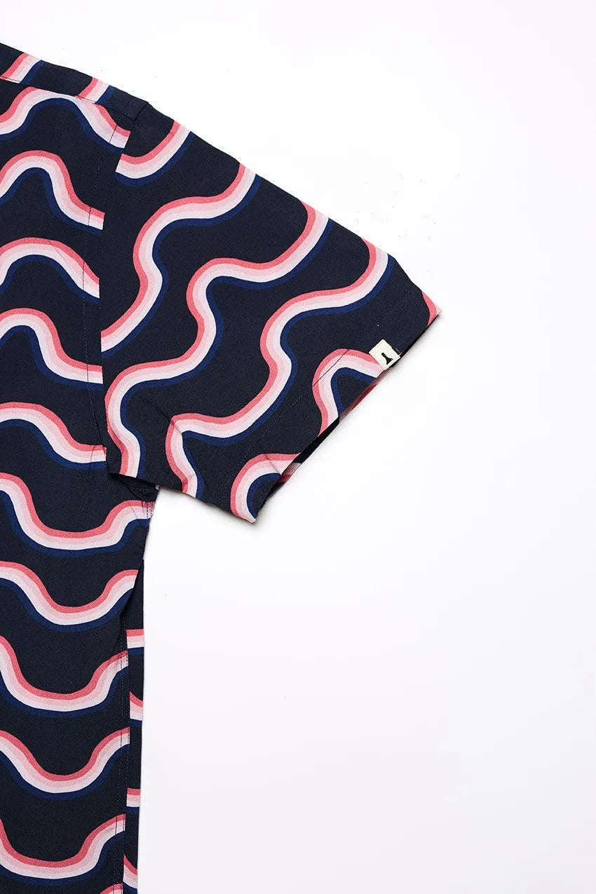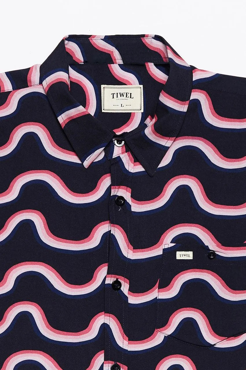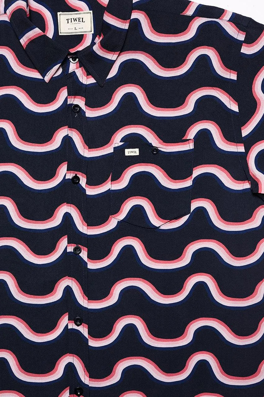 Camisa Waver de manga corta 100% Soft viscose con decoración y estampado all-over-print estilo olas, diseñada para la nueva colección spring-summer “Lucky Blue”. Botones frontales a juego. Bolsillo frontal en el pecho y etiqueta con el logo de Tiwel en manga izquierda y ajuste básico.