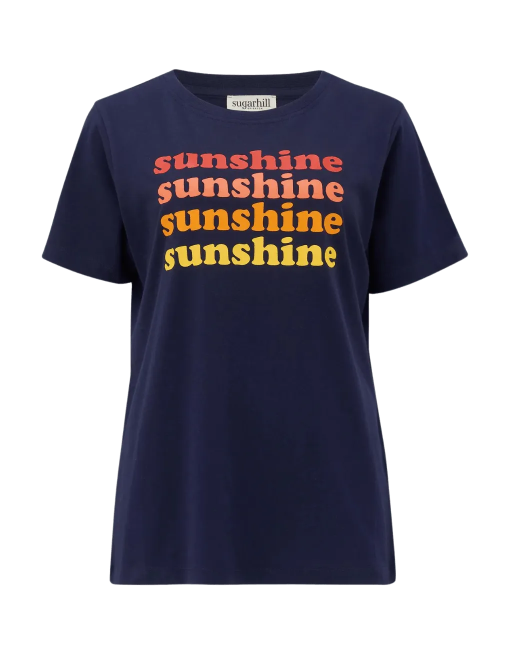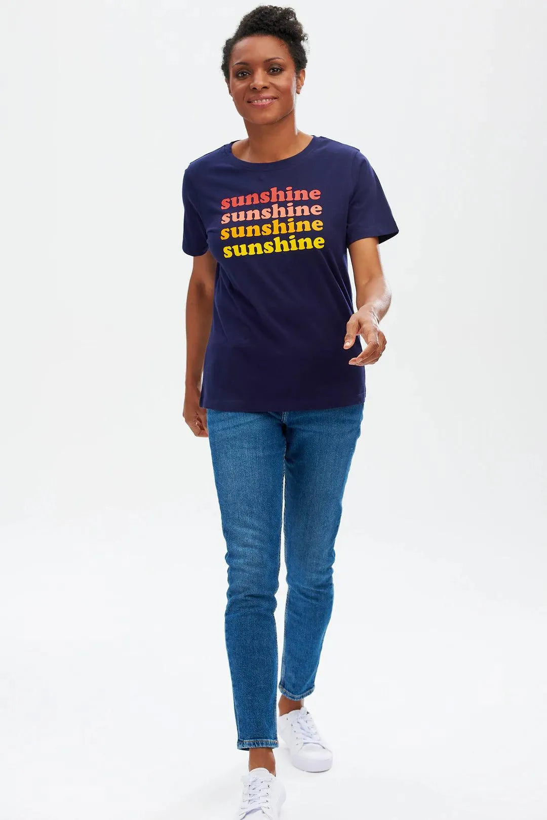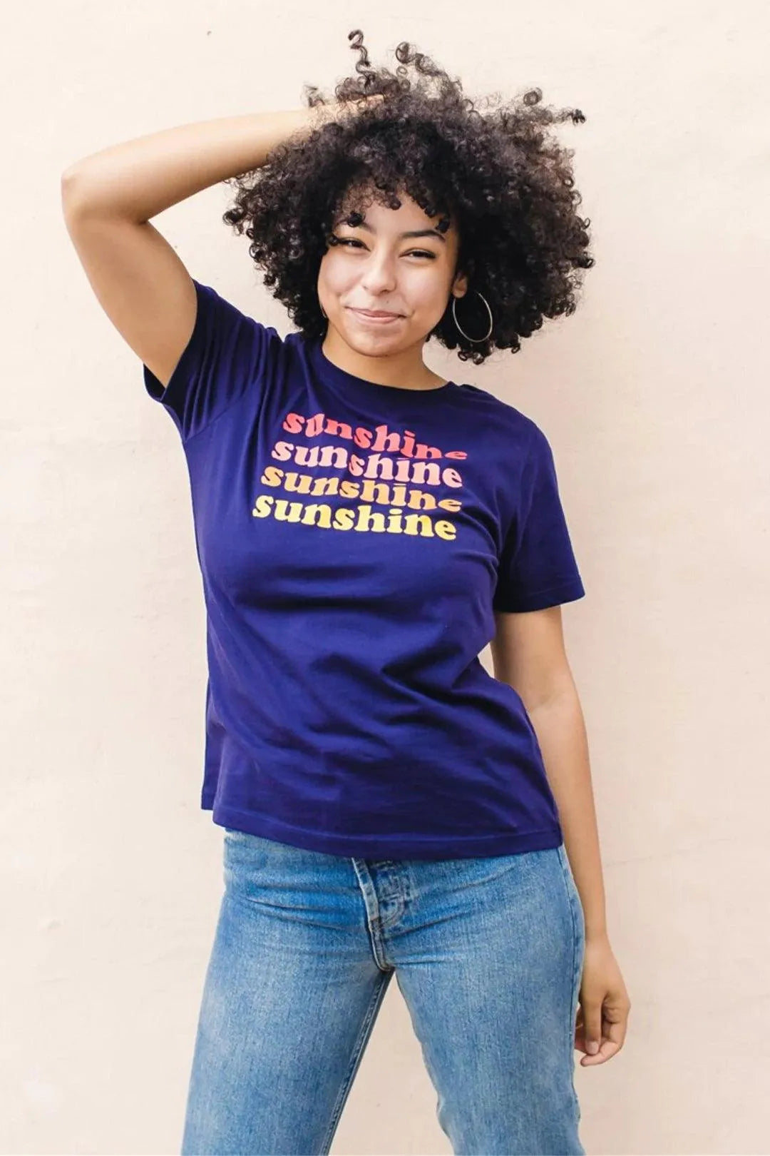Hemos actualizado la forma de nuestra camiseta exclusiva, la Maggie tiene costuras laterales rectas y espalda recta para un ajuste clásico. El diseño de sol vibrante tiene un eslogan retro en el frente sobre una base amarilla tenue. Hecha de 100% algodón orgánico, esta camiseta es muy especial.