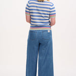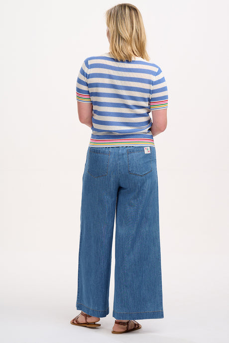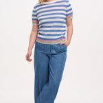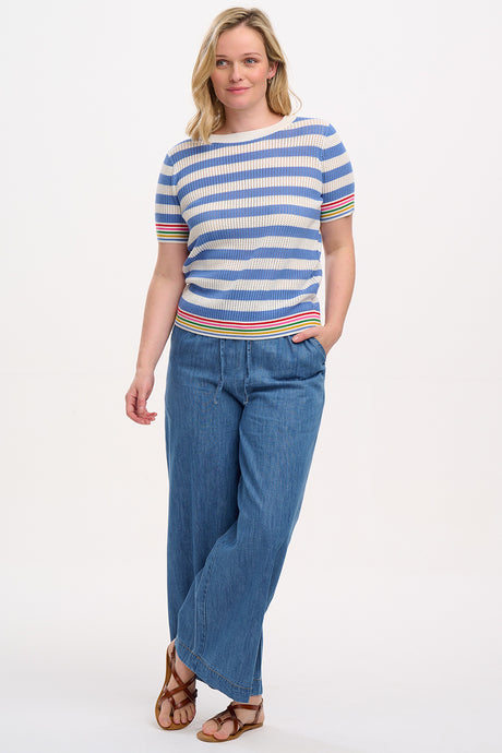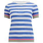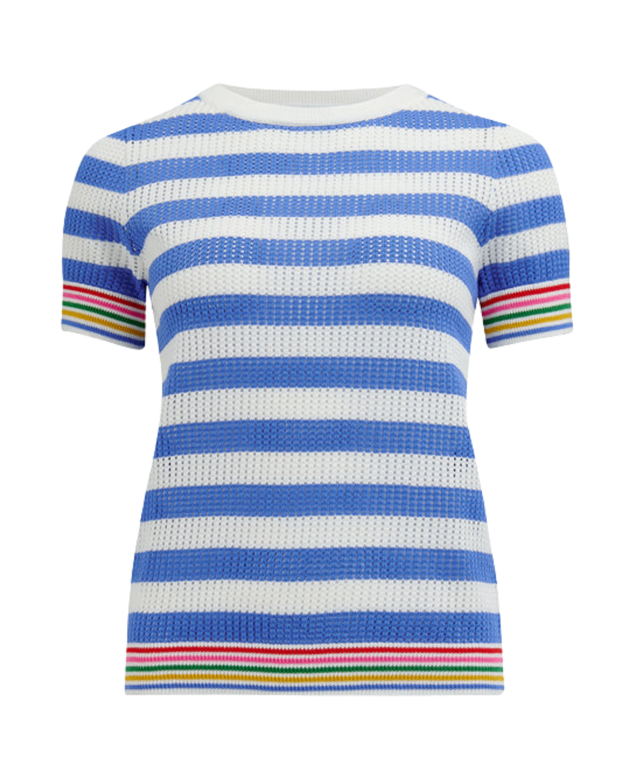 El top de punto Arden es un nuevo estilo para 2025. Una camiseta de manga corta con cuello redondo, la Arden está tejida con un intrincado estilo de ganchillo. Con rayas azules y blancas y puños y dobladillo en arco iris.