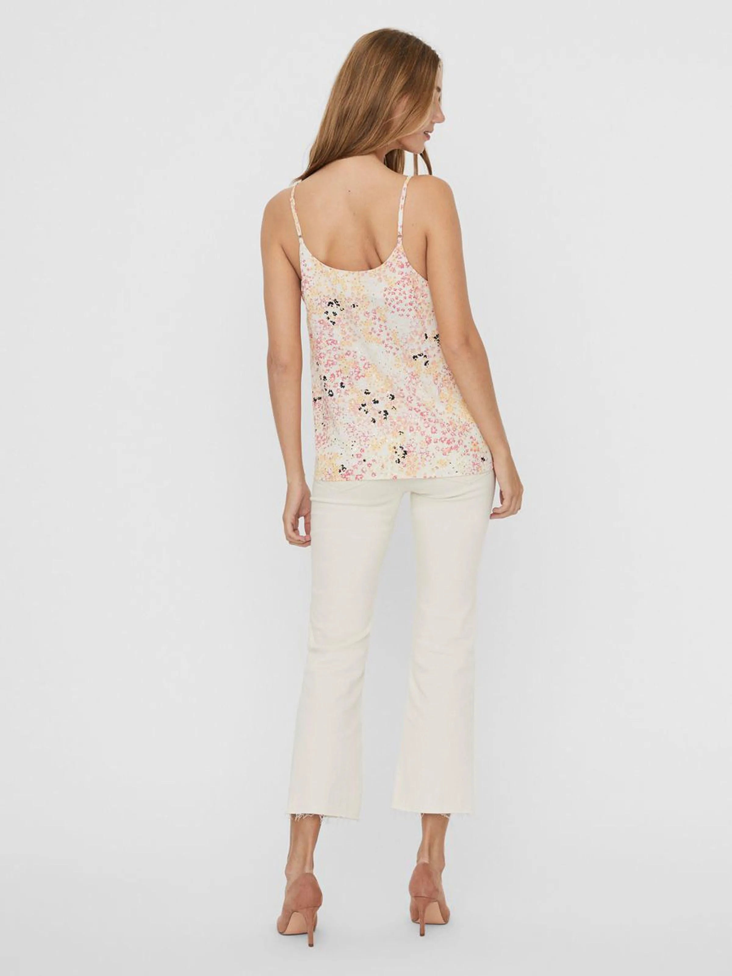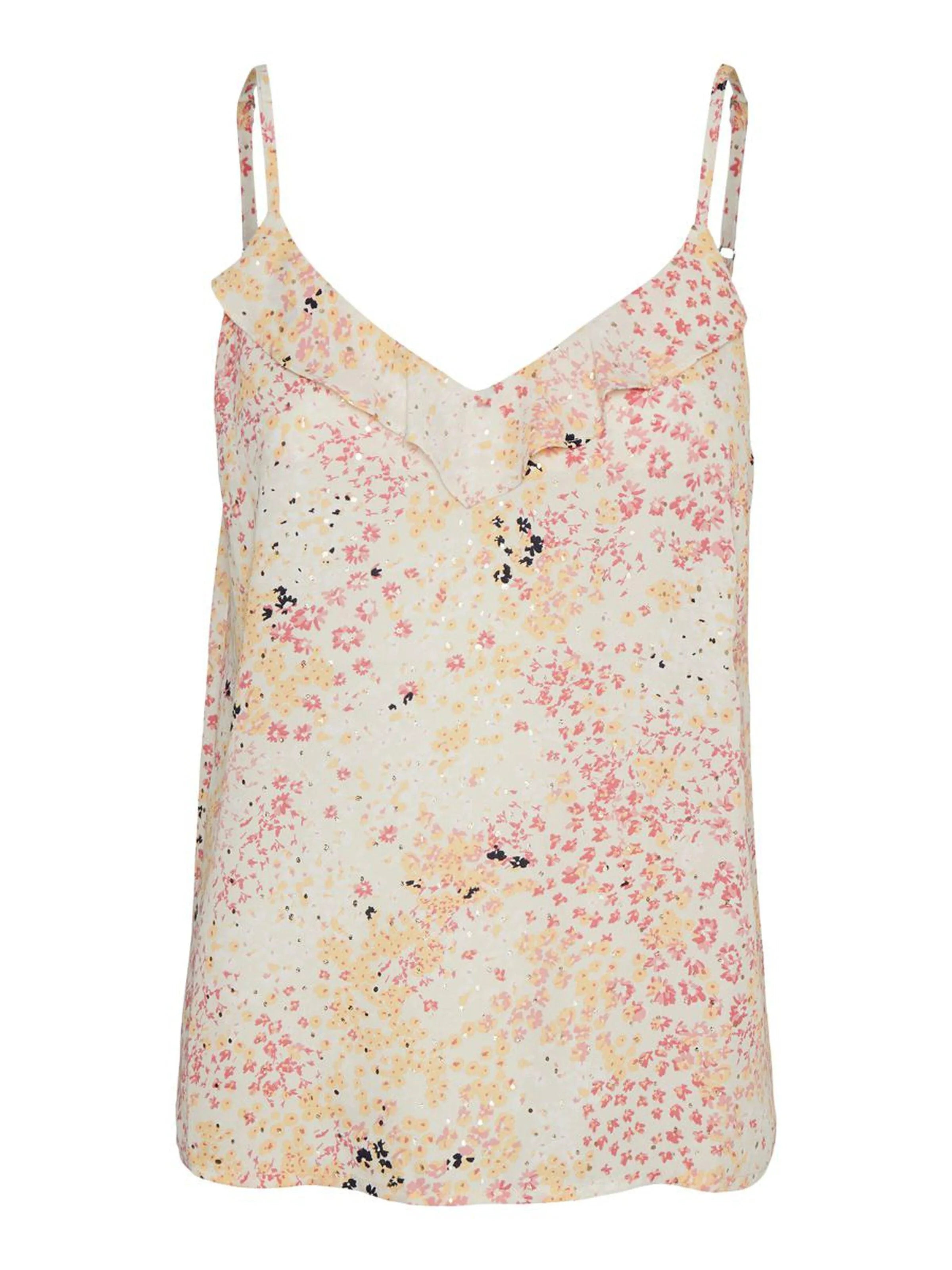 Top estampado con detalles de volantes y tirantes ajustables. La tapa está hecha de un material suave y ligero. Úselo con un par de pantalones cortos de mezclilla en el verano.