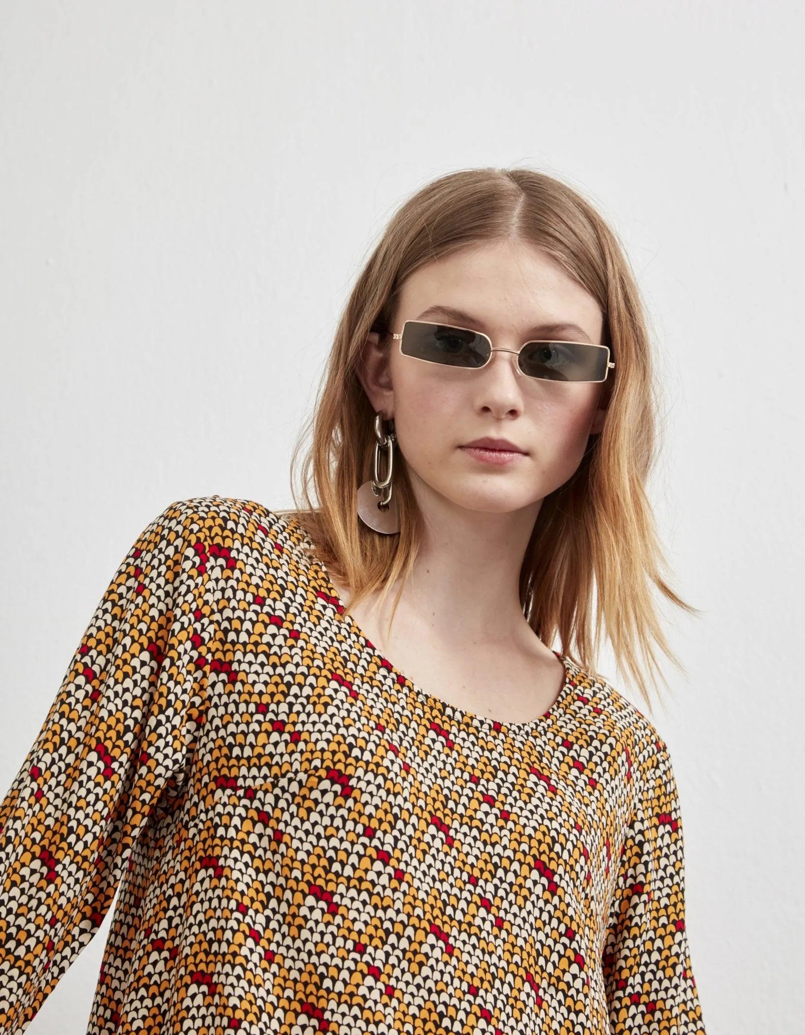 Modelo de corte recto, escote cuello redondo y manga larga.
