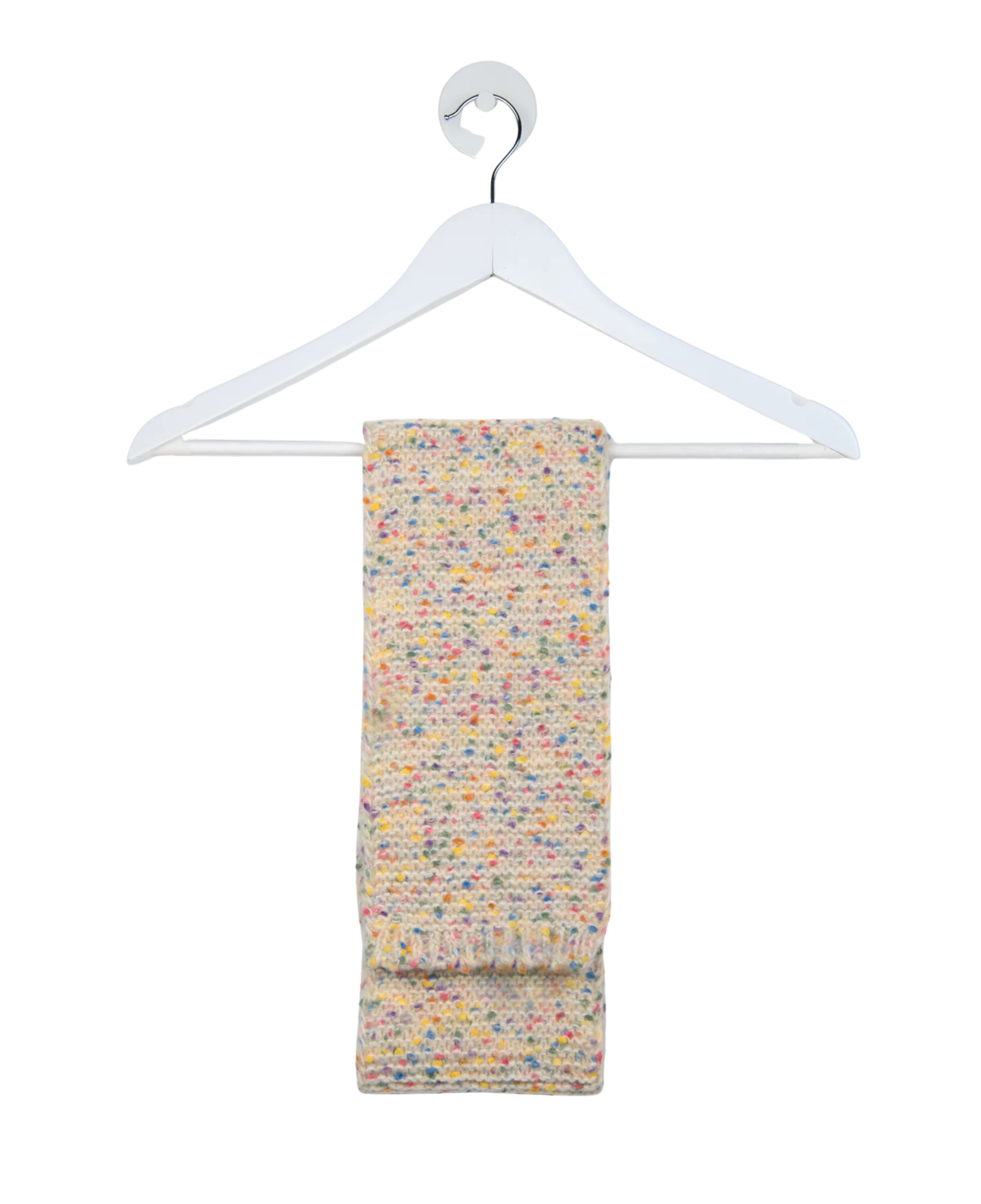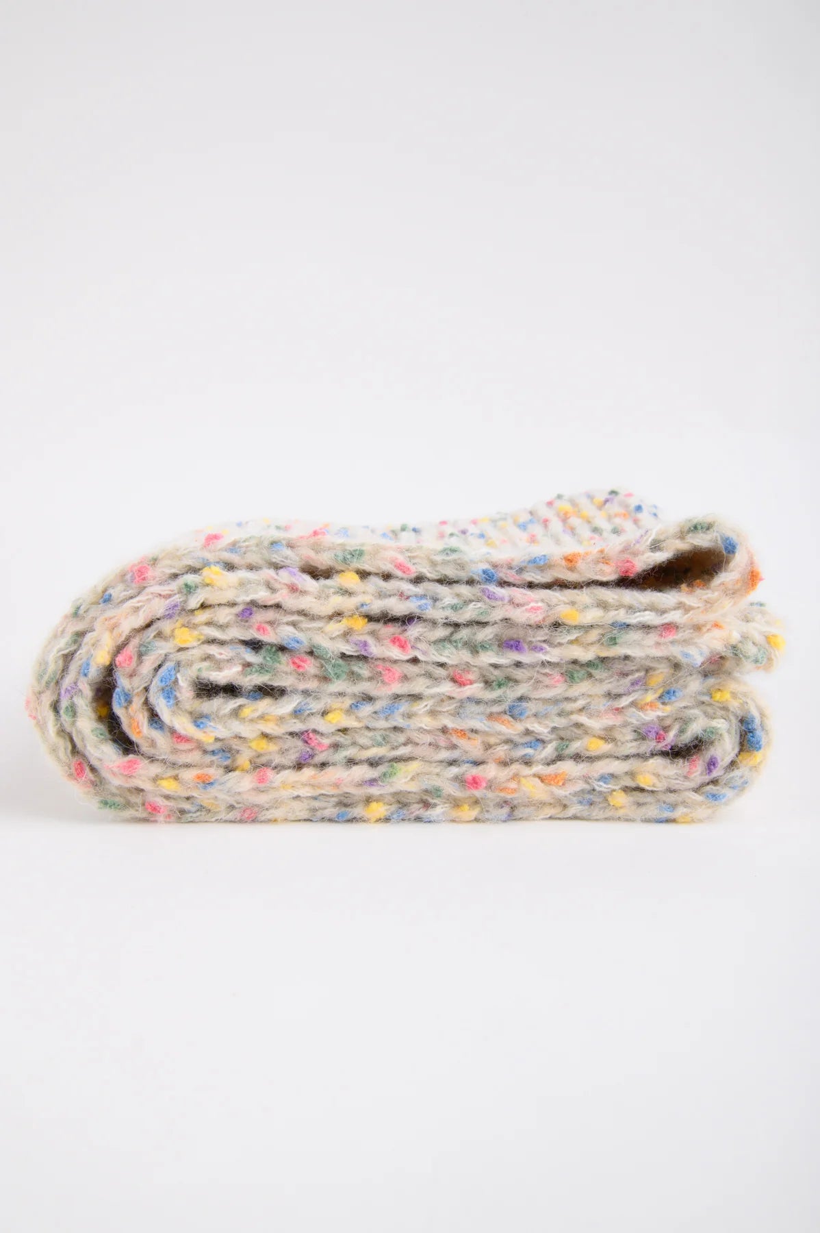 Esta bufanda de punto con efecto moteado multicolor es un accesorio alegre y versátil que aporta un toque único a tus looks de invierno. Tejida en hilo suave con base clara y detalles de colores vivos como rosa, azul, amarillo y verde, combina fácilmente con prendas neutras y destaca en cualquier conjunto.