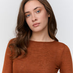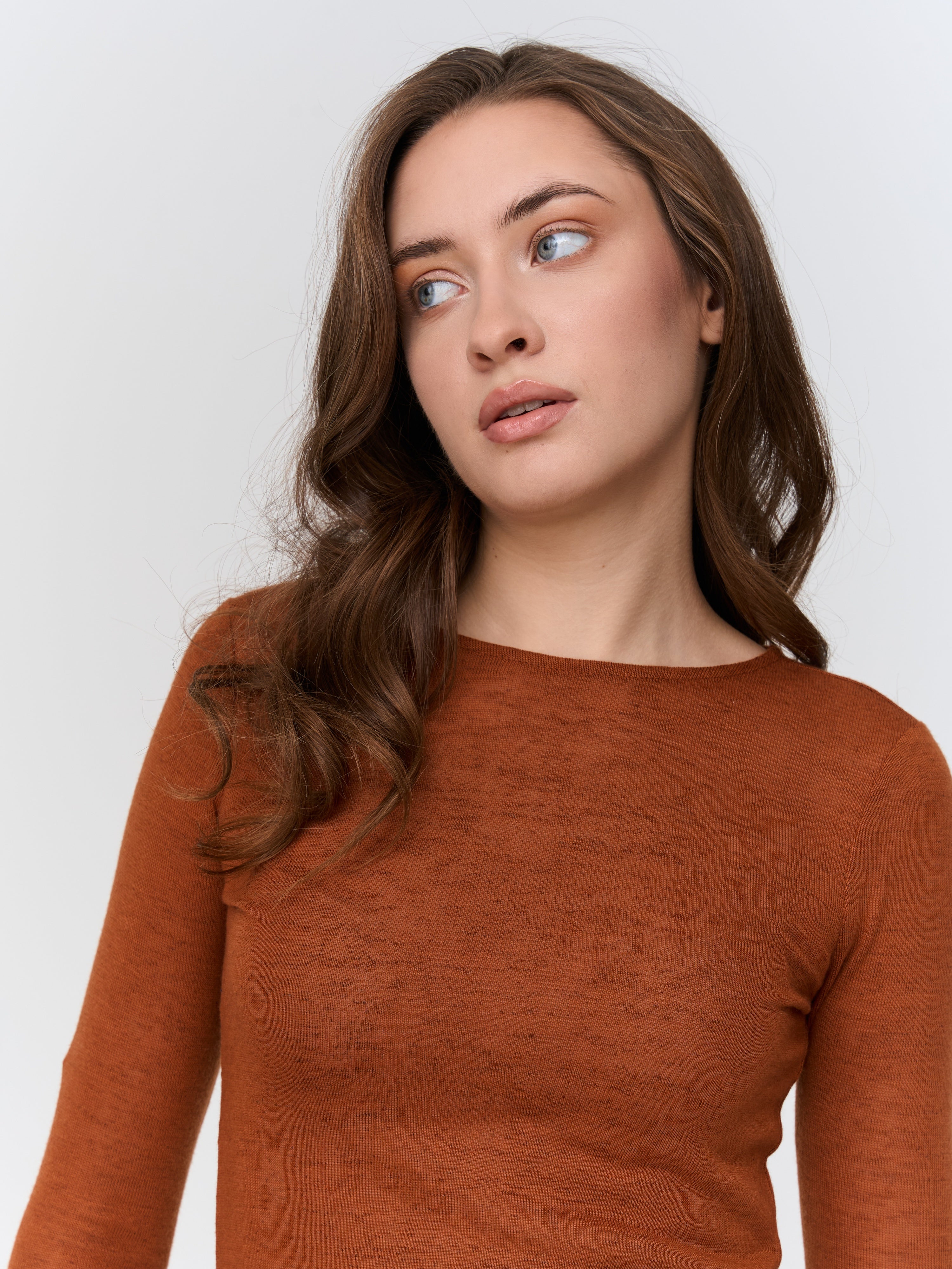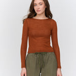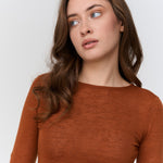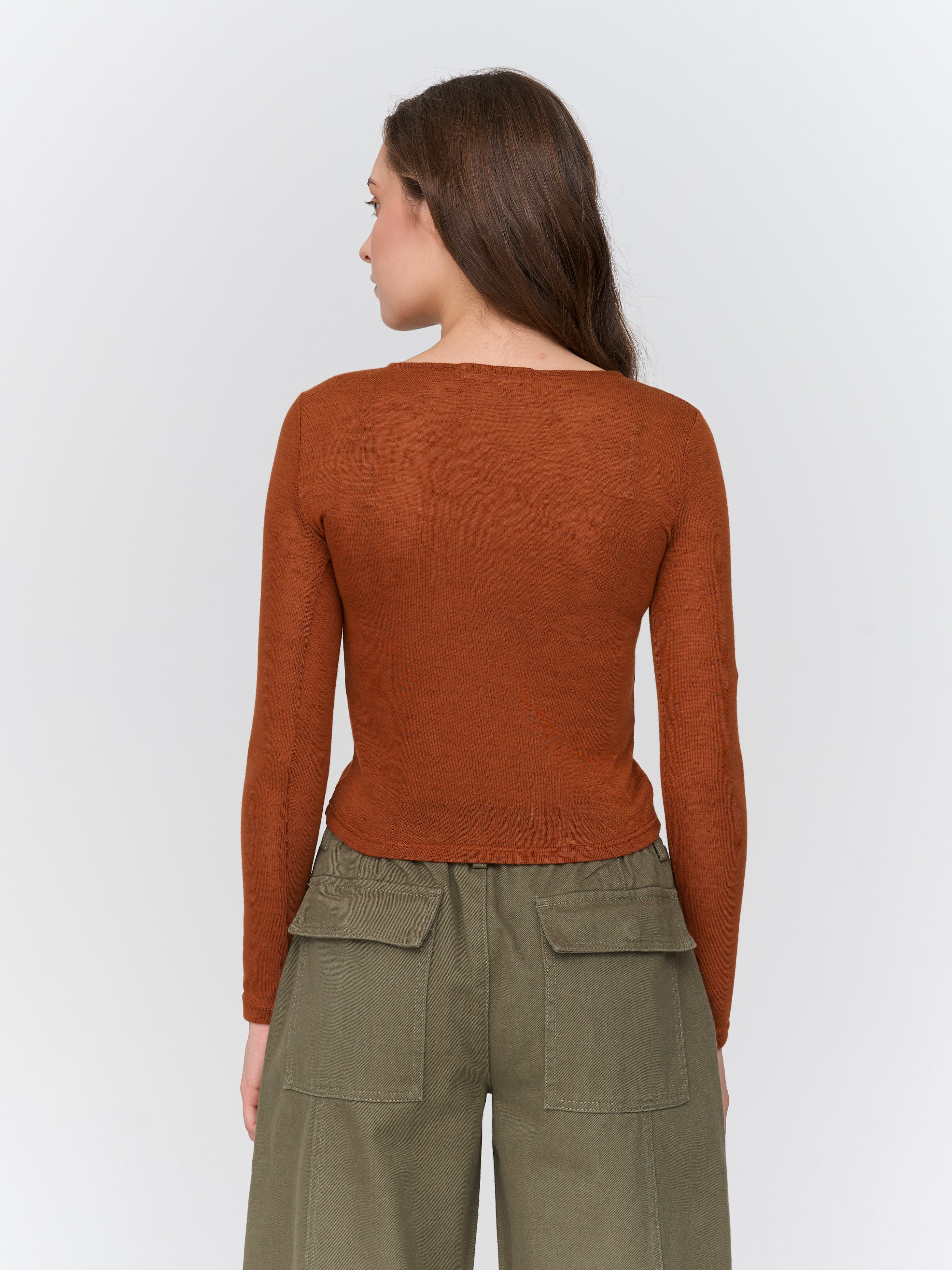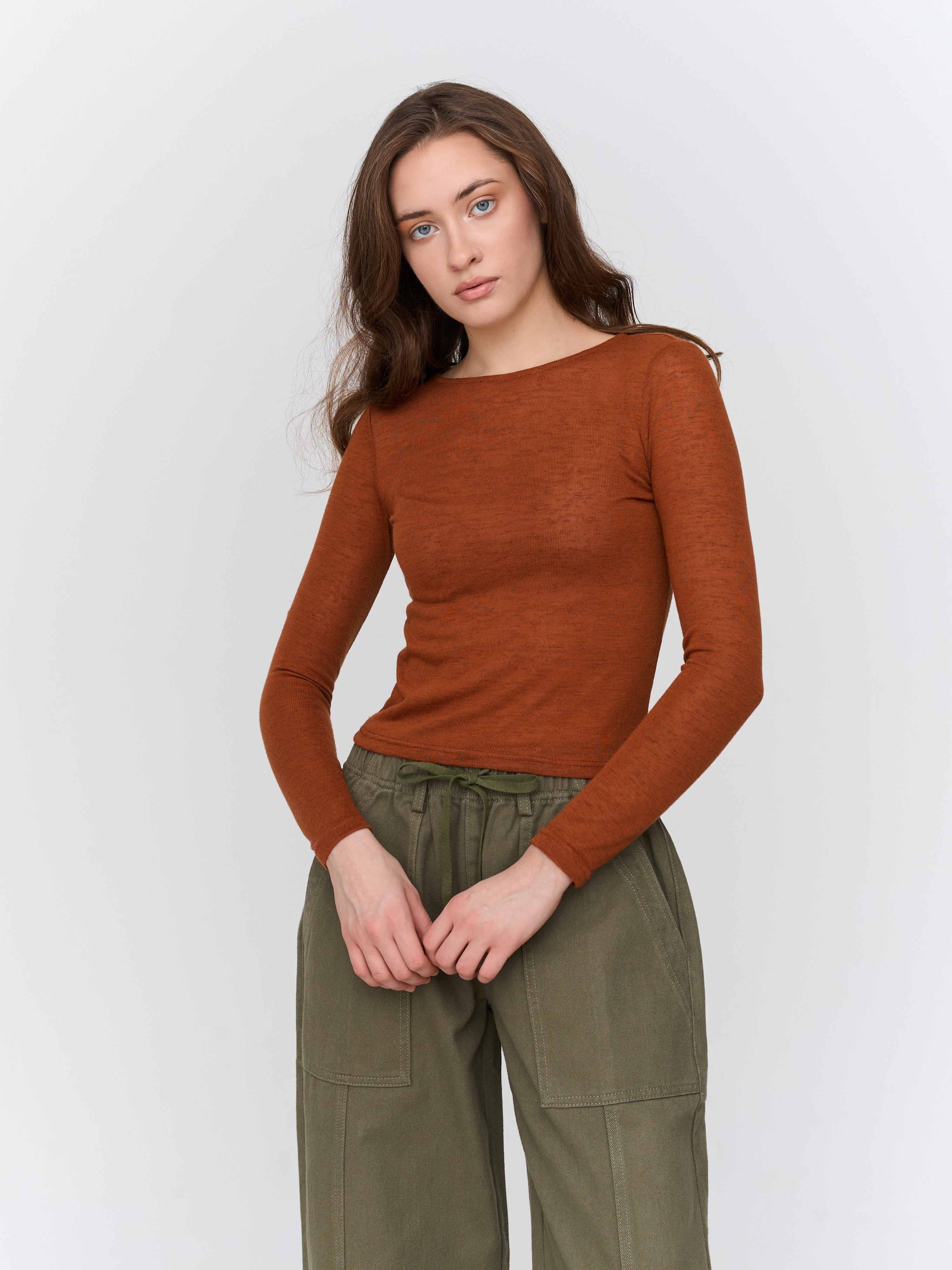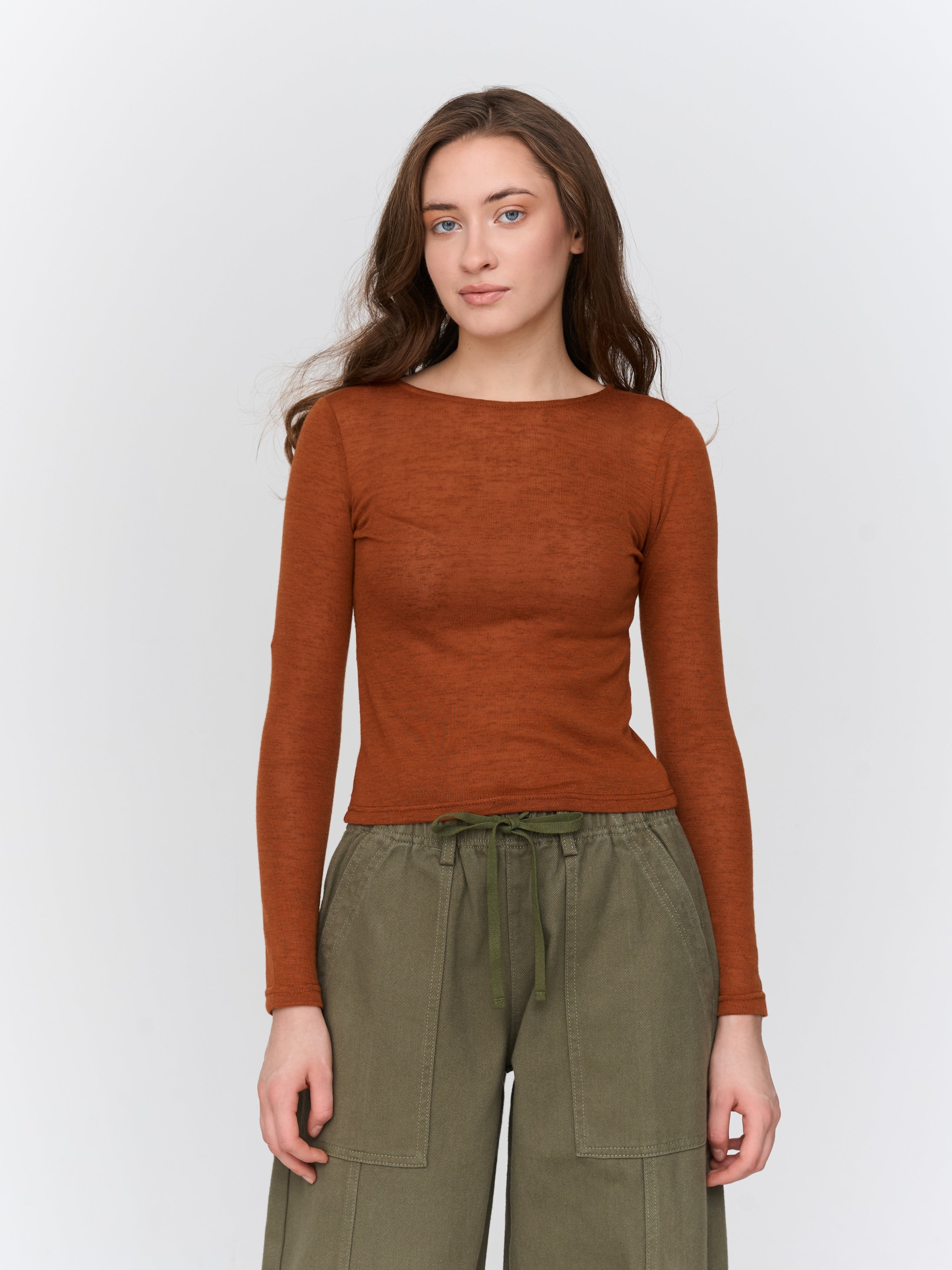 Esta camiseta de manga larga en color rost está confeccionada en un tejido ligero con textura sutil que aporta un acabado moderno y versátil. Su corte ajustado realza la silueta y la convierte en una prenda perfecta para llevar sola o como capa interior en looks de entretiempo e invierno.