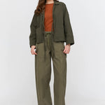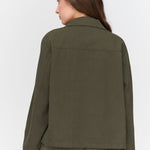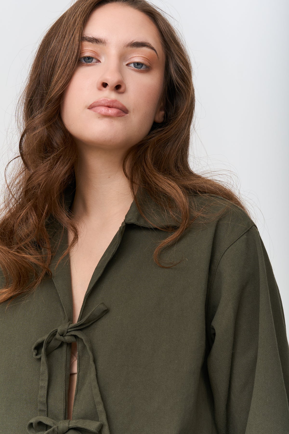 Esta chaqueta verde de algodón destaca por su diseño contemporáneo con cierres de lazo en la parte frontal, una alternativa moderna y minimalista a los botones tradicionales. Su silueta recta y ligera la convierte en una prenda versátil, perfecta para el entretiempo y para superponer sobre camisetas, camisas o jerséis finos.