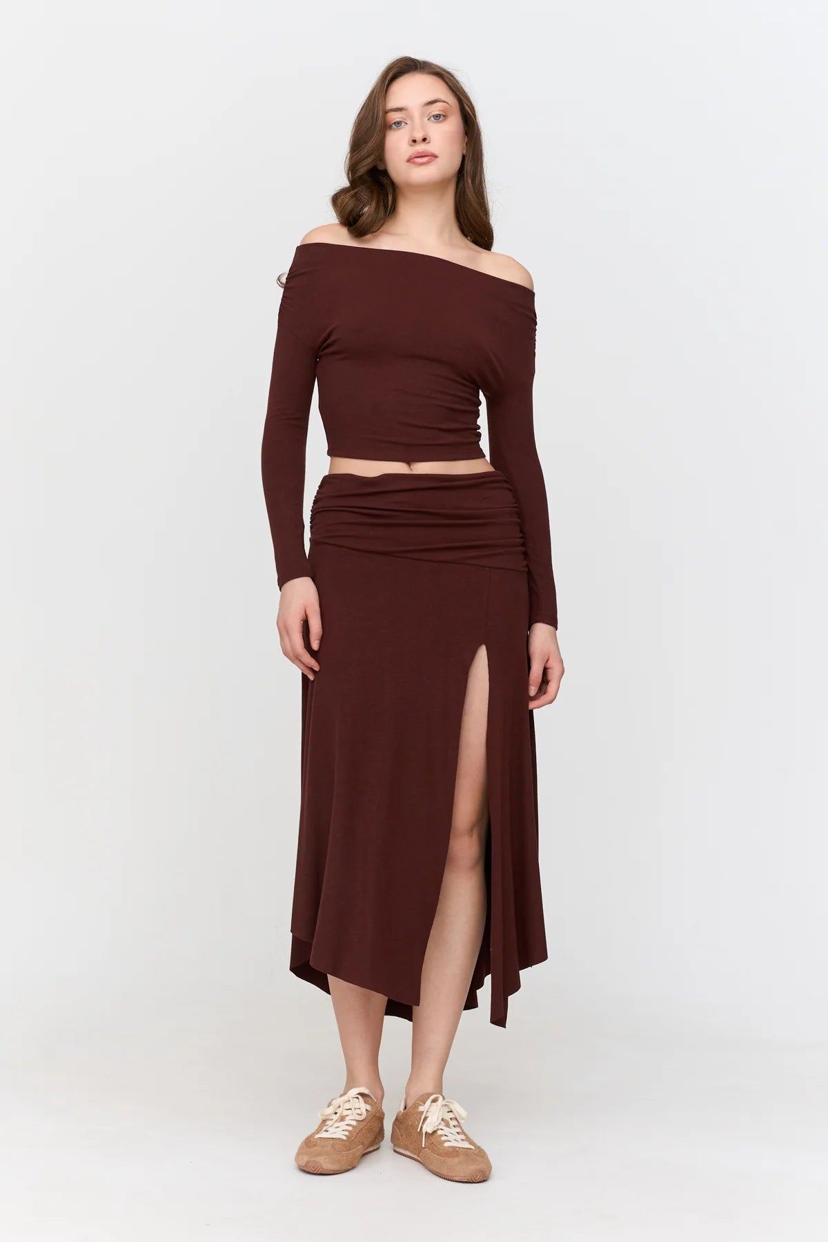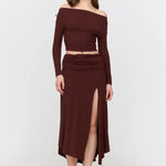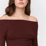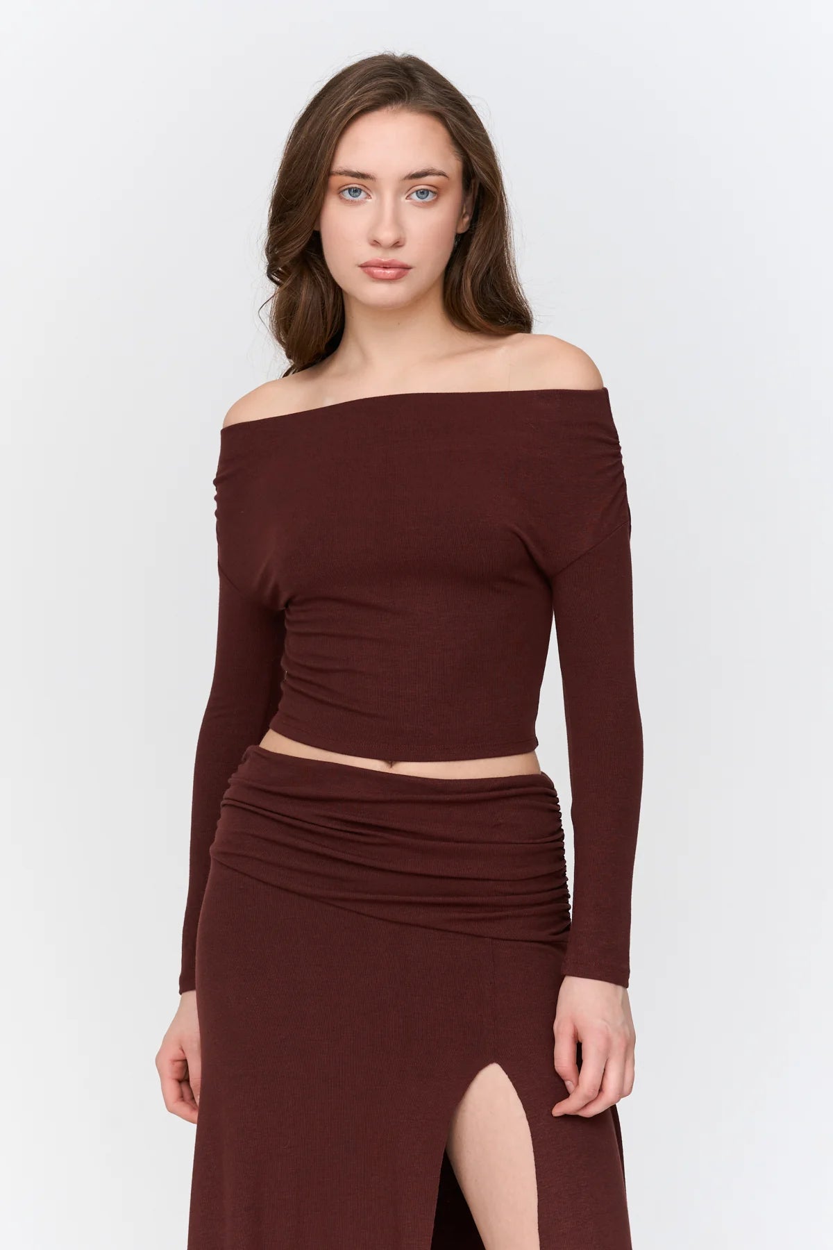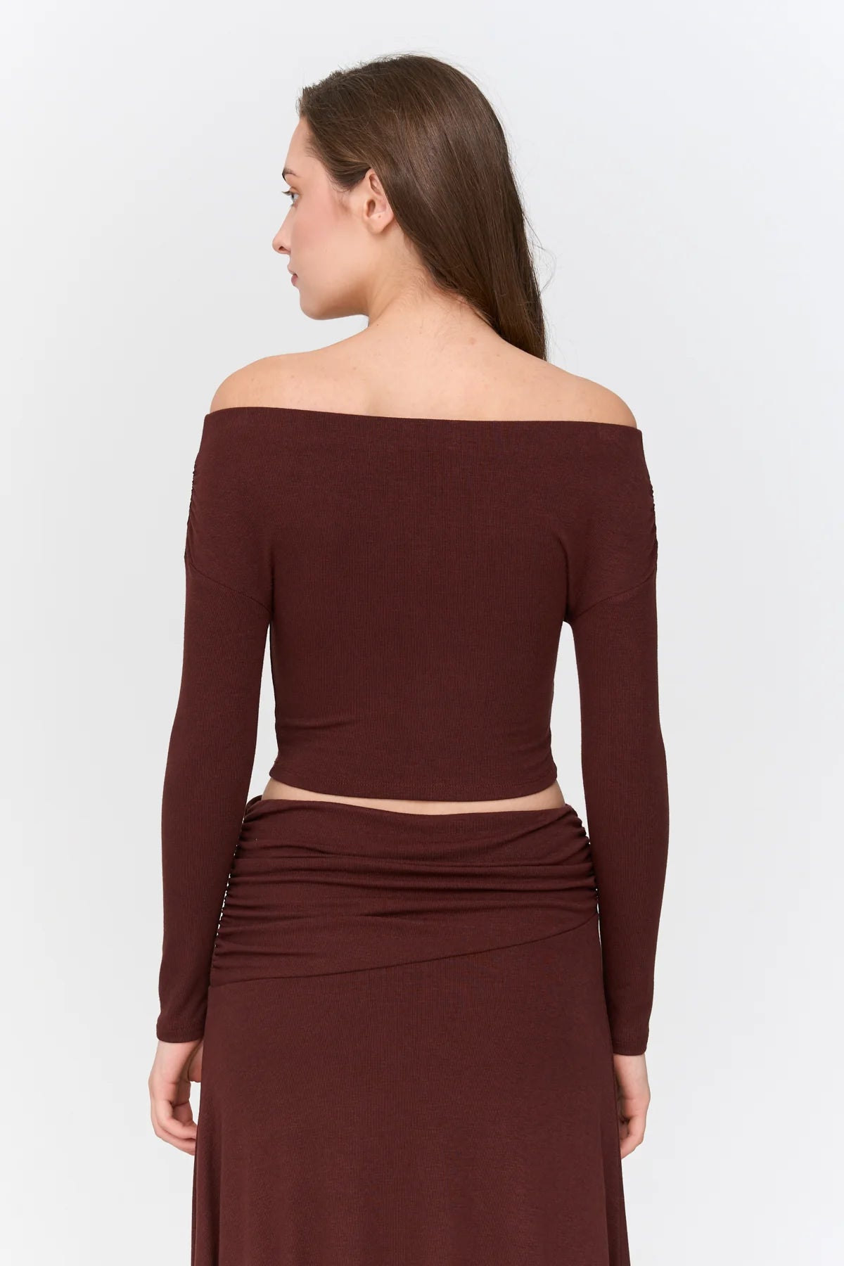 Este top de escote bardot en color burdeos es la prenda ideal para añadir un toque sofisticado y femenino a tu armario. Su diseño ajustado con hombros descubiertos resalta la silueta y aporta un aire elegante y moderno, perfecto tanto para looks de día como para ocasiones especiales.