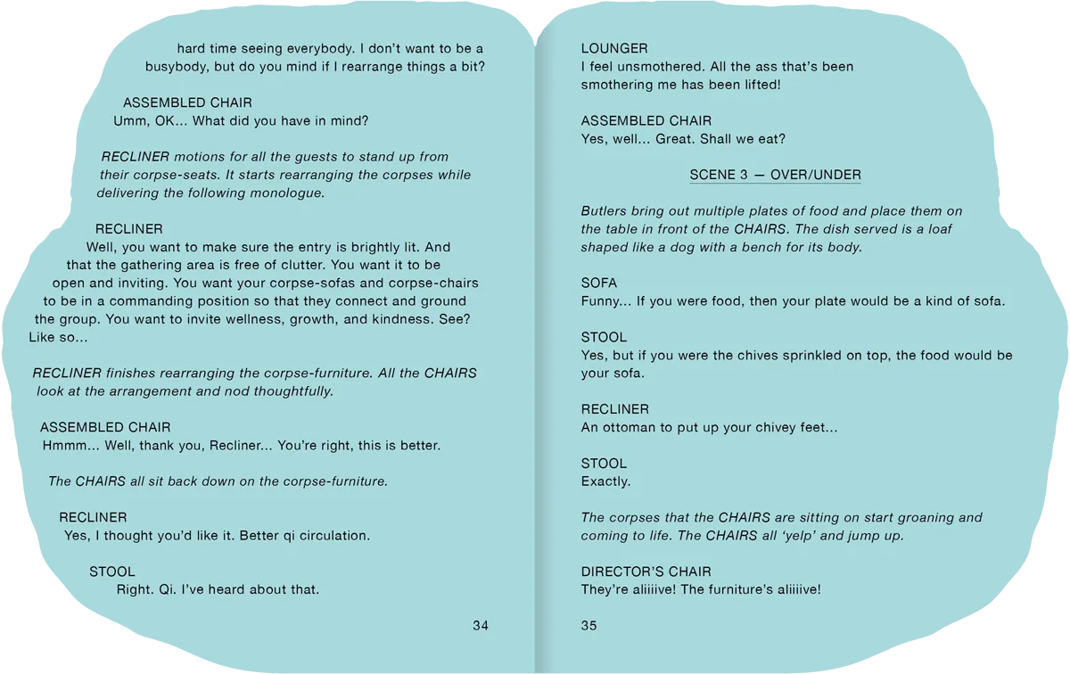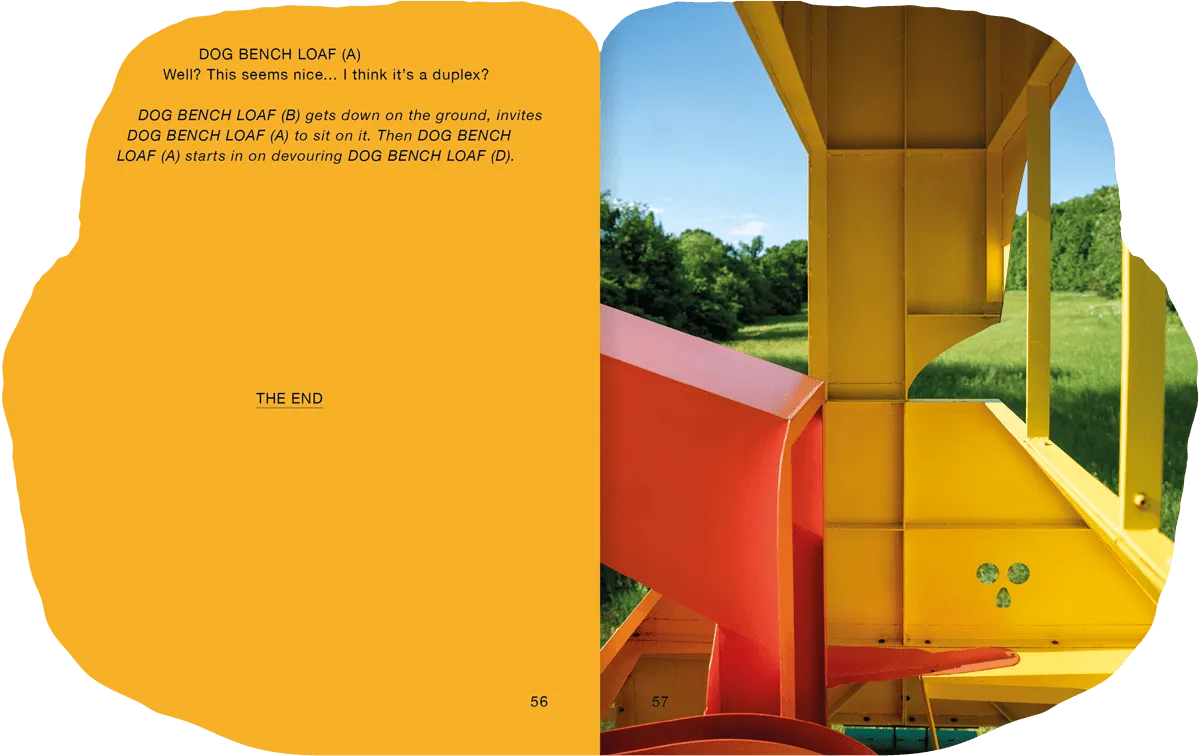 También funciona como una obra de teatro, escrita en tres actos por el compañero artista y amigo cercano de Serban, James English Leary, quien abraza completamente el enfoque artístico de Serban y explora sus ideas en una serie de eventos sumamente absurdos. Reuniendo piezas de entre 2017 y 2021, un vistazo a UNA COSA EN UNA MESA EN UNA CASA te transporta directamente al mundo antropomórfico de Serban, uno que se extiende a ambos lados de la línea siempre fina que separa muebles y esculturas.