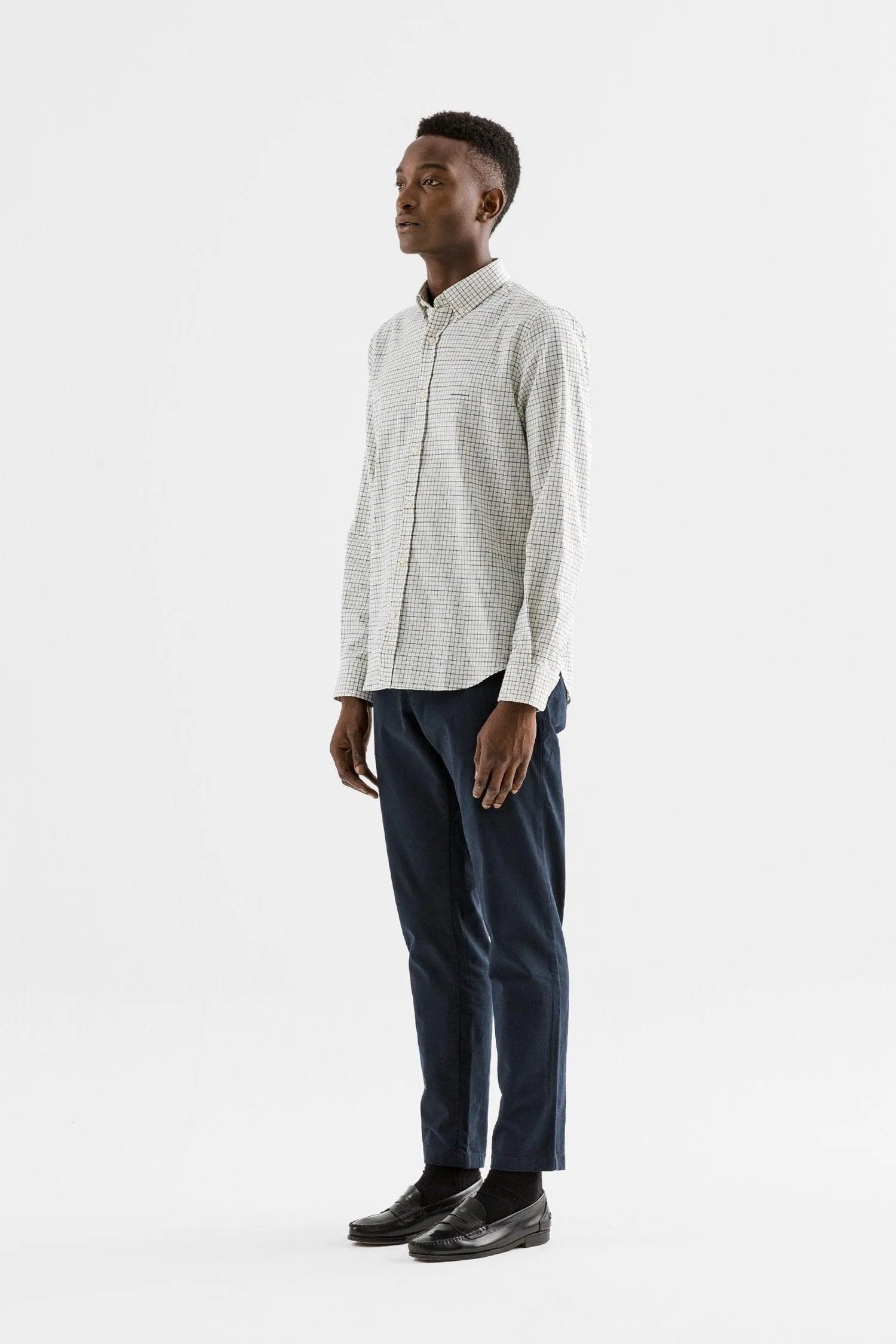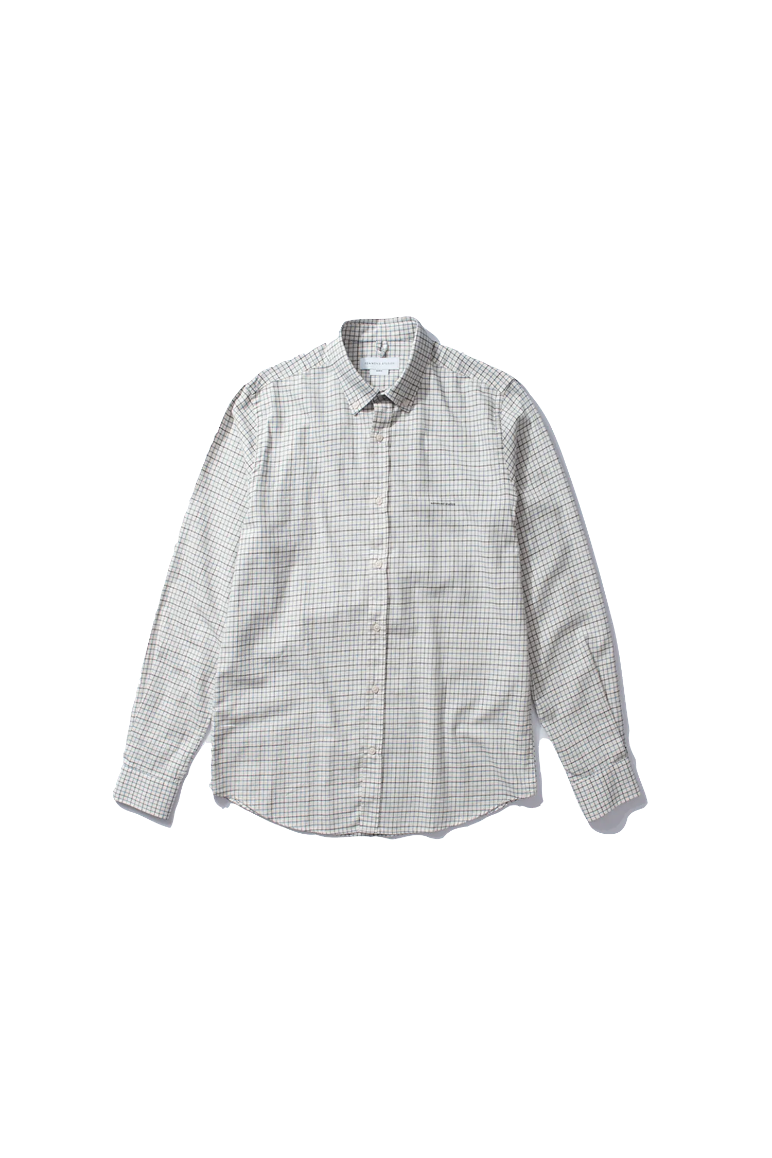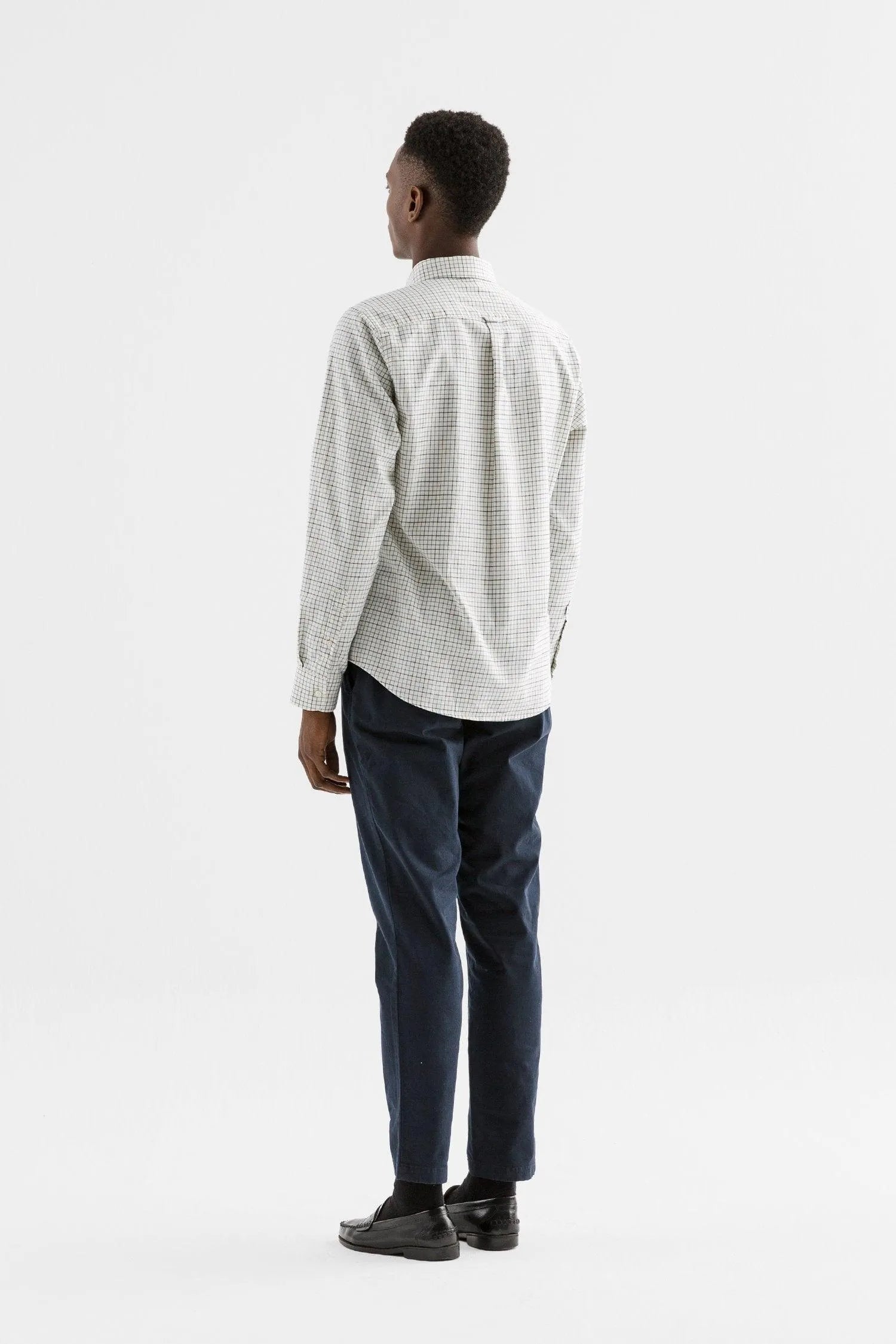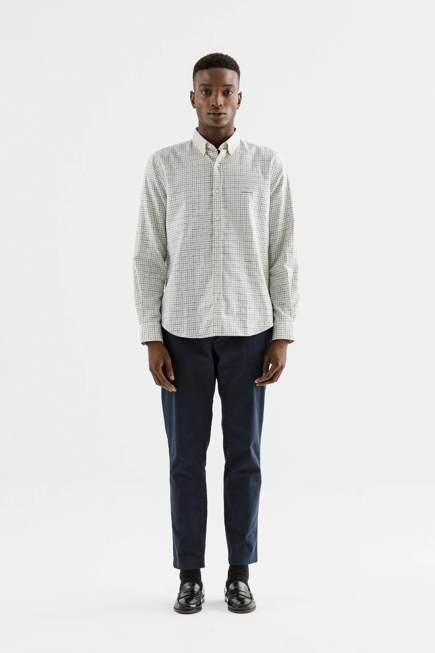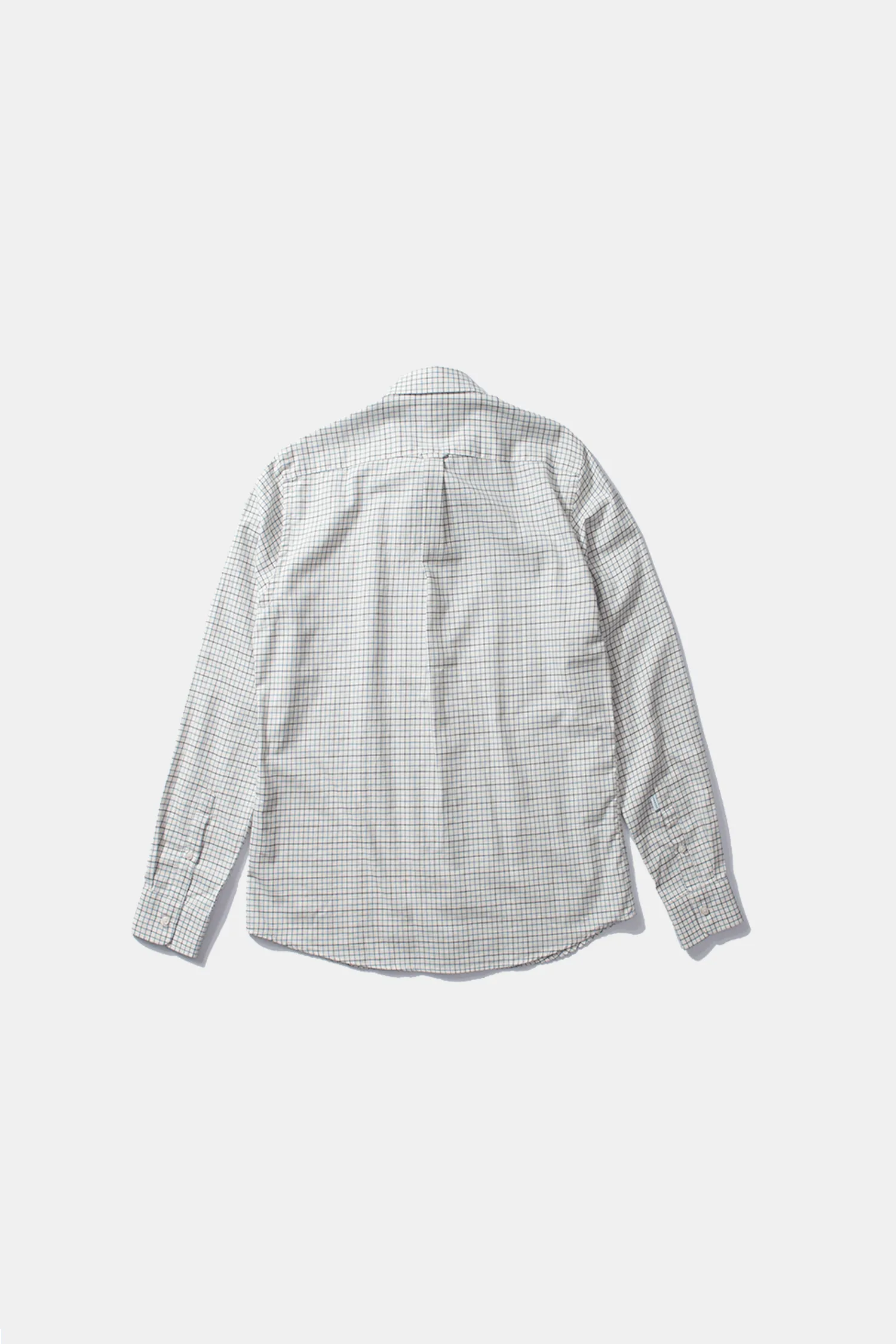 Camisa vaquera de cuadros pequeños con bolsillo de parche en el pecho y detalle de percha en la espalda.