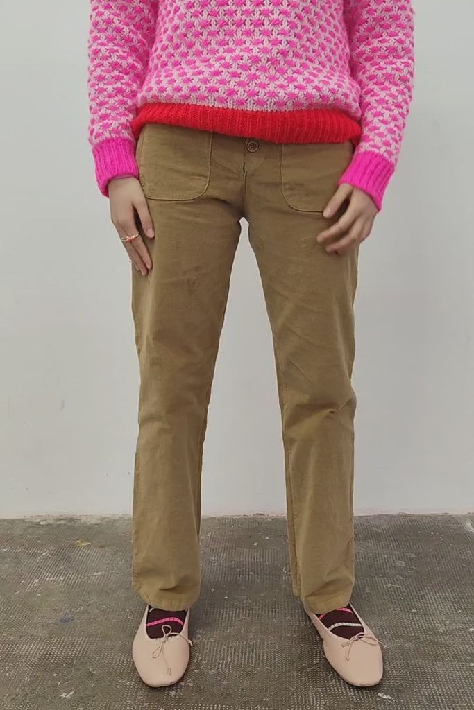 Abotonadura frontal con cinturilla fruncida en la parte trasera. Se ajusta perfectamente a la cintura.