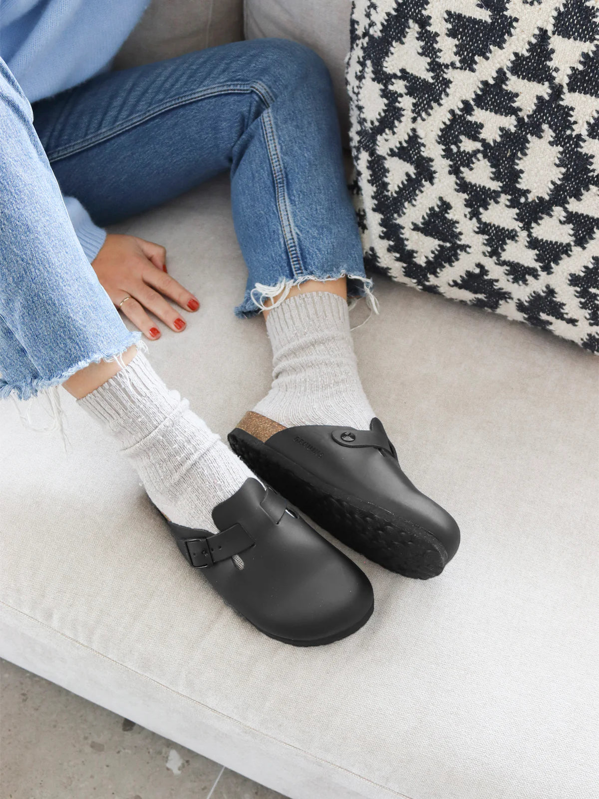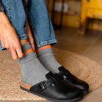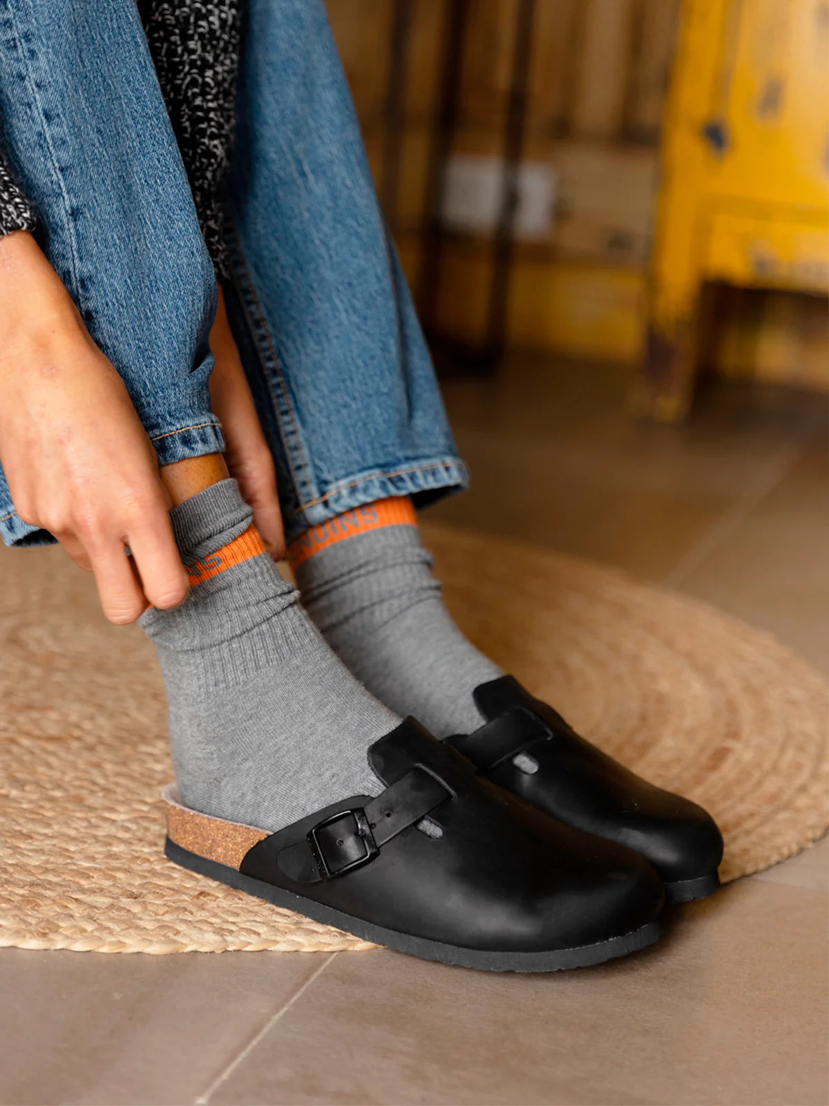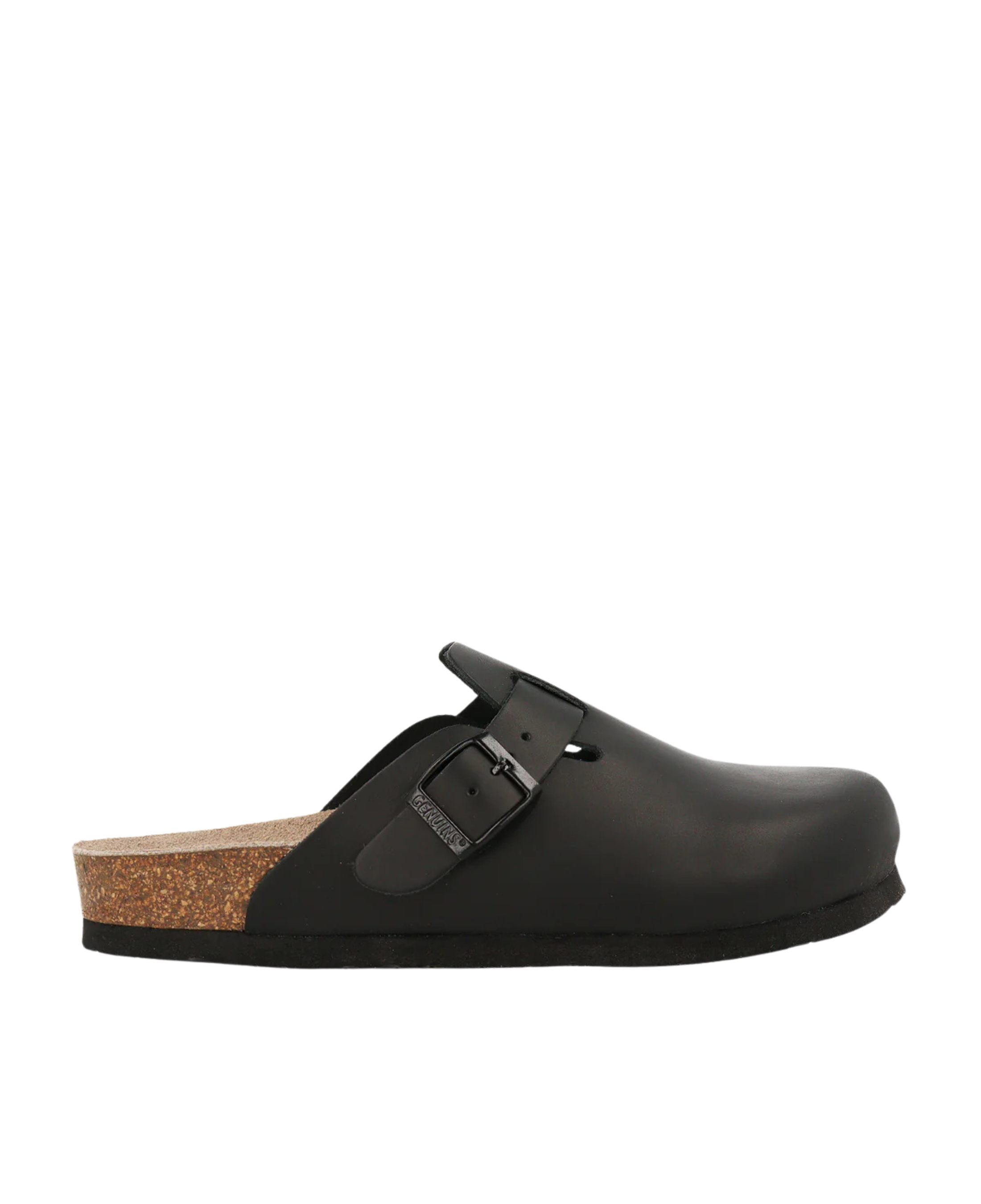 Zueco de piel engrasada en color negro con acabado vintage y atemporal. Cuenta con una planta anatómica de corcho y foam que se adapta a la forma del pie, proporcionando máximo confort y protección en cada paso. Incorpora hebilla ajustable para un ajuste seguro y personalizado.