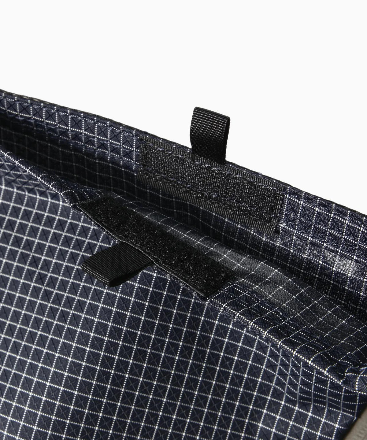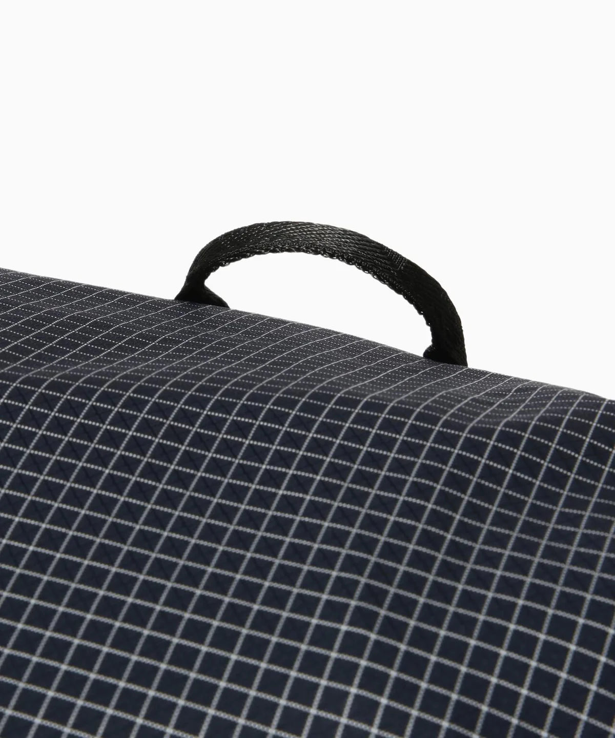 La base exterior utiliza nailon reciclado procedente de redes de pesca y residuos marinos, tejido junto a polietileno de alta resistencia en estructura ripstop. El forro interior está confeccionado en poliéster reciclado procedente de botellas PET, lo que refuerza una lectura más consciente en la elección de materiales.