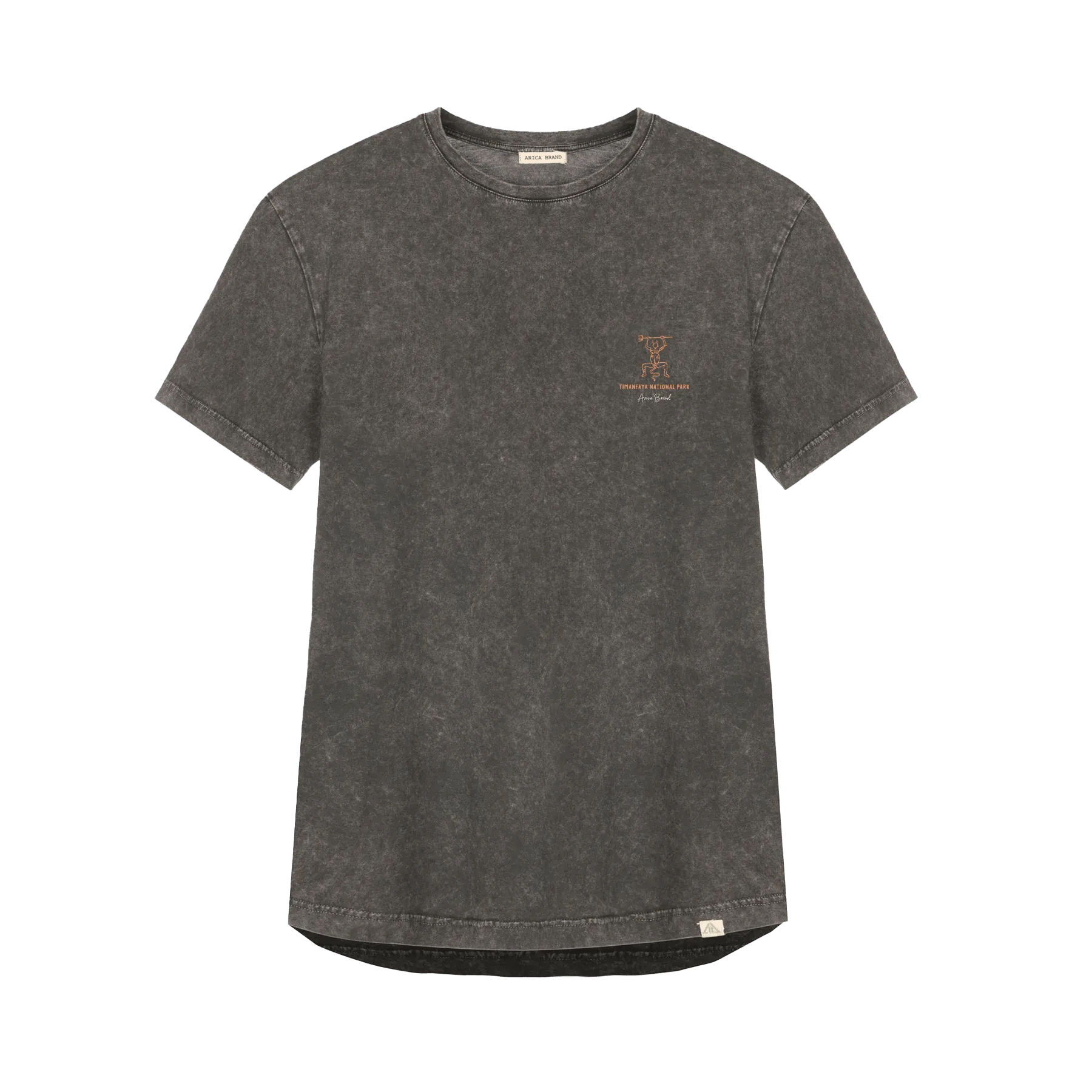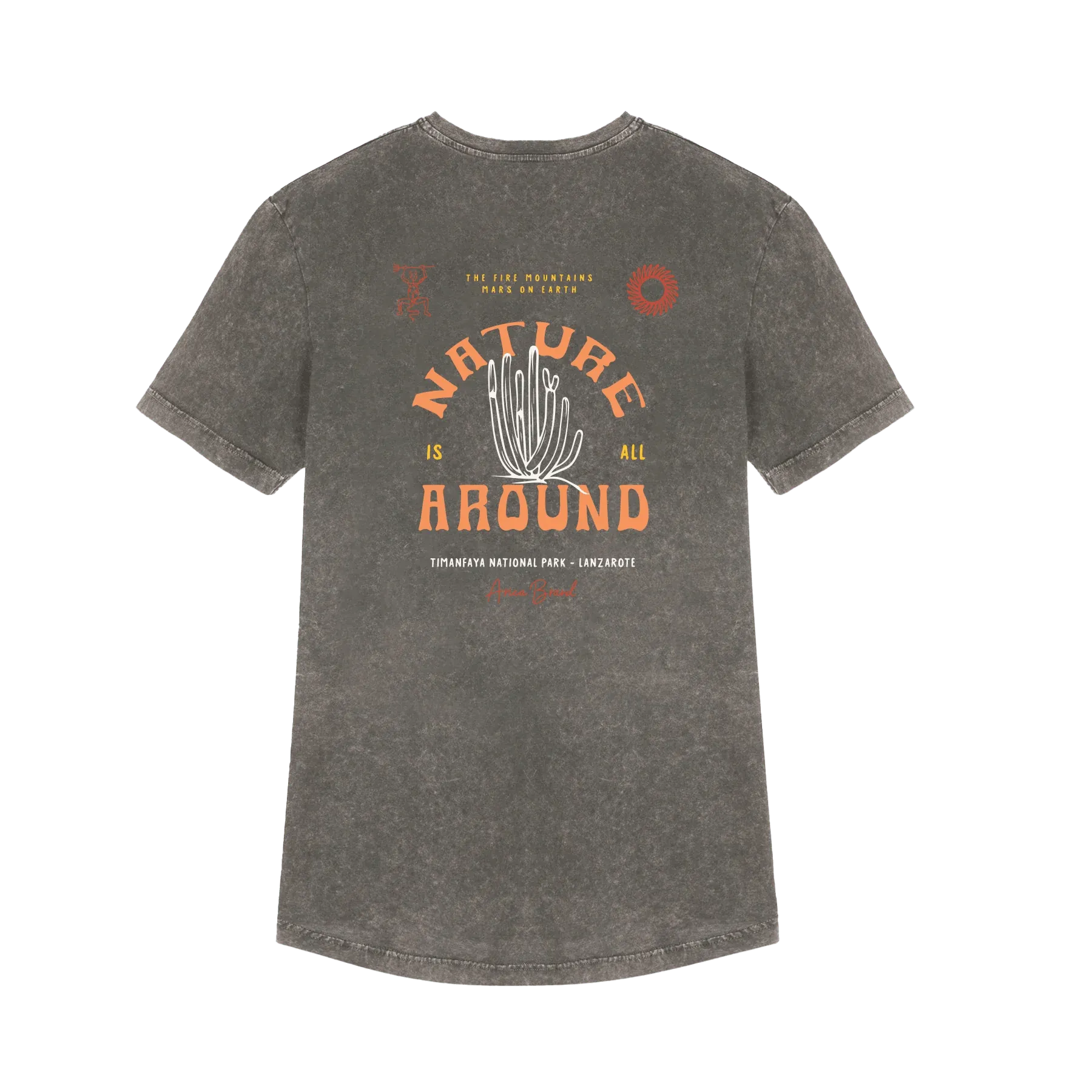 Más isla de los Volcanes de la mano de la camiseta Timanfaya, una joya nacional. En el print se puede ver la frase NATURE IS ALL AROUND combinada con símbolos característicos del parque y colores que nos recuerdan a su origen volcánico.