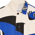 Chaqueta de trabajo en sarga de algodón orgánico prelavado para mayor suavidad. Estampada según un diseño del artista estadounidense James Coffman. Tres bolsillos de parche exteriores y uno interior. Detalle original: un botón en contraste (y un botón de repuesto del mismo color que la chaqueta).