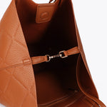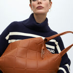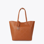 Elegante shopper con efecto piel y monograma de rombos. Incorpora un logo ovalado colgante en metal. Amplio interior con bolsillo con cremallera. Ideal para el día a día, combinando estilo y funcionalidad.
