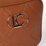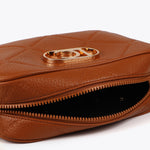 Bandolera en efecto piel con diseño de monograma y patrón de rombos. Presenta un logo ovalado metálico en el frente. Incluye una correa ajustable con logotipo. Cierre de cremallera resistente.