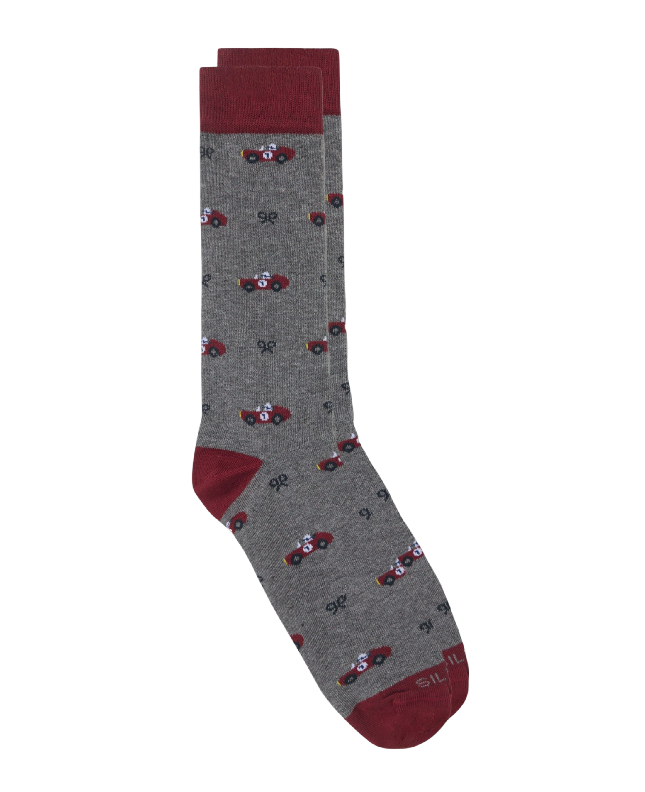 Calcetín con estampado de coches en color verde confeccionado en mezcla de algodón. Presenta caña media y detalle de raquetas. Cuenta con letras SILBON en jacquard. Fabricado en Portugal.