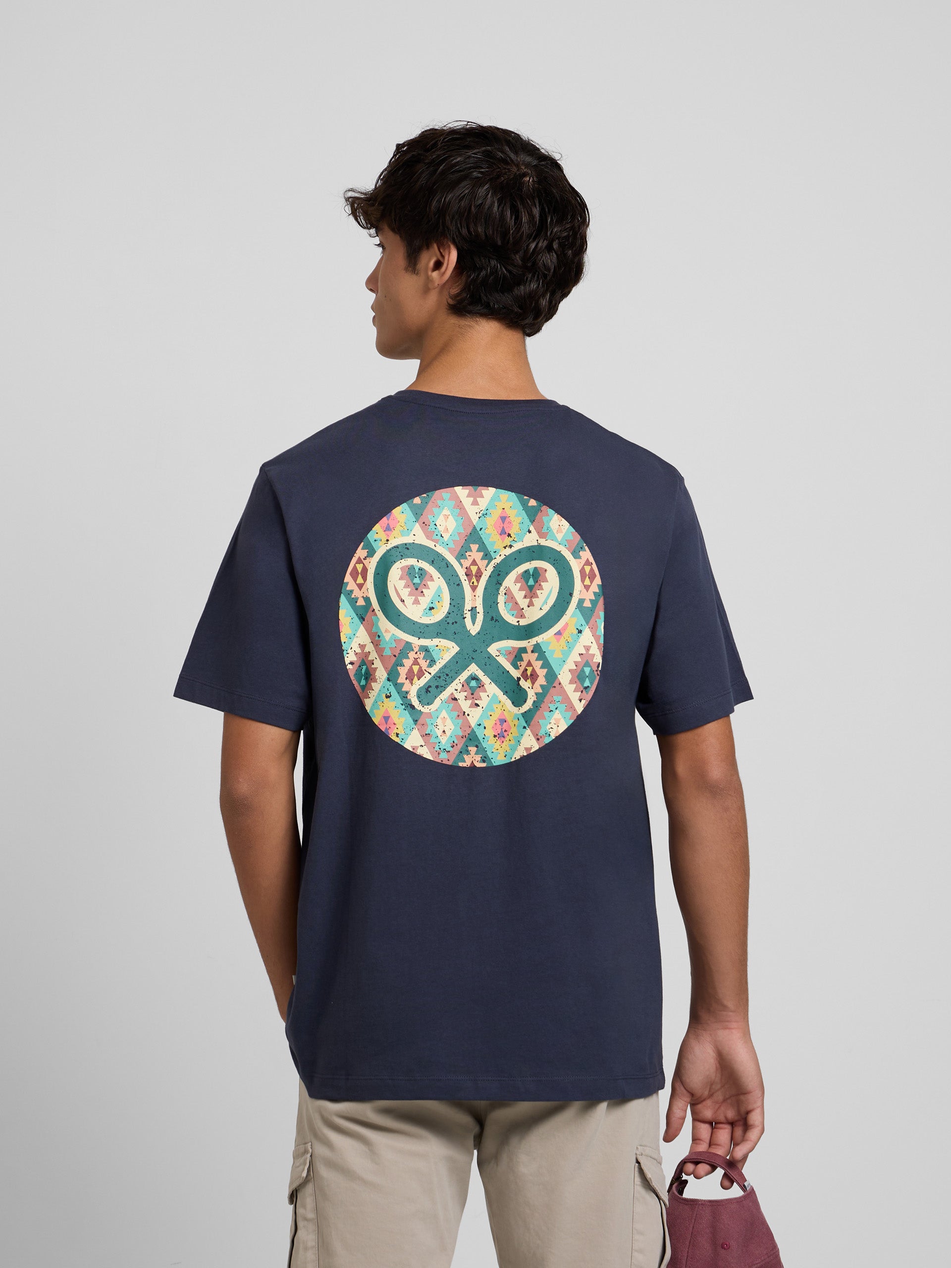 En cuanto al diseño, esta camiseta presenta en la espalda un print de círculo con estampado étnico multicolor, que incorpora además un motivo de raquetas —elemento gráfico distintivo de la marca—. También incluye un pequeño print del logo de raquetas en color verde contrastado sobre el torso.