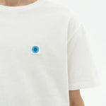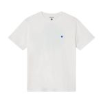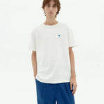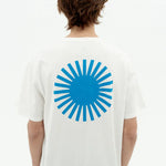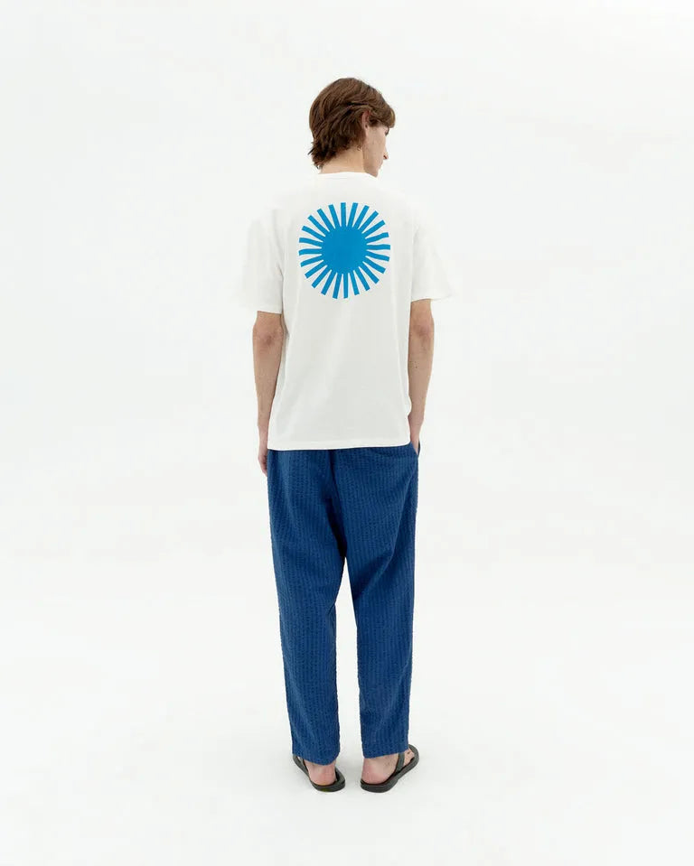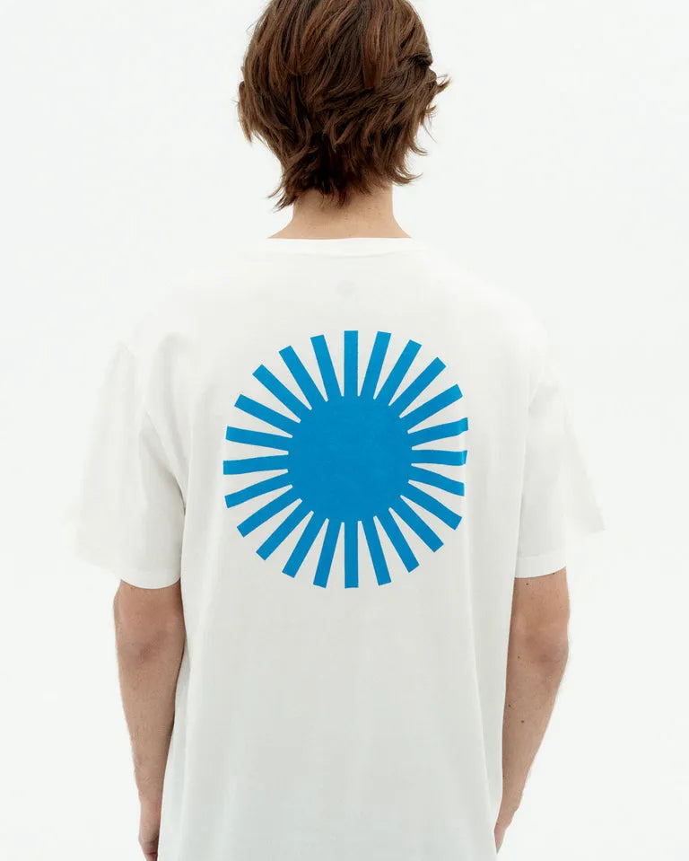 Camiseta blanca sol espalda azul hecha de algodón orgánico