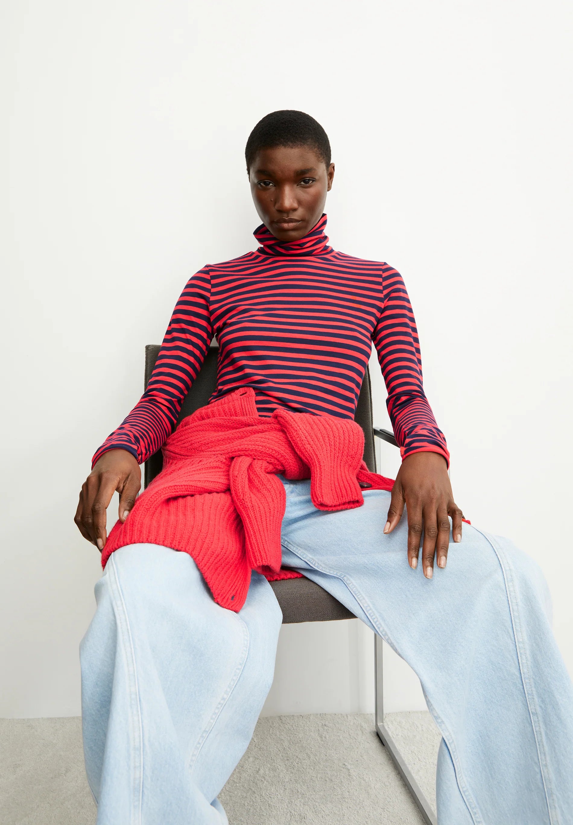 Camiseta de manga larga confeccionada en 100 % algodón orgánico de tacto ligero. Presenta cuello tipo roll neck, diseño de rayas y etiqueta distintiva. Cuenta con corte Slim Fit para una silueta cercana al cuerpo.