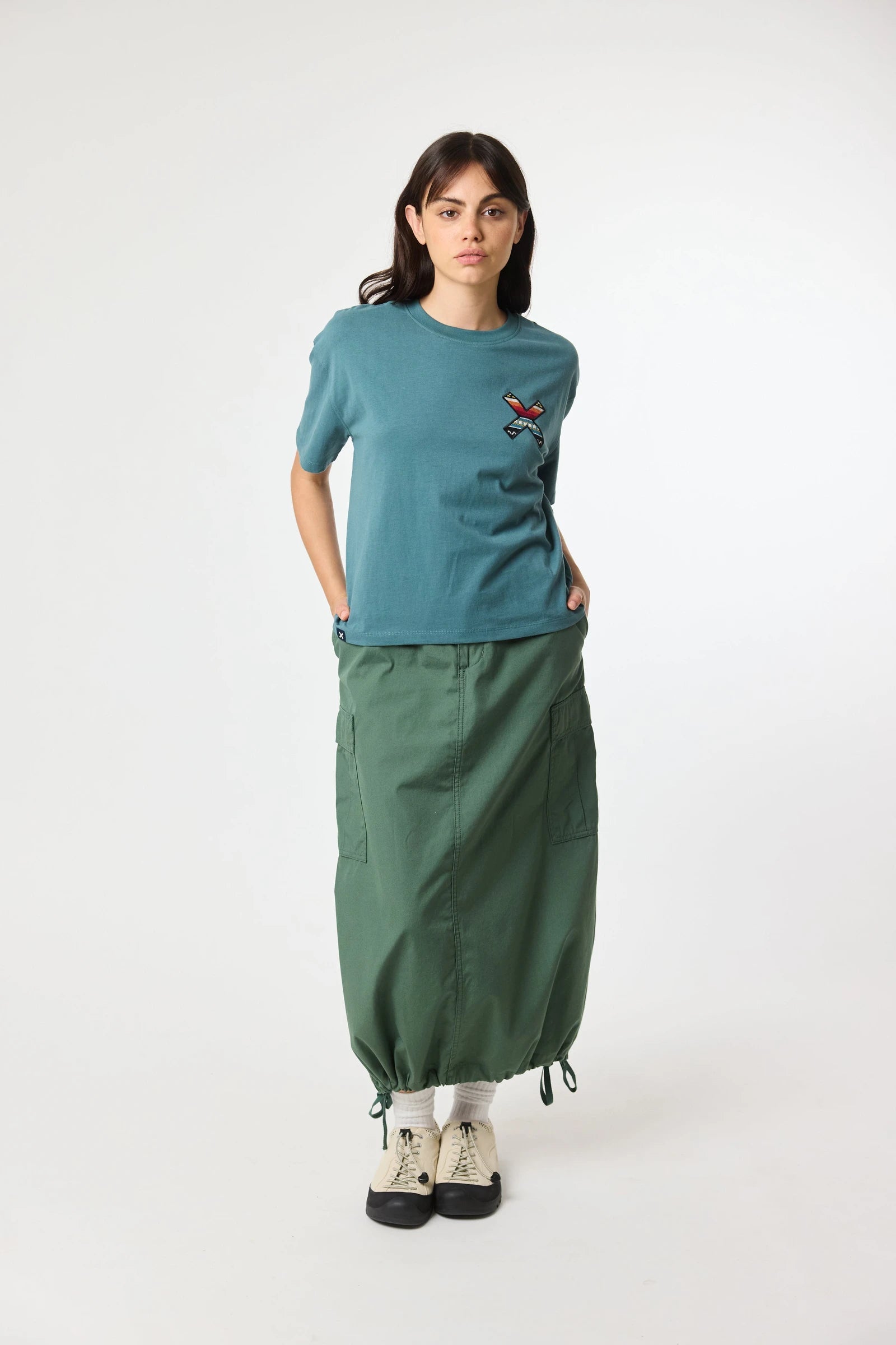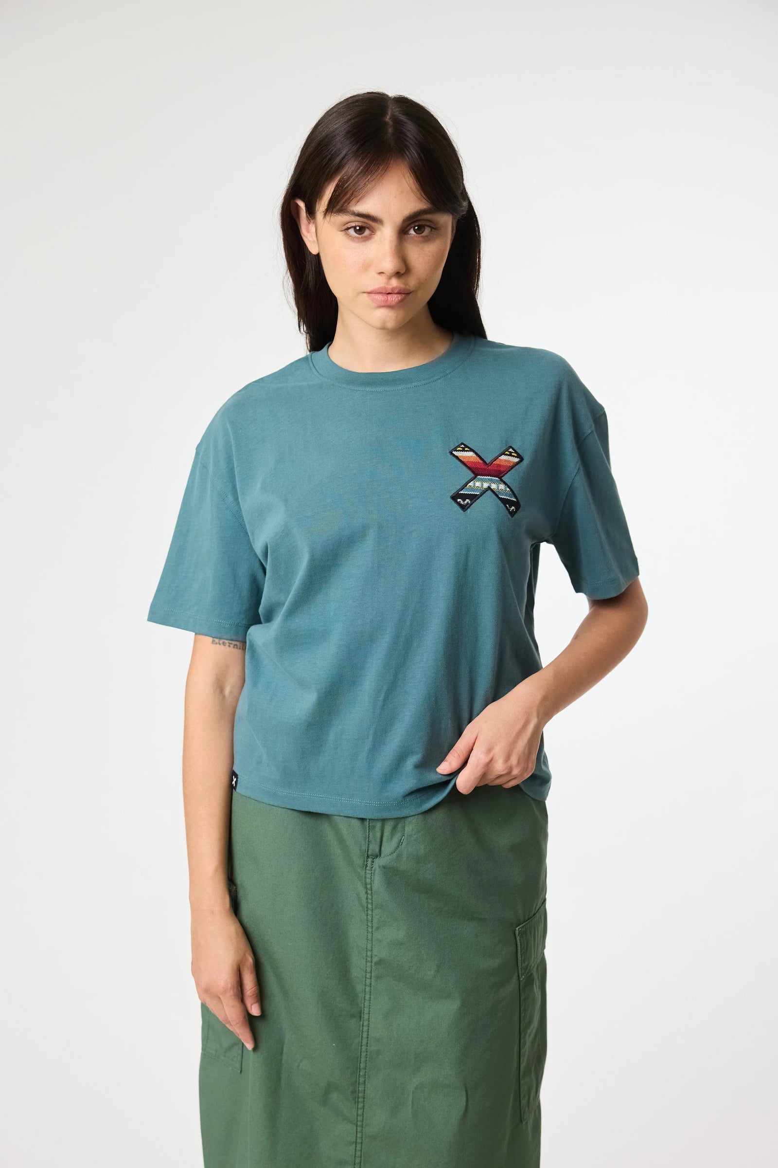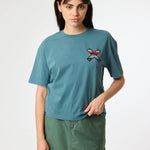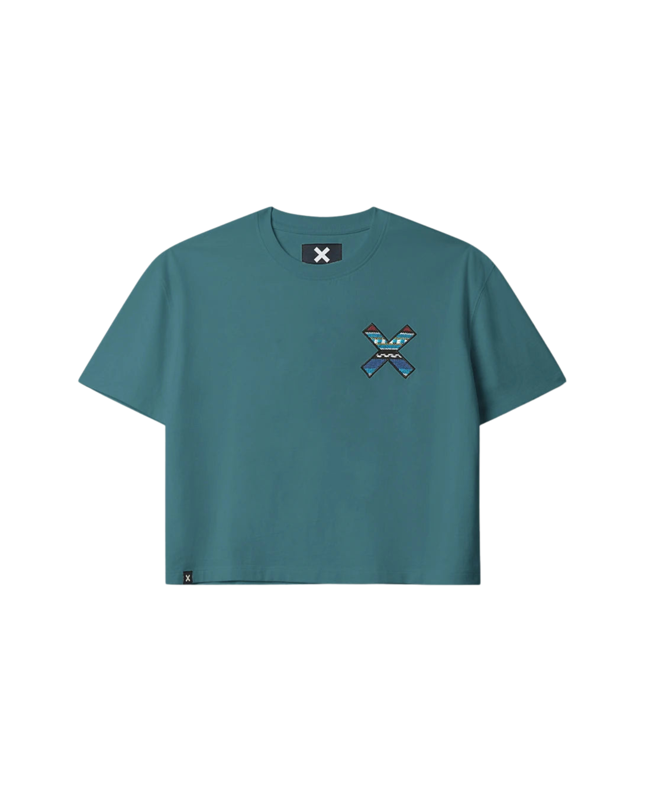 Camiseta crop Blue Banana de manga corta confeccionada en algodón orgánico 100 %. Su diseño minimalista con bordado “X” en el pecho y en la espalda le confiere un carácter icónico. Ajuste ligeramente corto y tejido de alta comodidad, ideal para estilismos casual con personalidad.