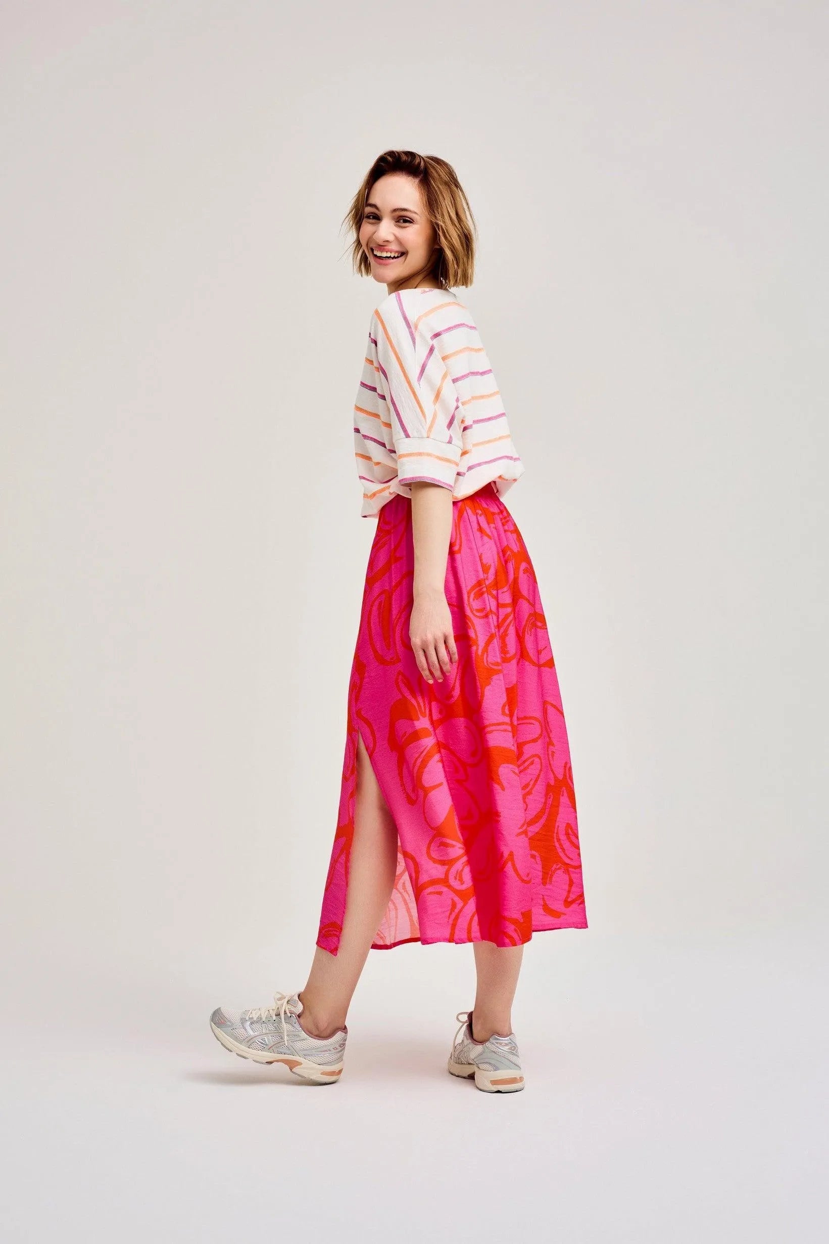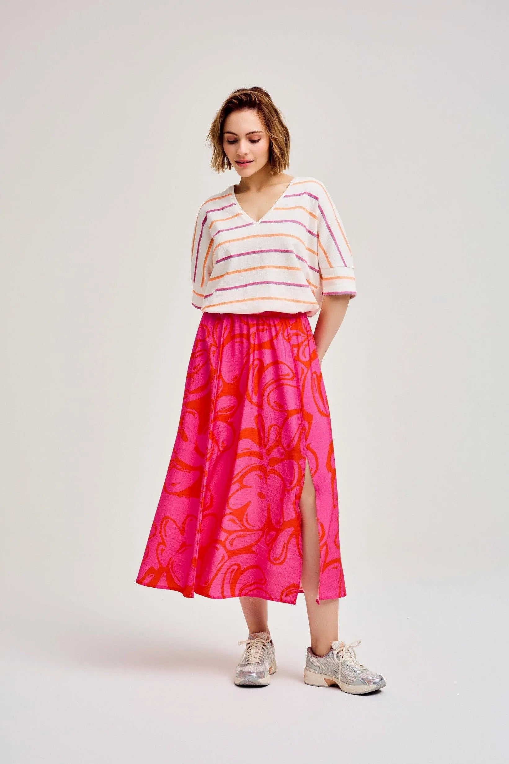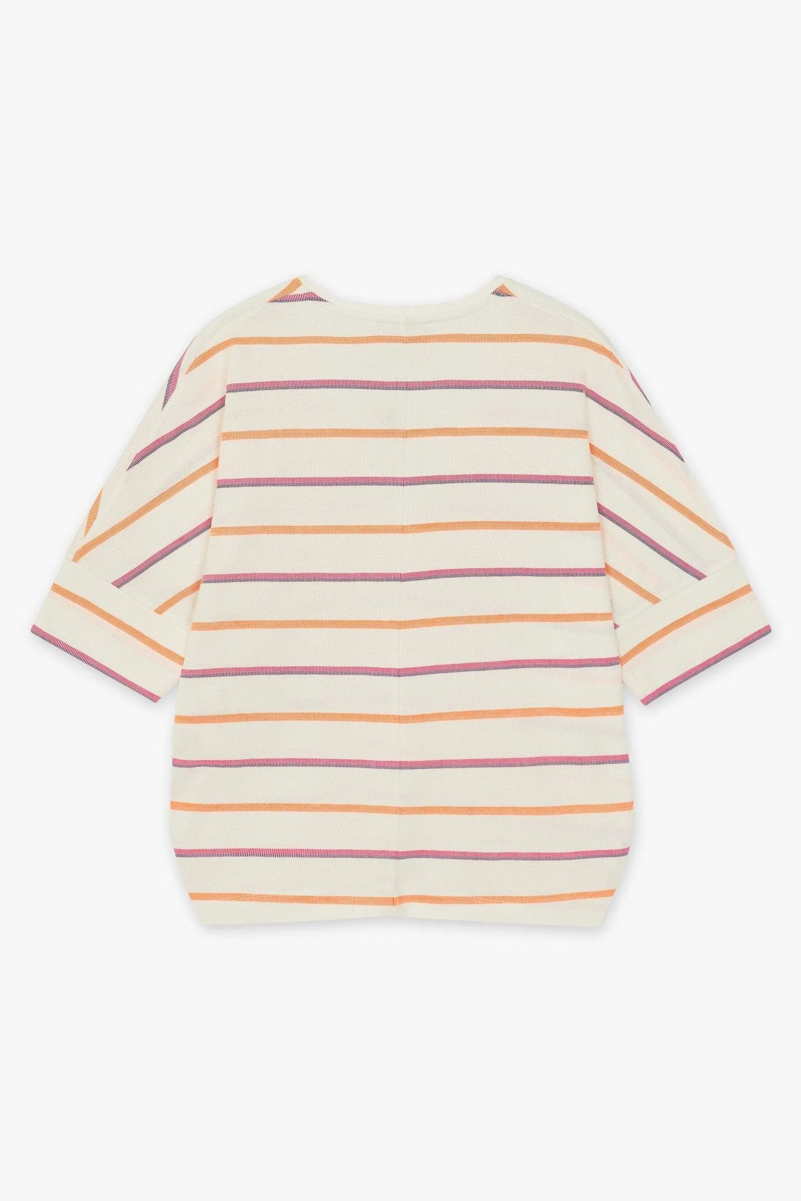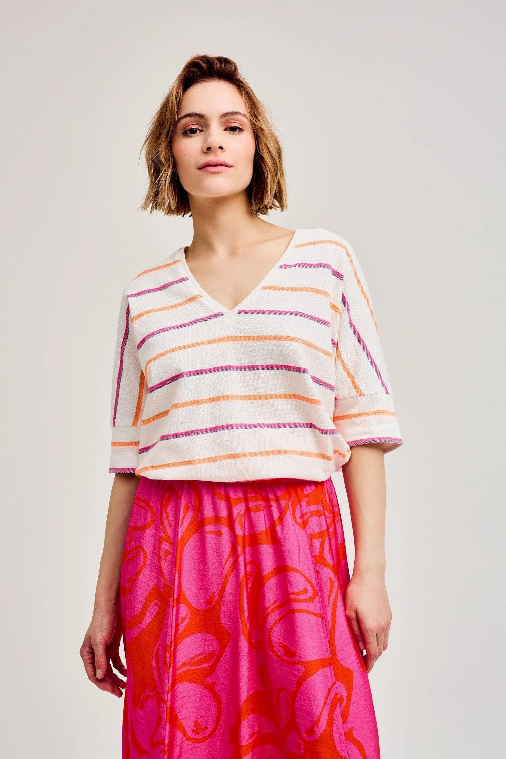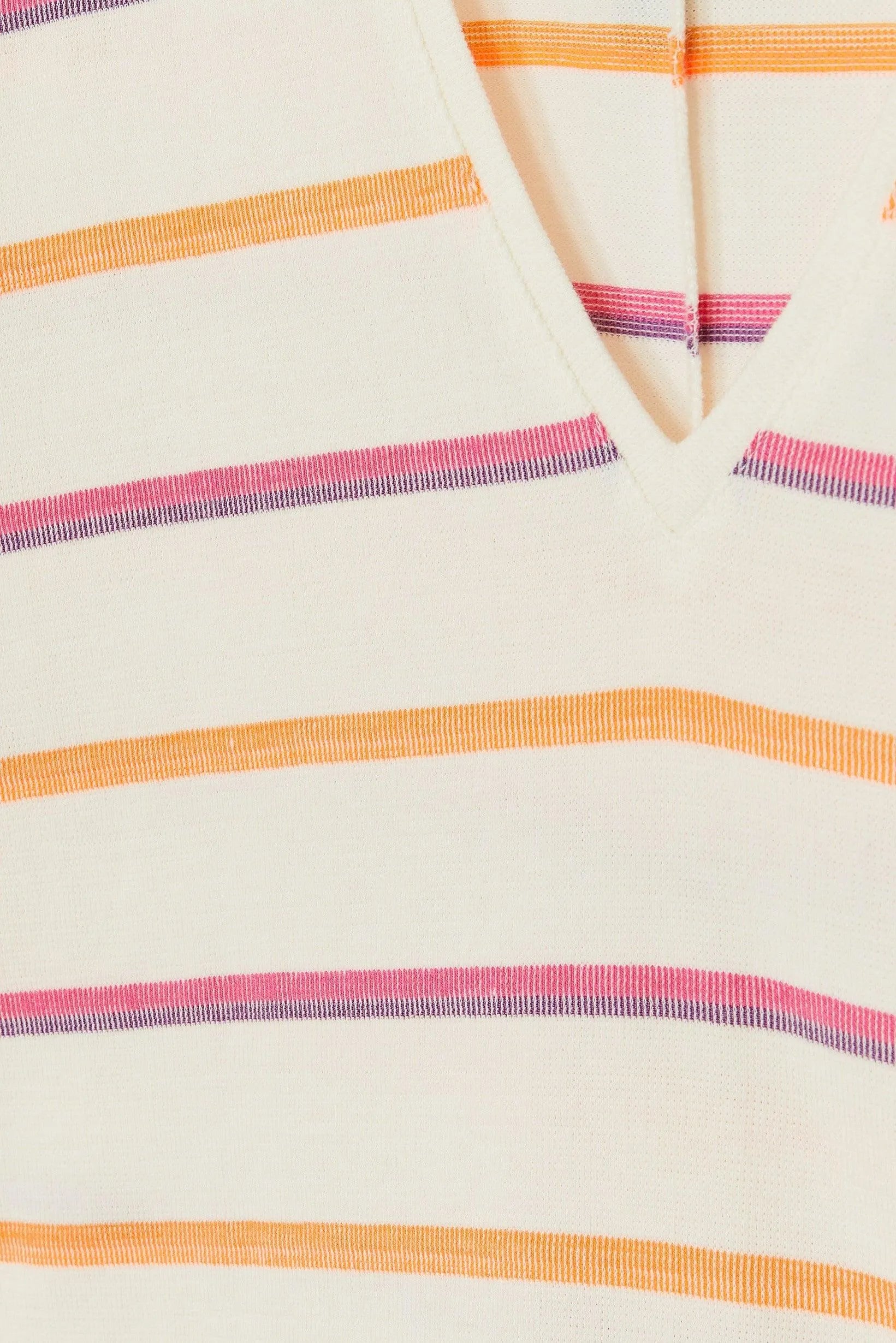 Apuesta por un look informal con esta camiseta de rayas de manga corta. La popular ELDODEEP presenta escote en pico, rayas naranja-rosa y dobladillo ancho en las mangas. Esta prenda está confeccionada en un 90% de algodón.