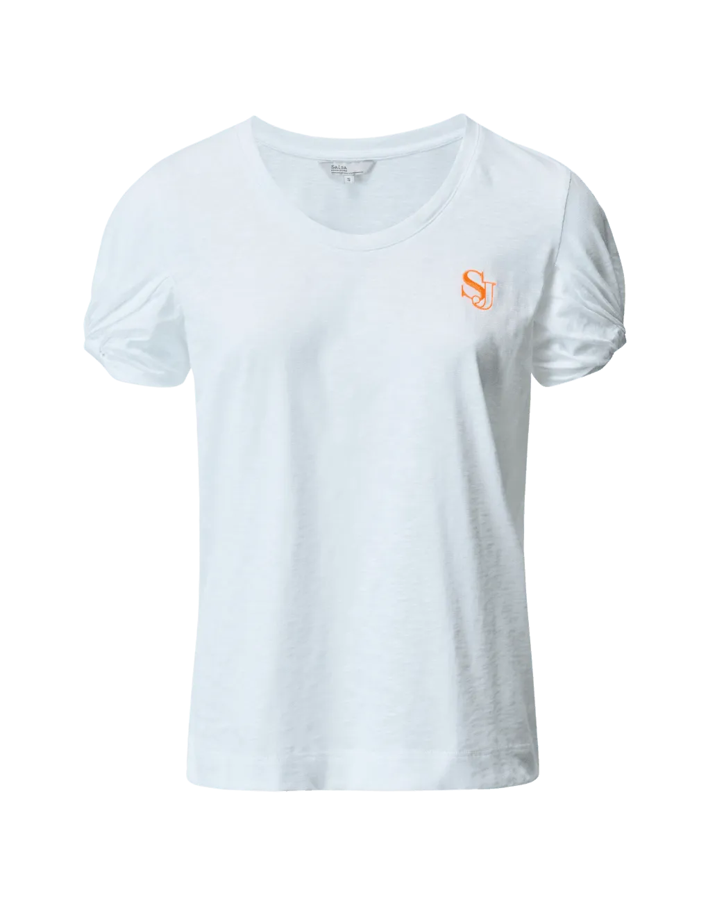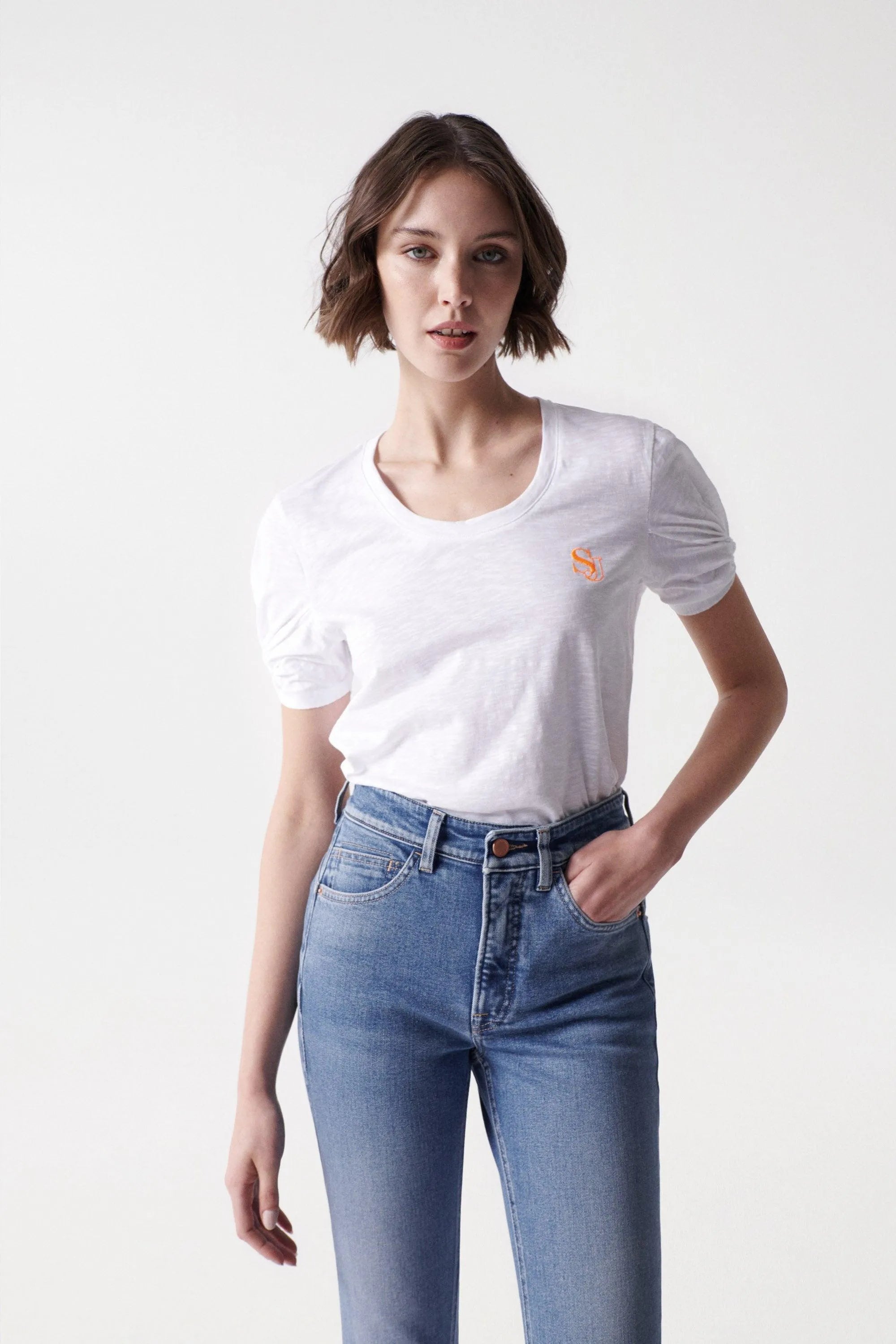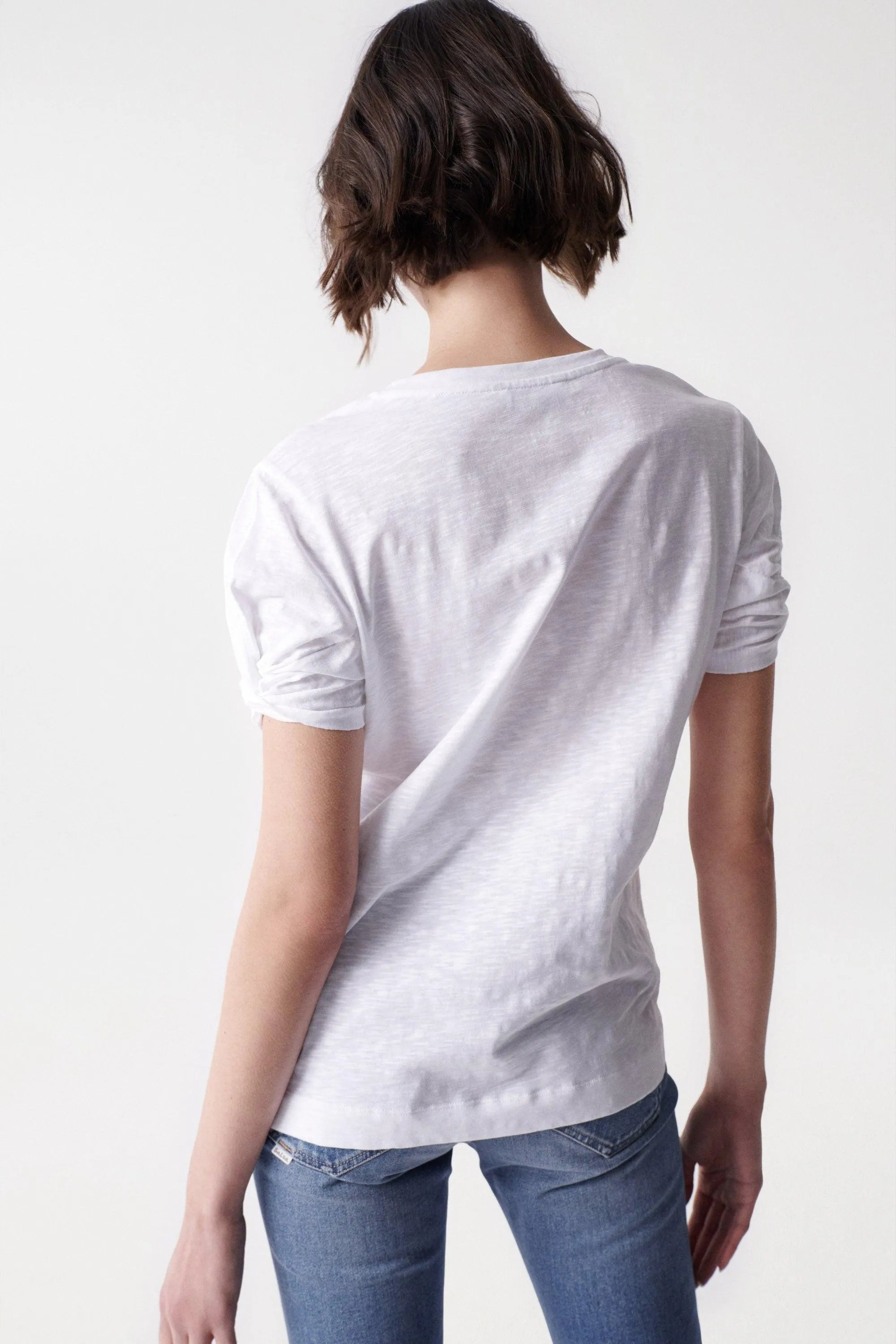 Camiseta con branding. Blanco. Cuello redondo. Manga corta fruncida.