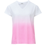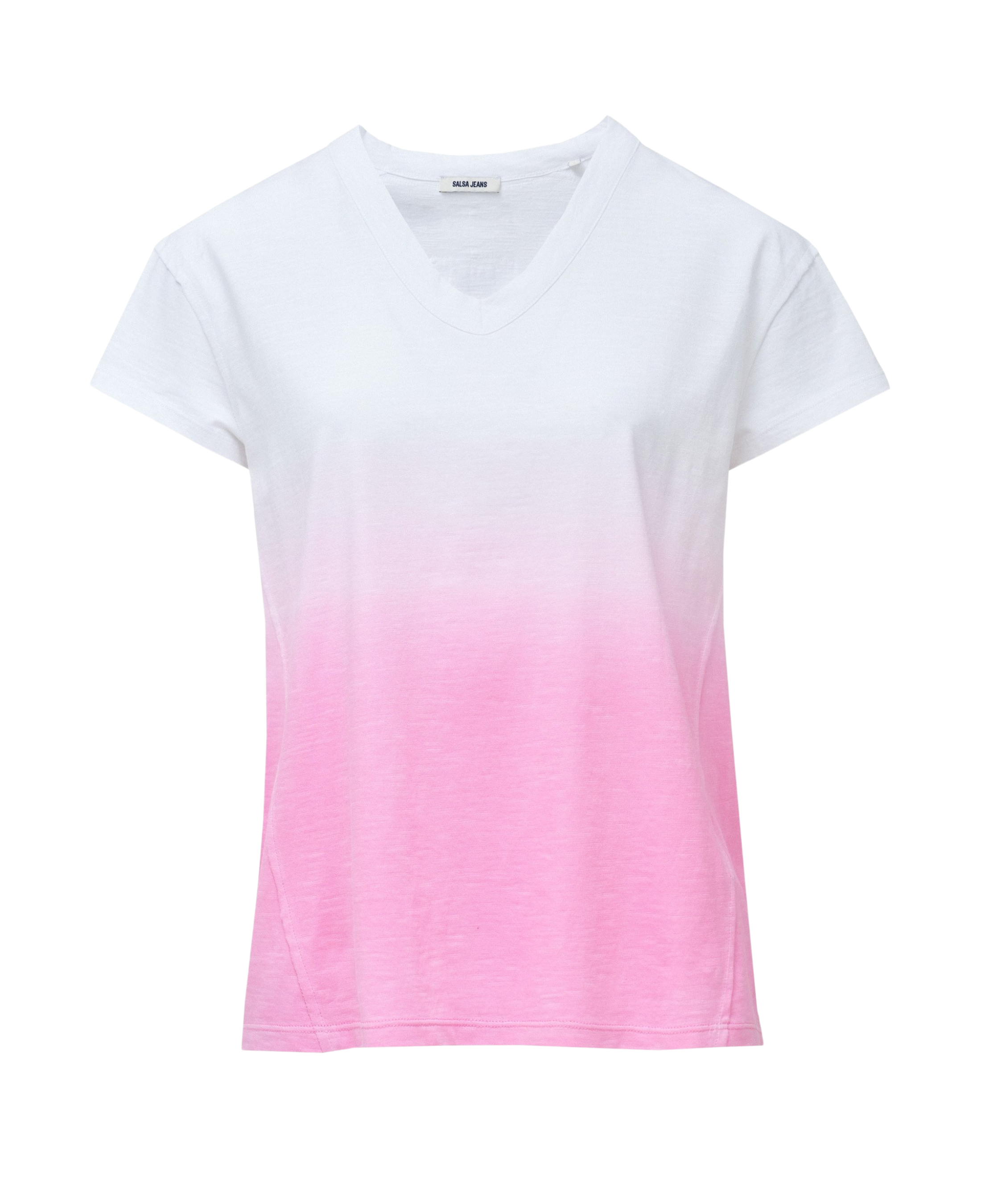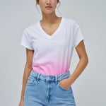 Una camiseta perfecta para días de sol y buena energía. Con un efecto degradado en tonos de rosa y blanco, tiene escote en V, corte ajustado y mangas cortas, todo lo que necesitas para un look ligero y relajado. Las costuras deshilachadas le dan ese aspecto vivido y auténtico, y el detalle de branding en la parte trasera le añade identidad. Combina con tus vaqueros favoritos y estarás lista para todo.