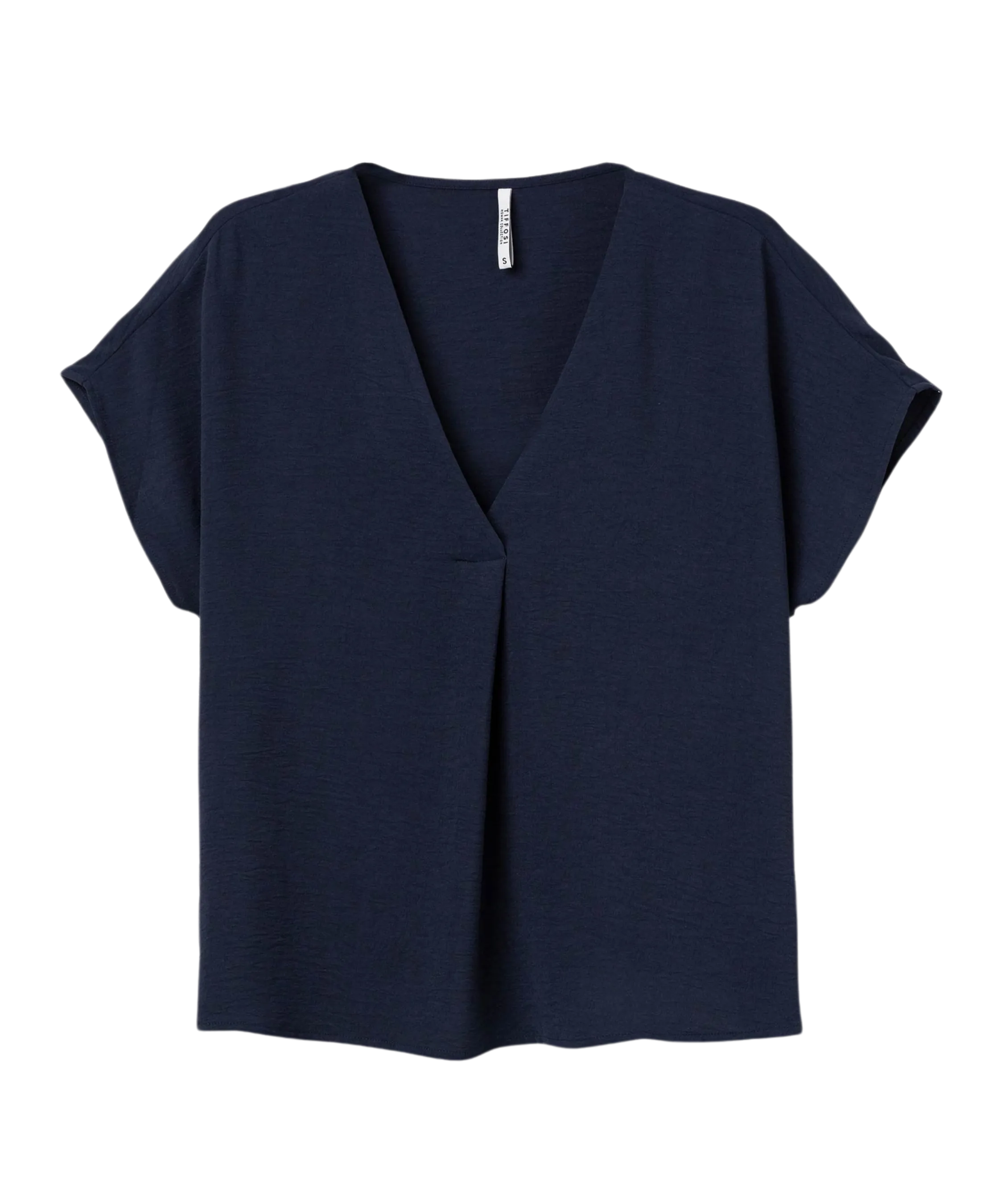 Blusa fluida satinada con manga corta y escote en V. Efecto frontal y pliegue en la manga.