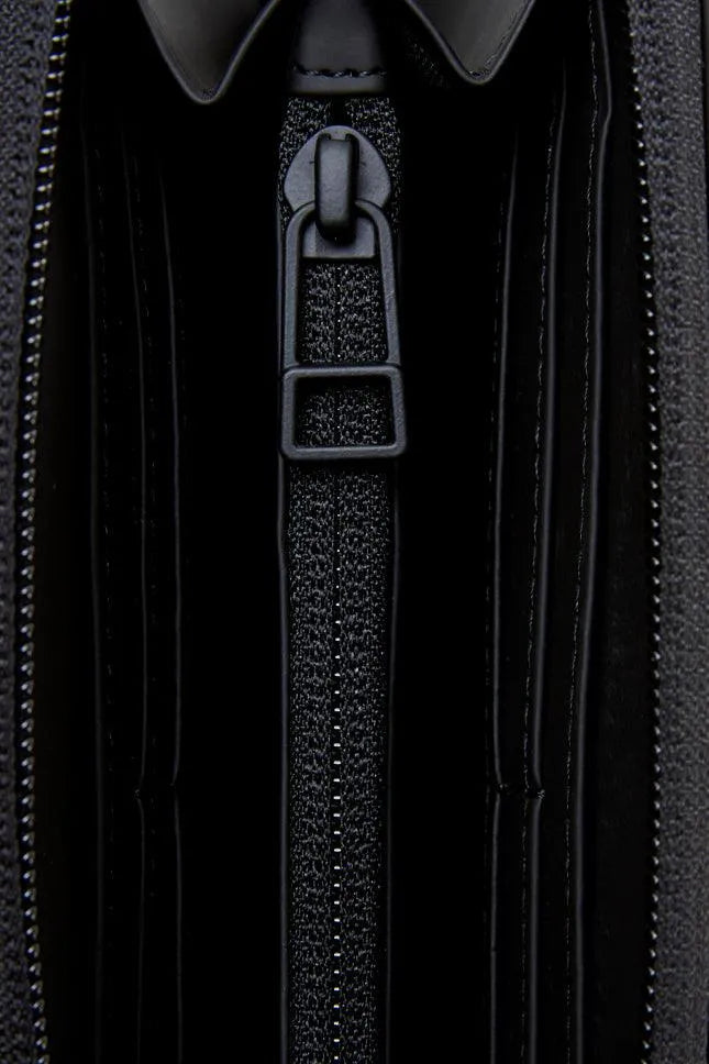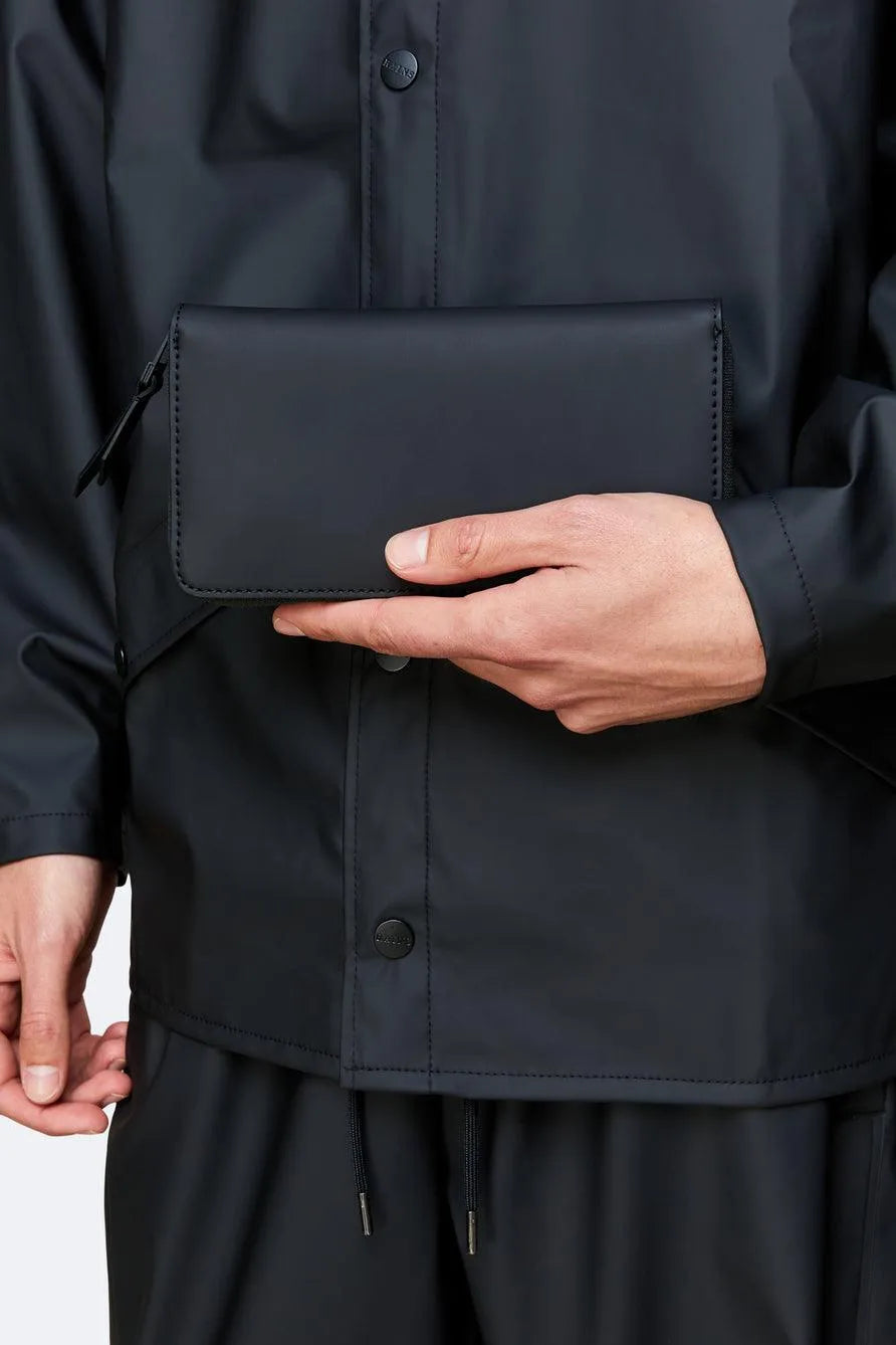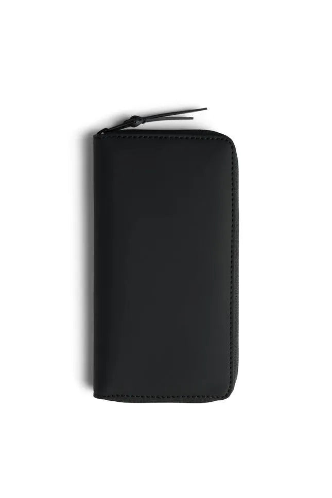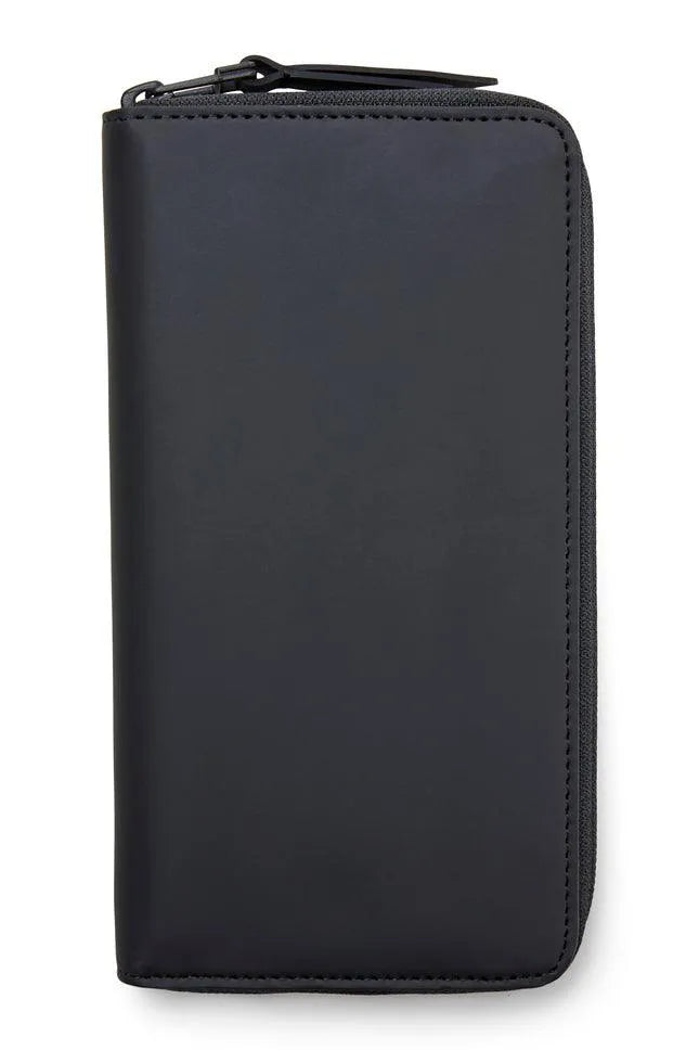 La billetera cuenta con cuatro ranuras para tarjetas, cuatro bolsillos para efectivo y un compartimento interno con cremallera para monedas sueltas. Esta cartera está confeccionada con el tejido impermeable característico de Rains y se completa con un cierre de cremallera y un logotipo de Rains en relieve.