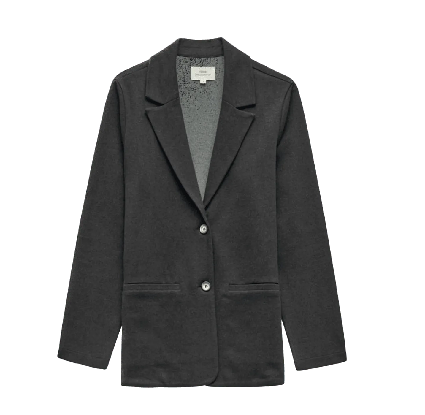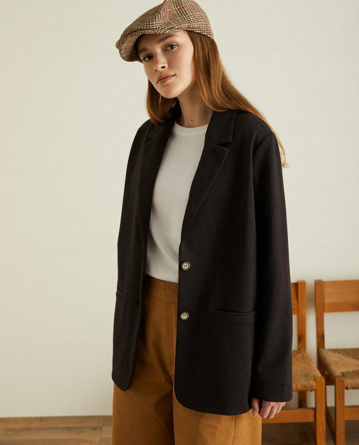 Americana cuello con solapas. Tejido de punto de aspecto afranelado. Cierre frontal con botones. Forro interior. Composición: 41% poliéster, 35% algodón, 21% viscosa, 3% elastano. Altura modelo 175 cm, talla S.