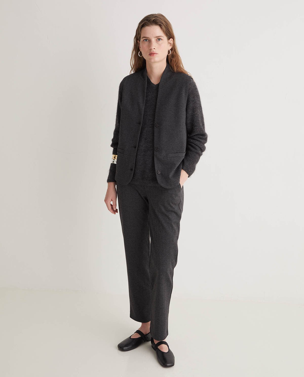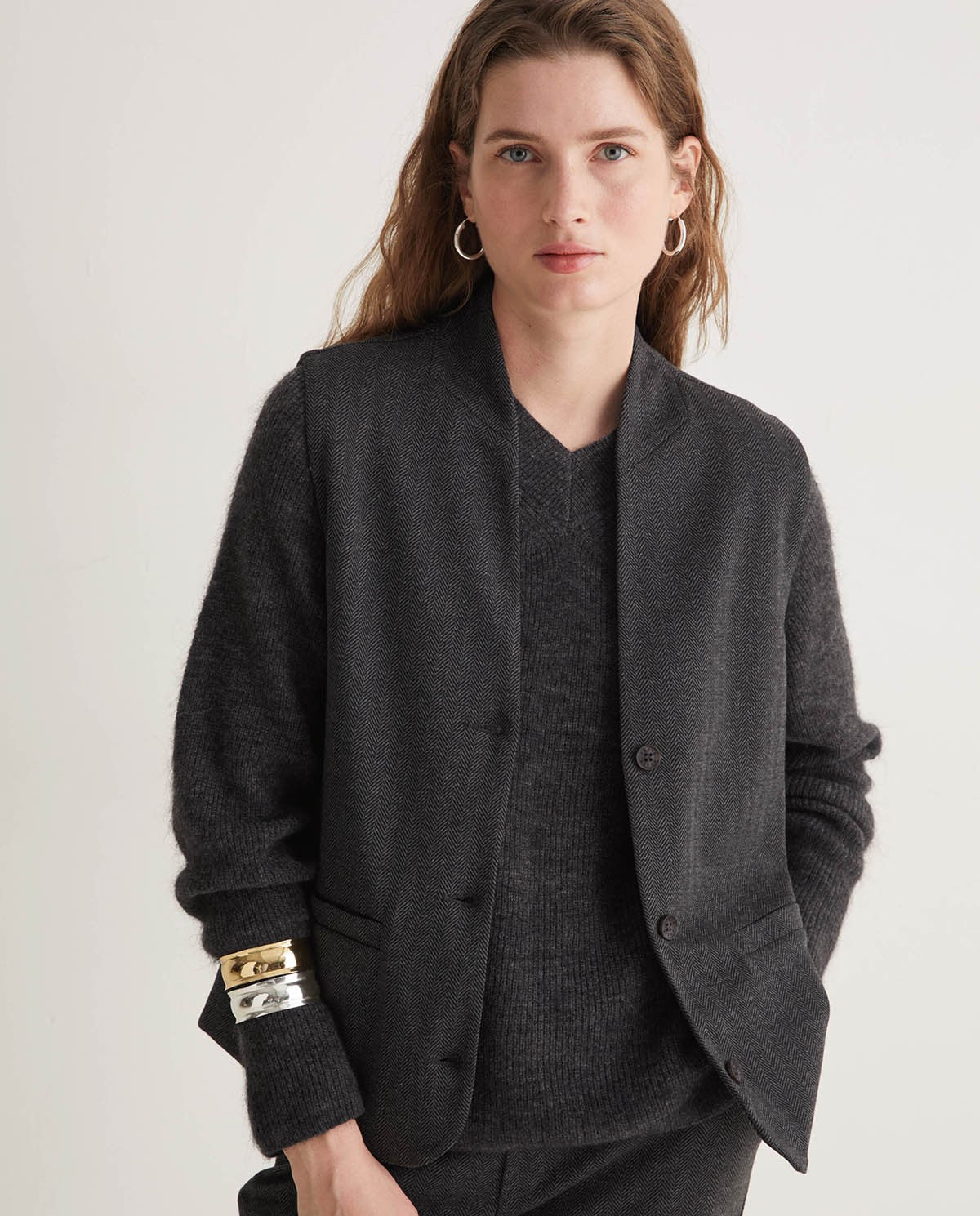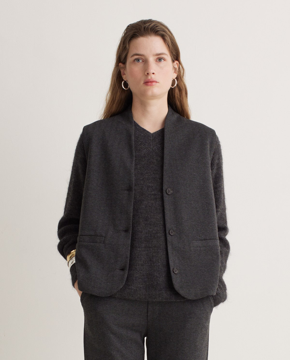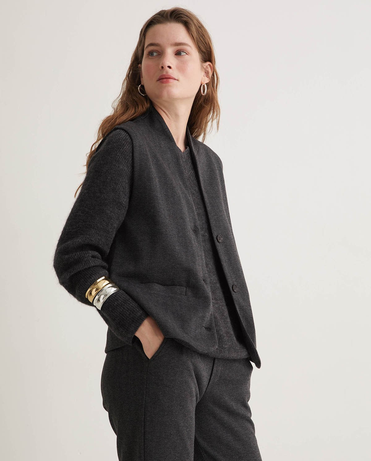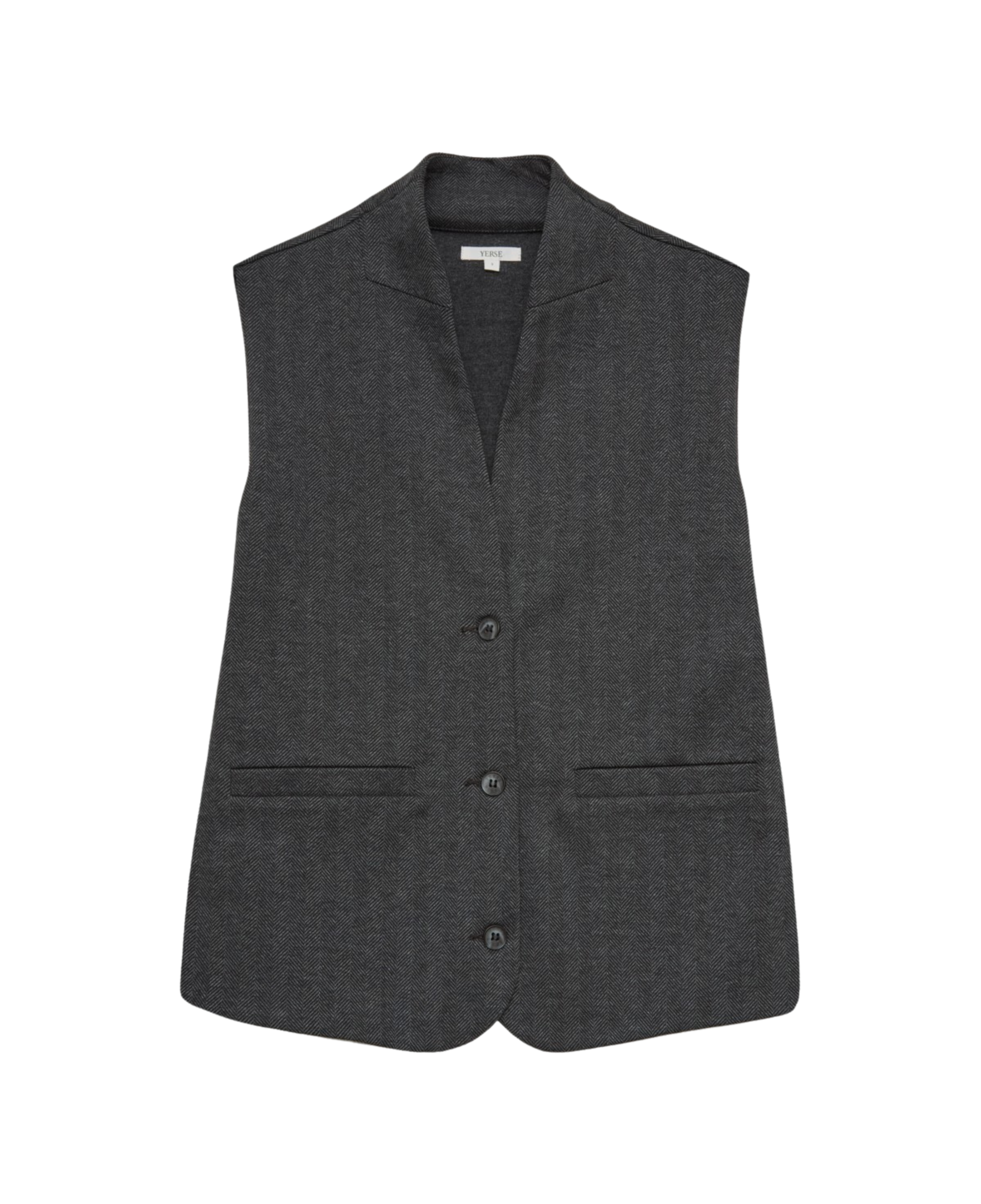El chaleco Punto Tejido Espiga Antracita de Yerse combina diseño atemporal, textura refinada y corte cuidadoso para crear una prenda clave en el armario femenino. Confeccionado en tejido de punto con patrón espiga, presenta un corte regular fit, escote de pico, sin mangas, cierre frontal con botones y bolsillos de vivo en la parte delantera. El color antracita aporta versatilidad y elegancia, mientras que la estructura de espiga le aporta dinamismo sin perder sobriedad. Documentado para tallas desde XS hasta XXL, y con una modelo de 1 75 m usando la talla S.