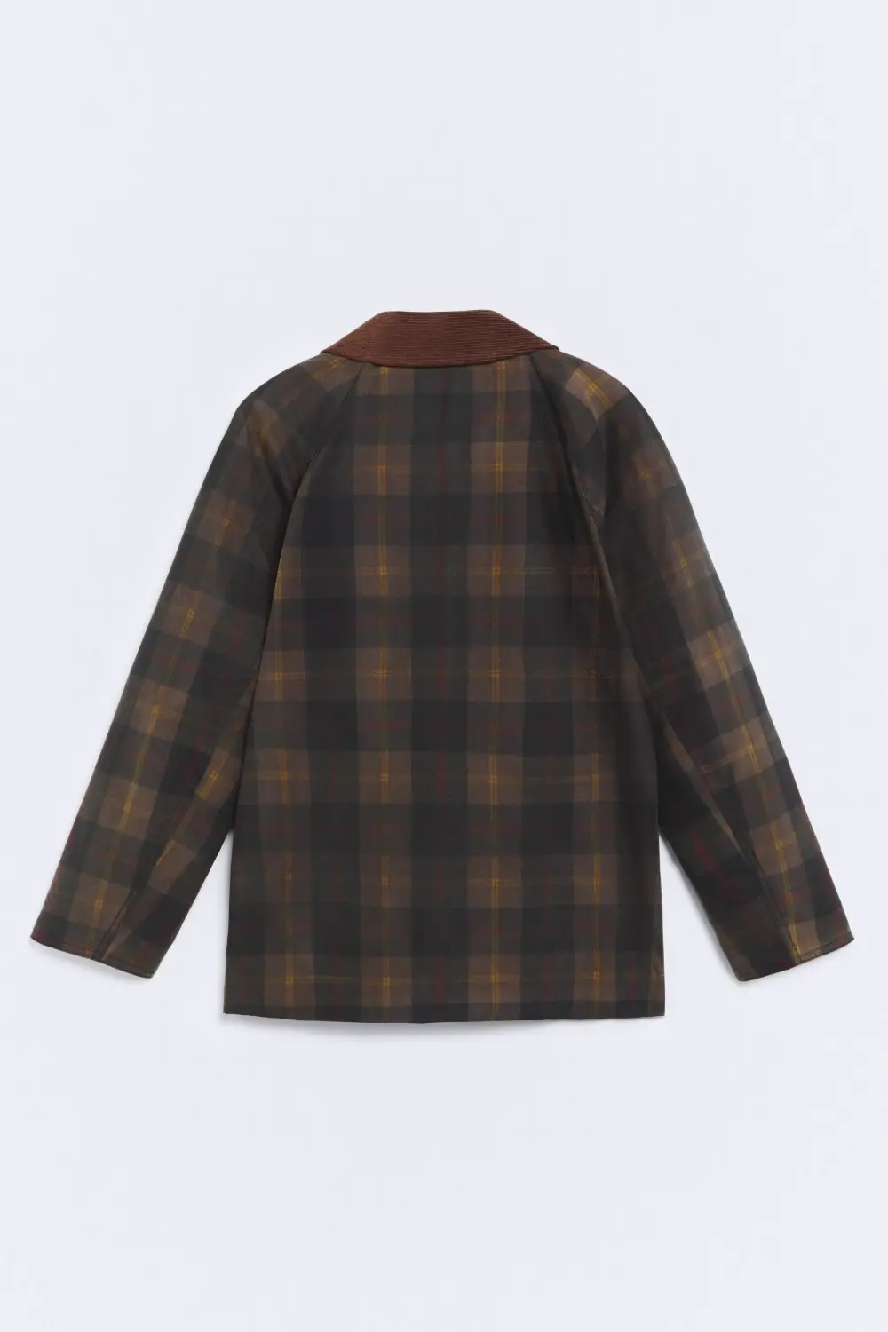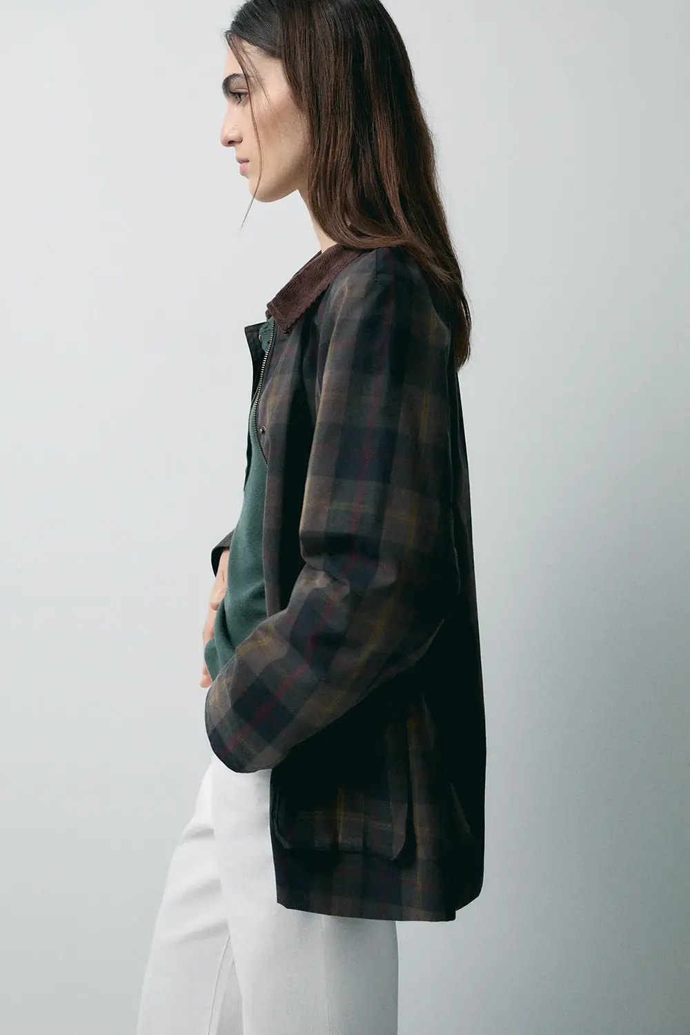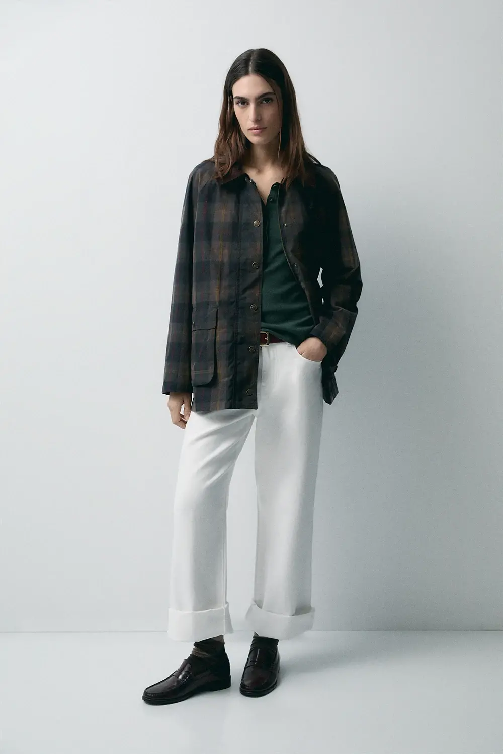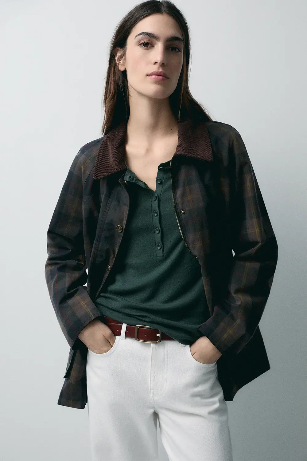 La Chaqueta Algodón Pana Contraste Mackenzie Checks de eseOese es una pieza de carácter con reminiscencias del estilo británico de campo. Fabricada en 100 % algodón BCI encerado, presenta cuello de pana a contraste, cierre frontal con cremallera dorada y botones a presión mate, además de bolsillos plastrón con fuelle y dos aberturas. Su estampado de cuadros “Mackenzie” y acabado encerado evocan la estética tradicional de chaquetas tipo Barbour, combinando funcionalidad con elegancia casual. Ideal para días de transición o paseos en clima templado, aporta un toque atemporal y versátil al guardarropa.