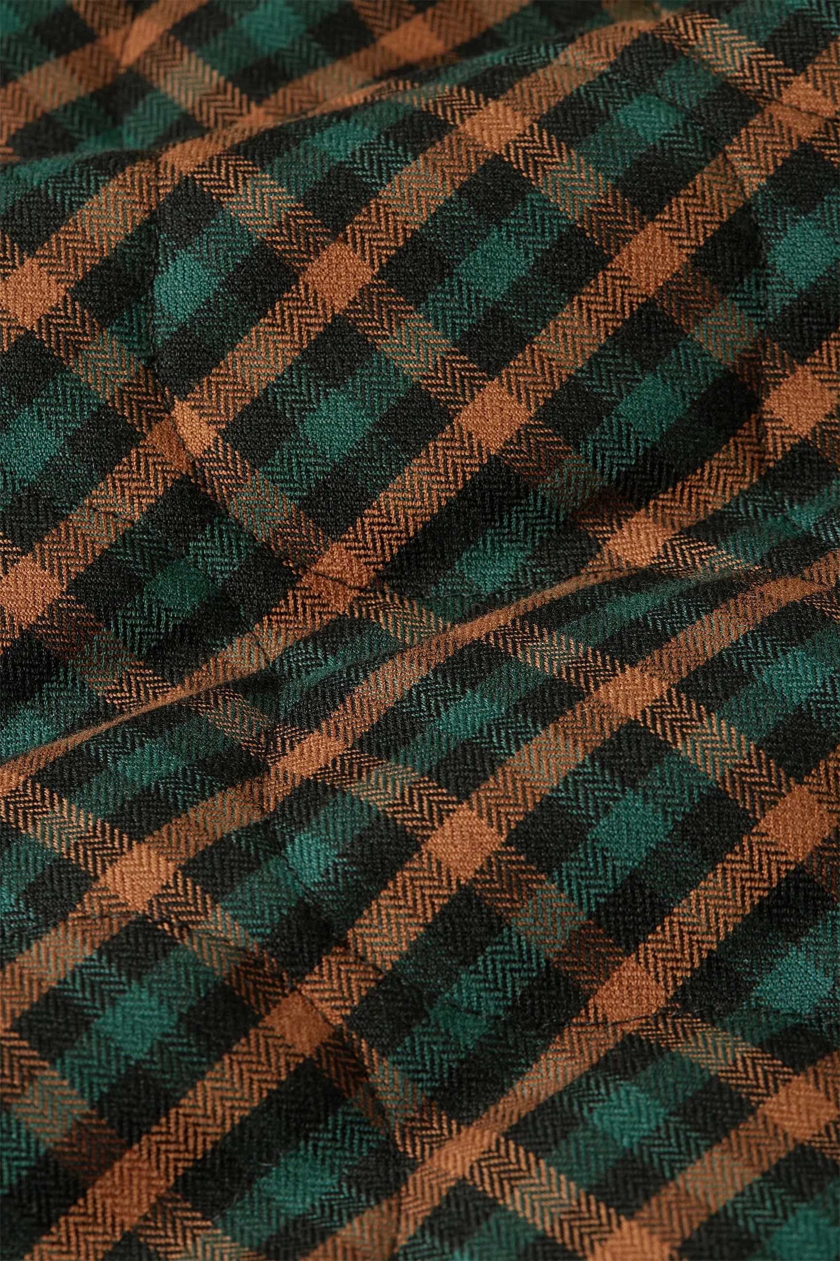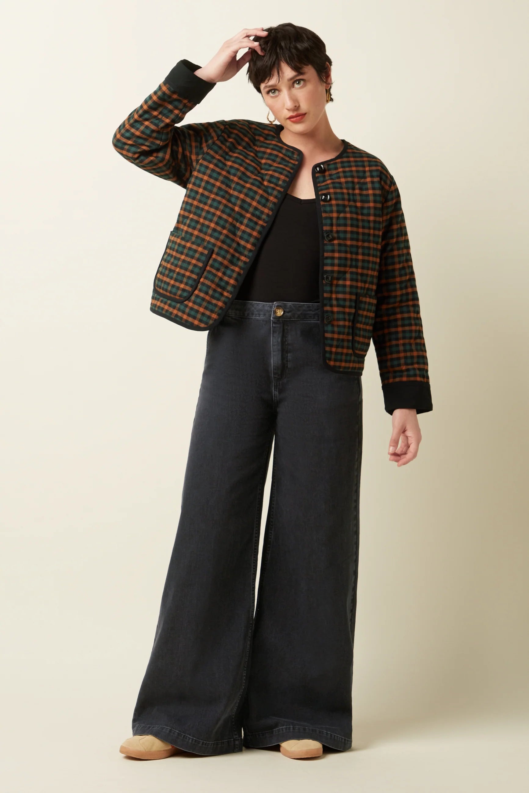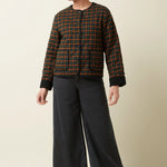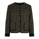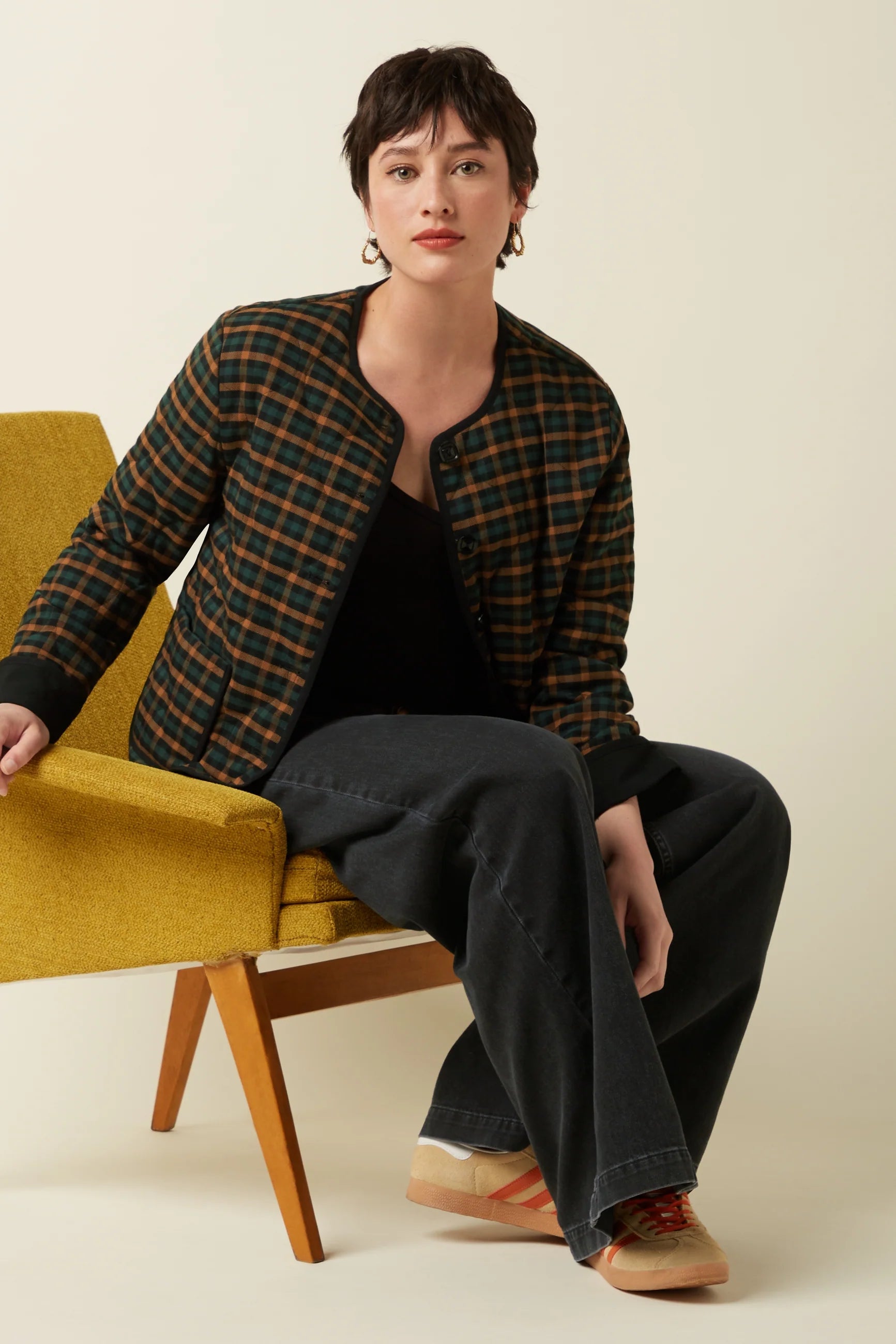 Chaqueta acolchada de cuadros con un diseño clásico y contemporáneo a la vez. Presenta cuello redondo, cierre de botones y bolsillos delanteros funcionales. Su tejido combina poliéster, rayón y un toque de elastano para ofrecer comodidad y estructura, mientras que el forro de viscosa aporta una sensación suave y agradable.