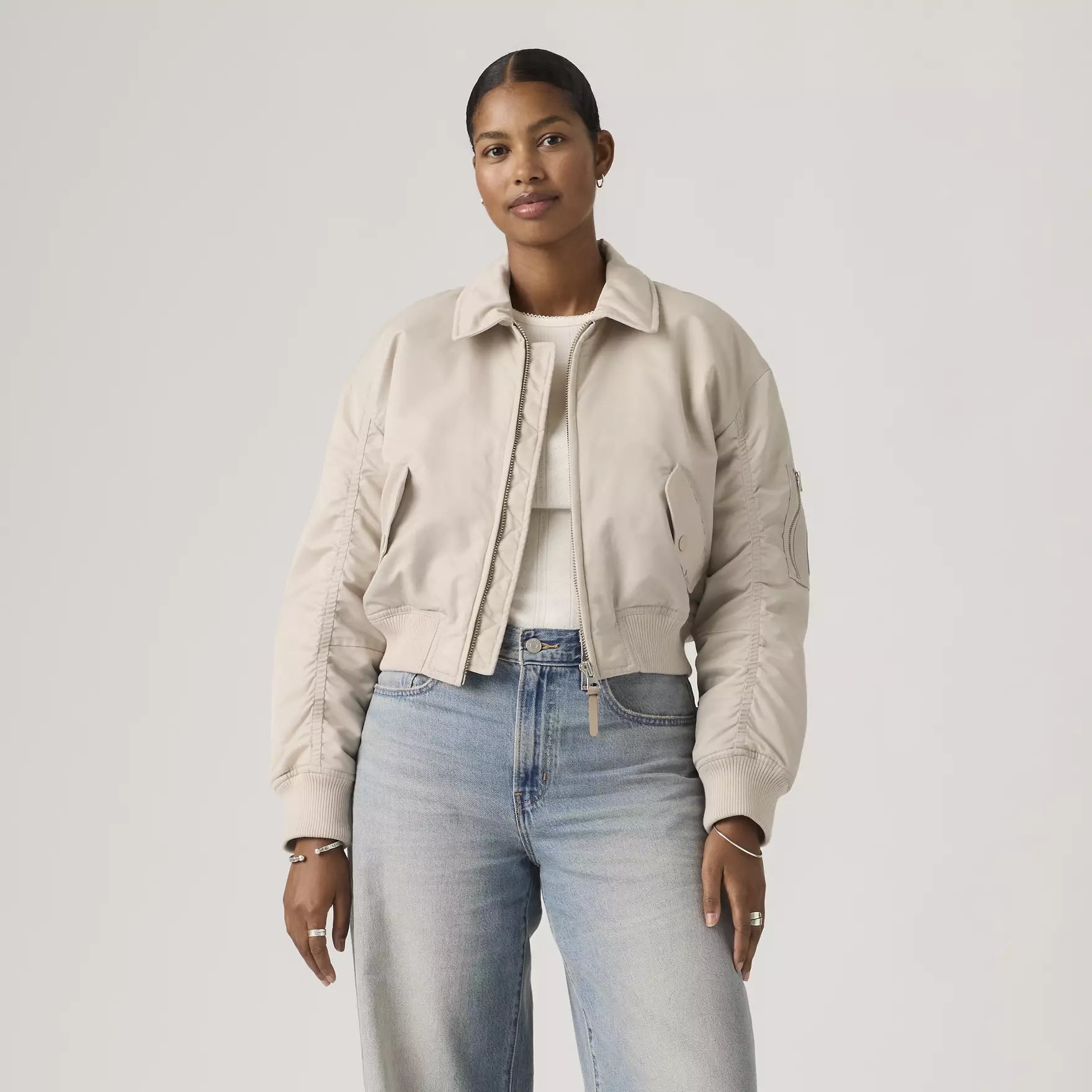 Si sientes que a tu conjunto le falta esa prenda esencial, nuestra cazadora bomber Bowie Cropped rematará todo. La hemos diseñado con una cremallera clásica en el centro, un fit cropped recortado y mangas fruncidas.