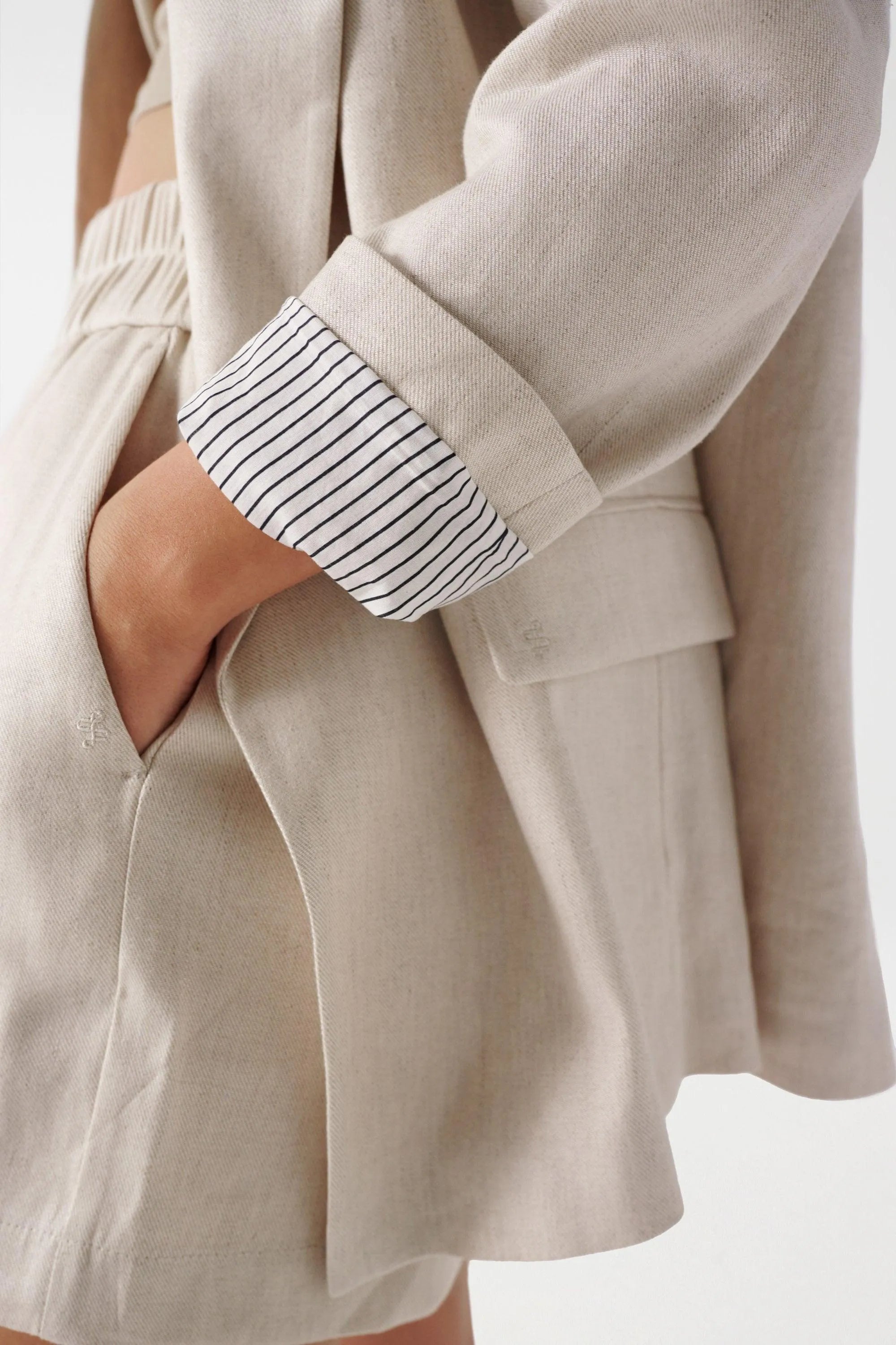 Blazer de lino. Beige. Corte Regular. Manga larga. Dos bolsillos laterales. Detalle de forro de rayas.La modelo mide 1,79 m y lleva la talla S.