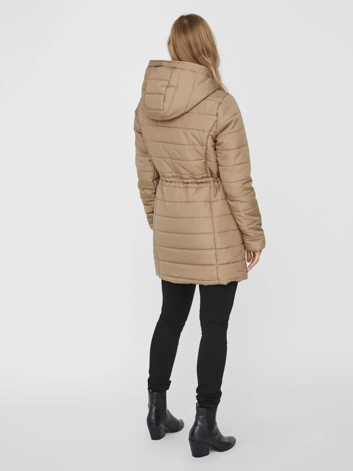 Chaqueta de edredón con capucha y cierre de cremallera, bolsillos abiertos y cordones ocultos en la cintura. Use la chaqueta con botas gruesas en el invierno.
