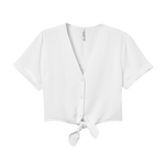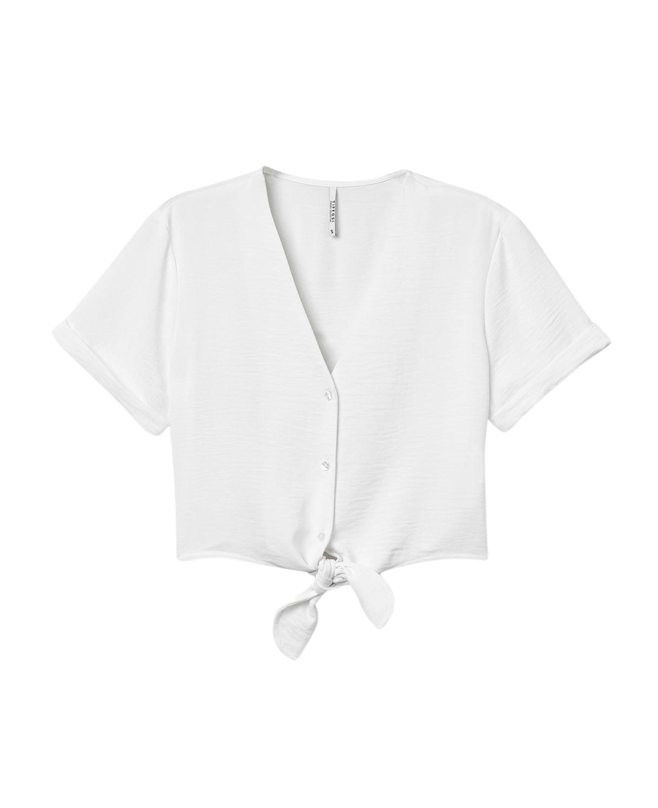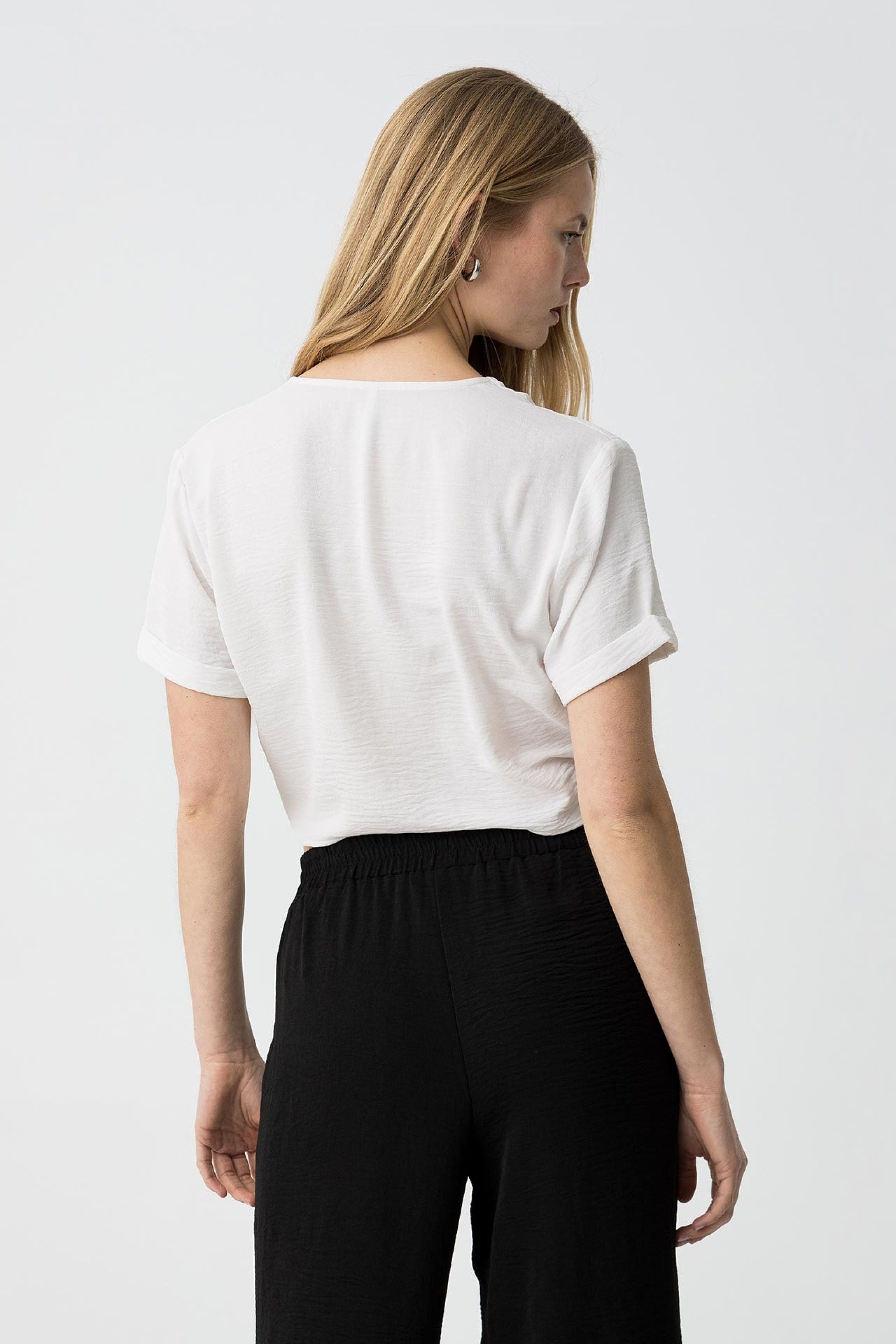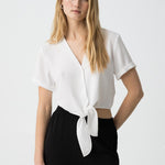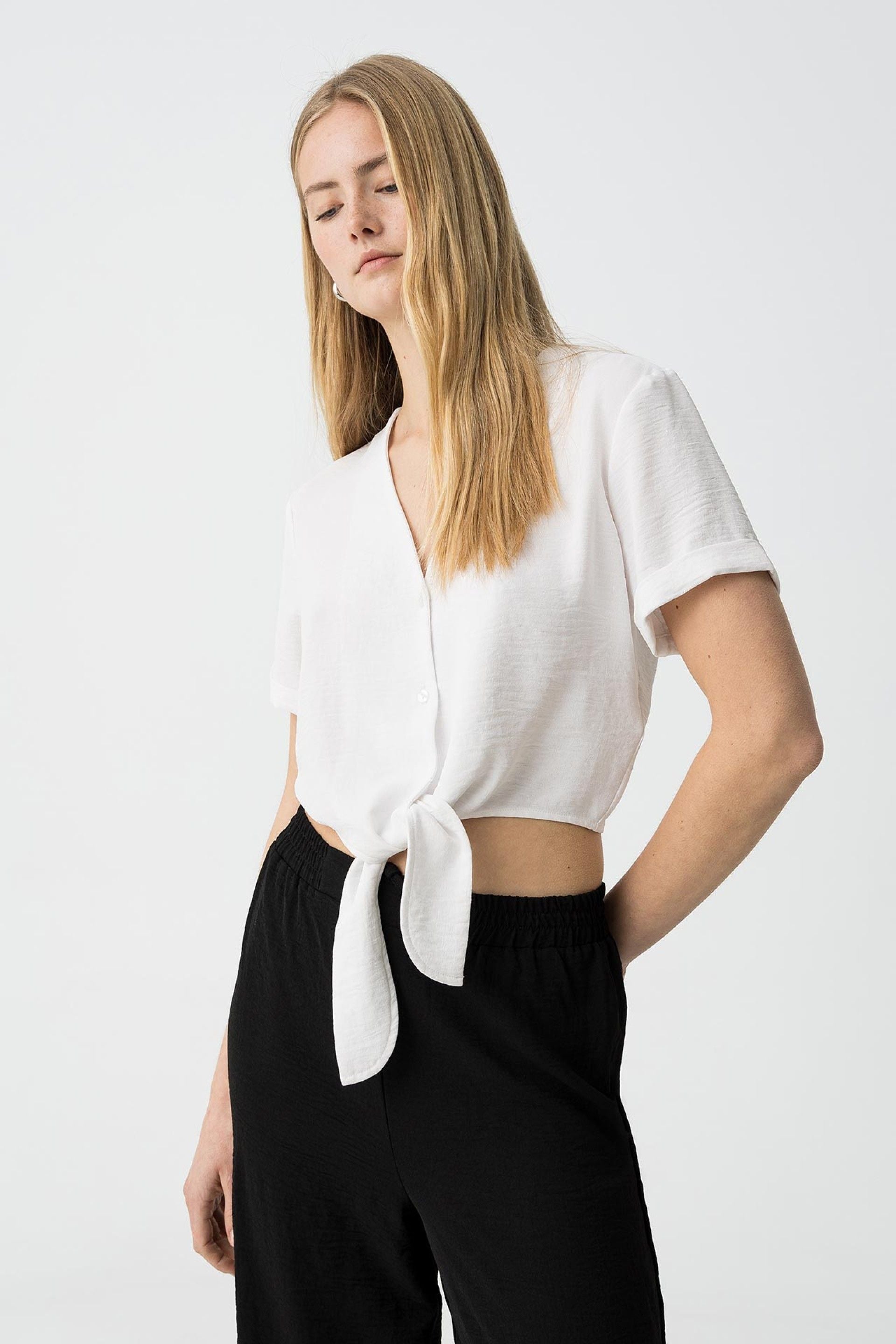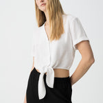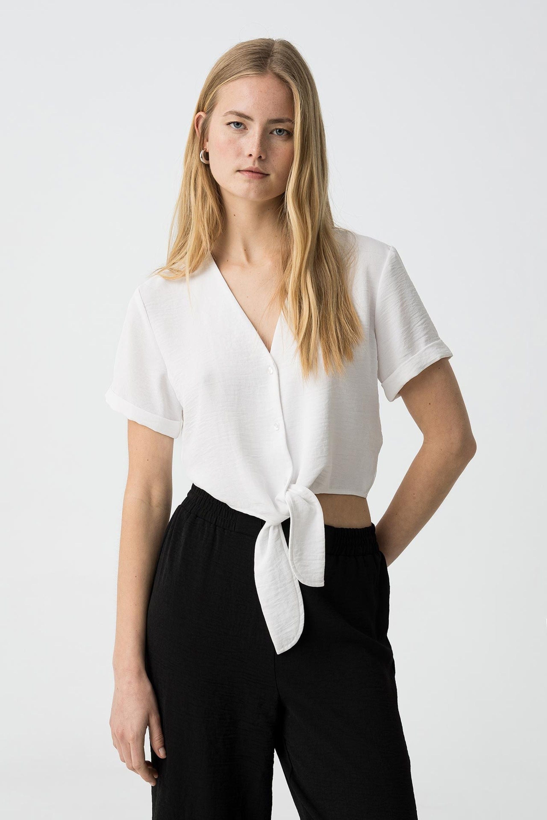 Blusa corta con escote en V y manga corta. Cierre frontal con botones y lazo.