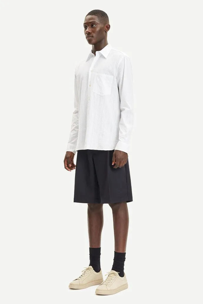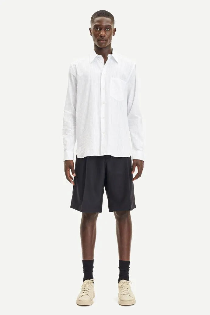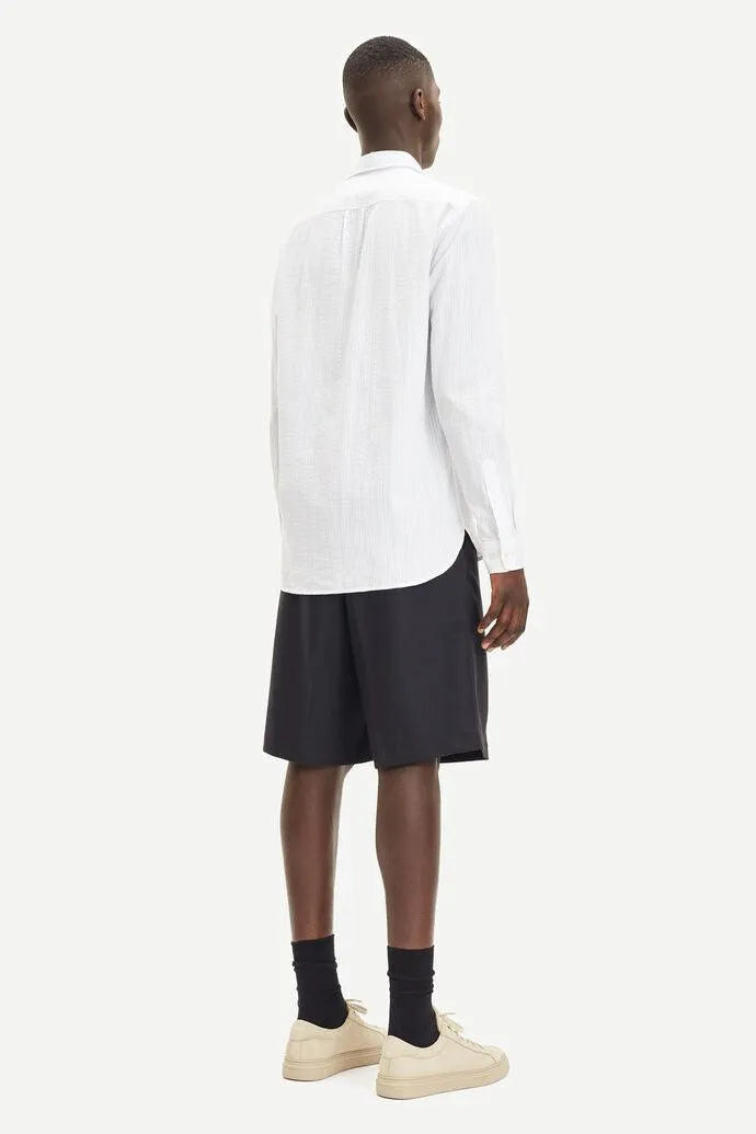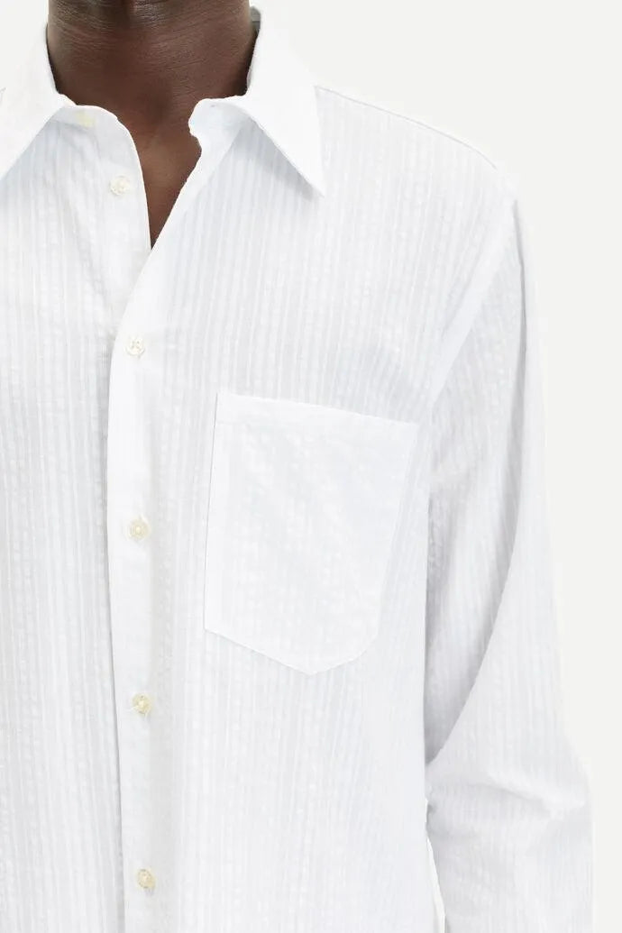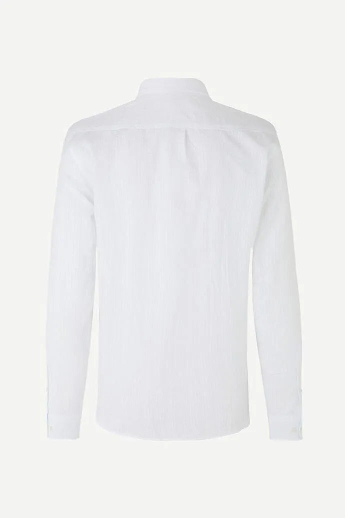 Camisa regular fit de manga larga. Cierre de botones en centro delantero y puños. Bolsillo en el pecho, costura de canesú en la nuca con pliegue, dobladillo redondeado. Tela 100% algodón con raya de sirsaca al tono, tejida en Portugal.