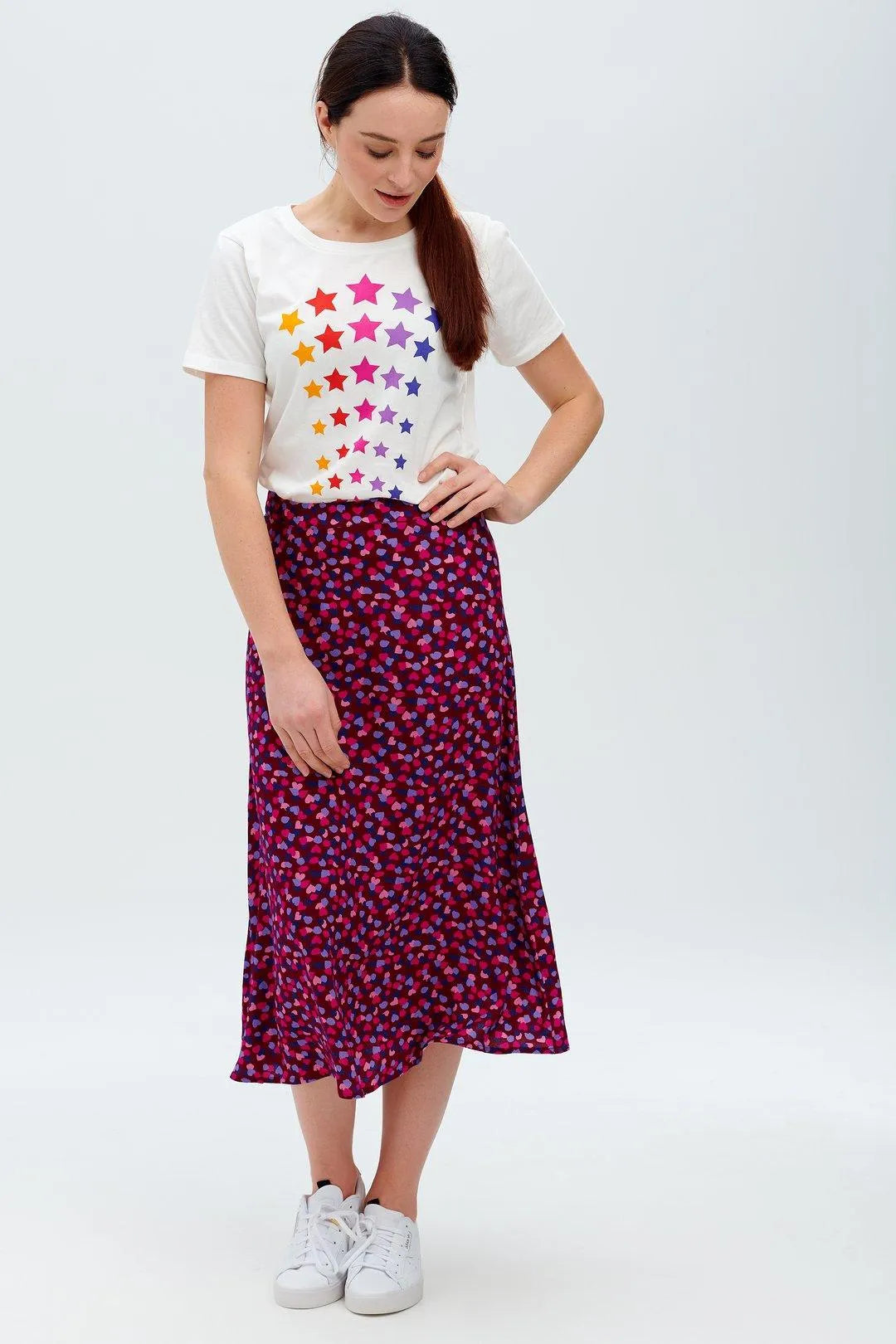 Nos encanta esta falda colorida, que presenta una forma clásica de una línea a la vez que muestra nuestro vibrante estampado de pétalos cayendo en tonos de rosa y burdeos. La falda Adelia tiene un largo midi fácil de llevar.