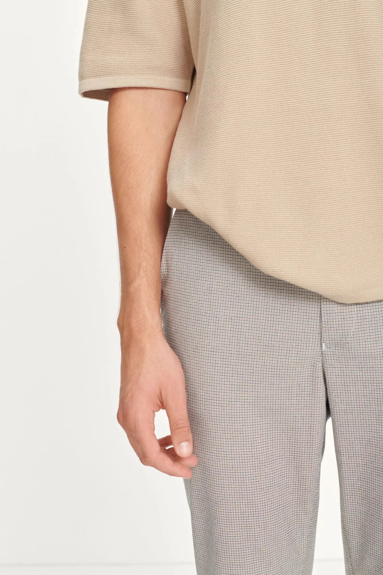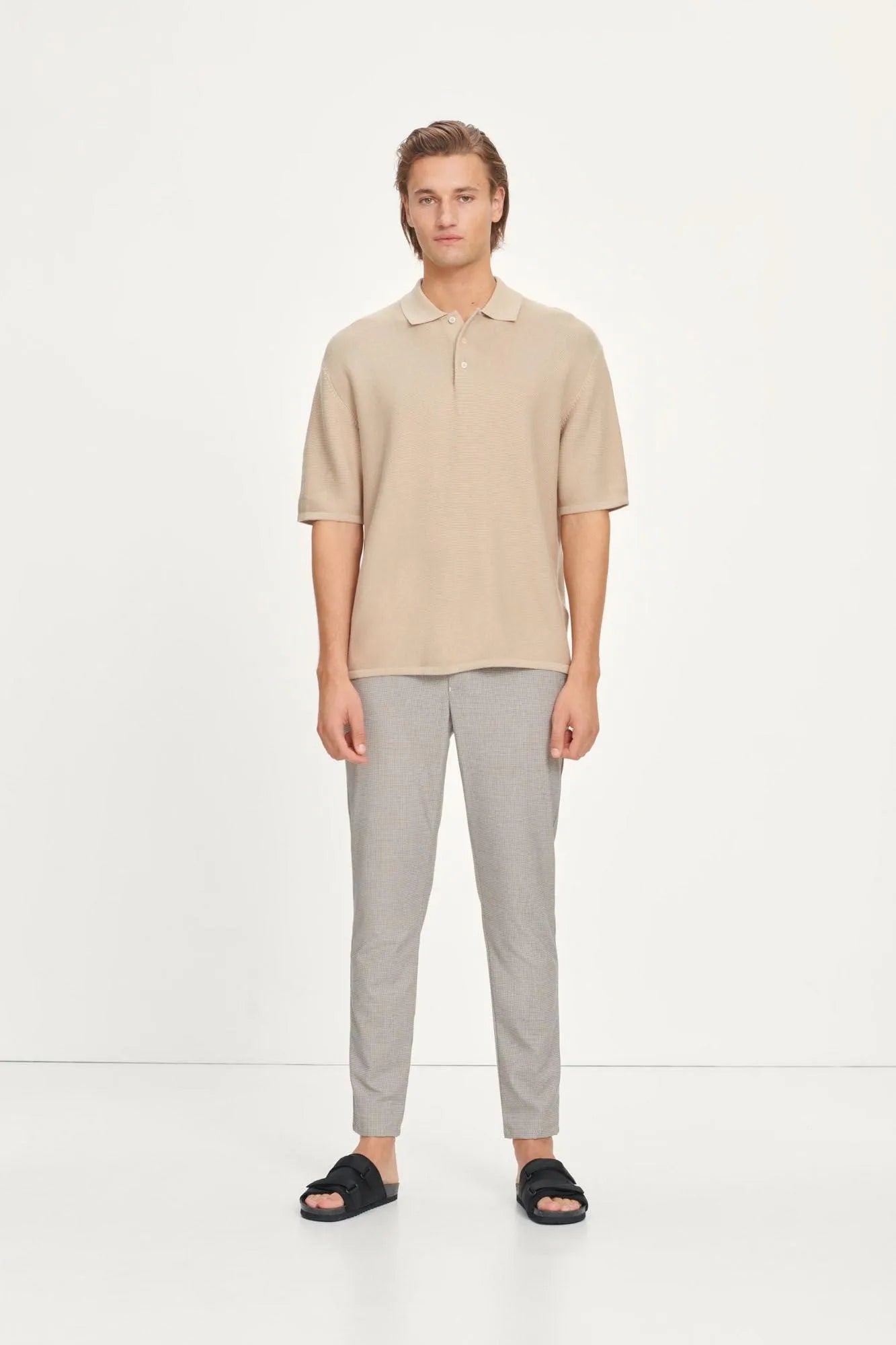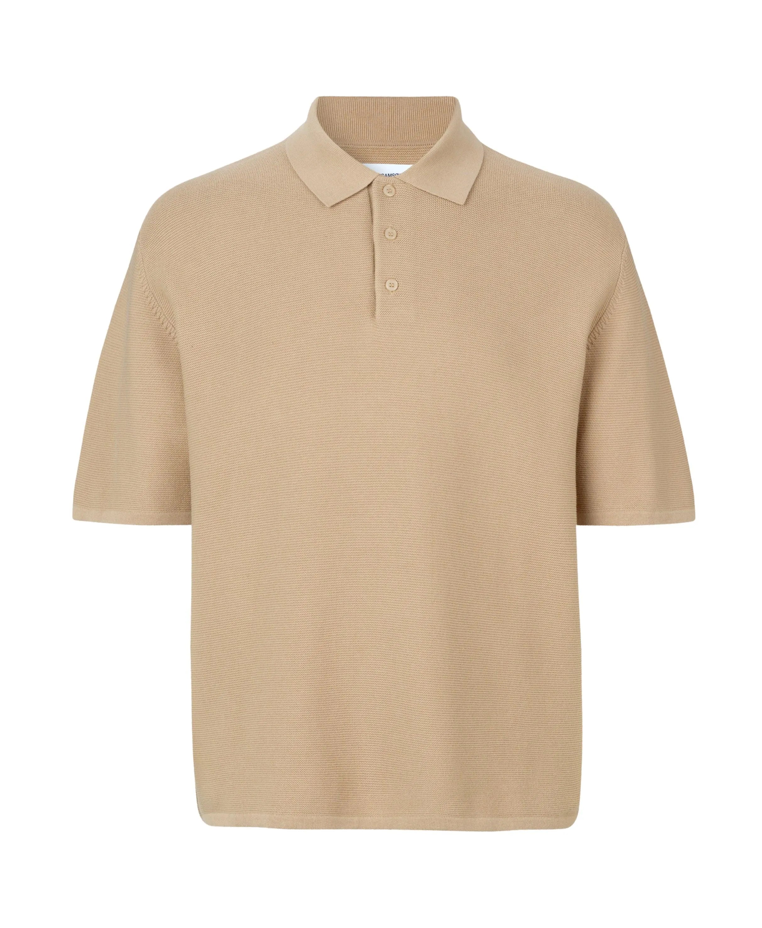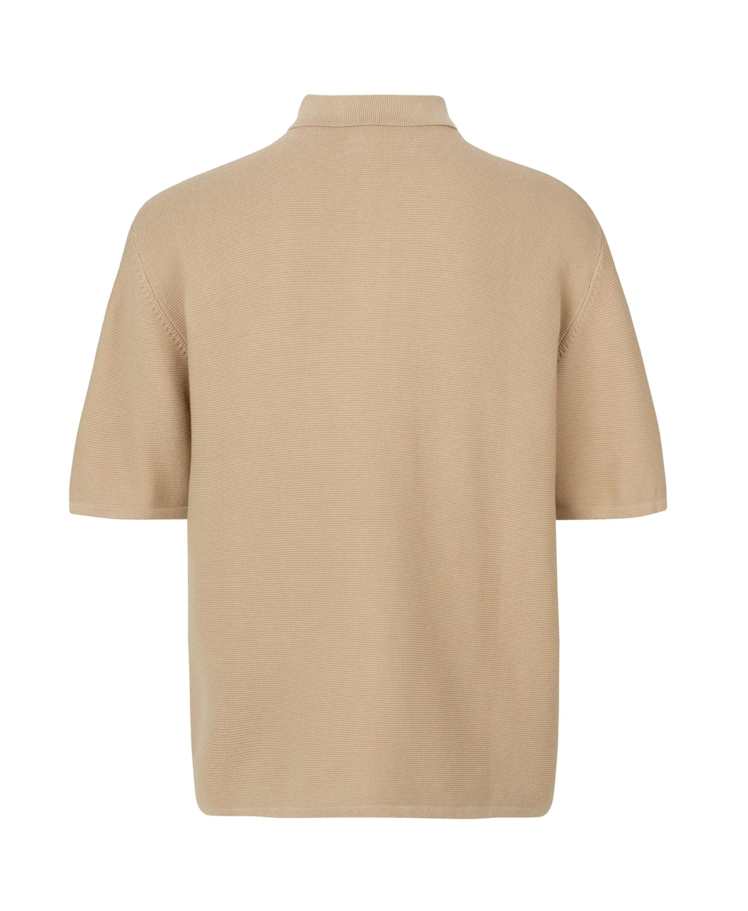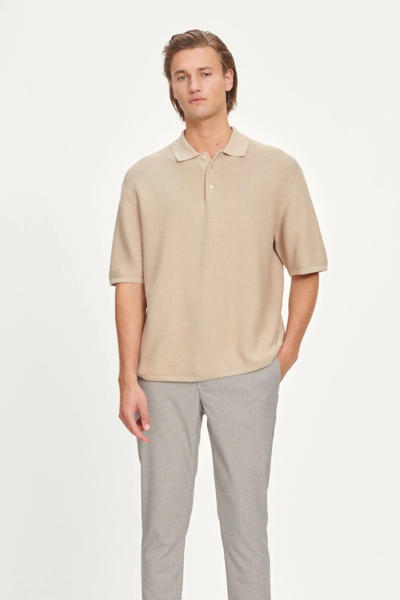Polo de punto de corte holgado con hombros caídos y manga corta. Cuello en punta, tapeta con cierre de botones en el cuello. Puntada ondulada texturizada tejida, costuras totalmente formadas. Hilo 100% algodón orgánico.