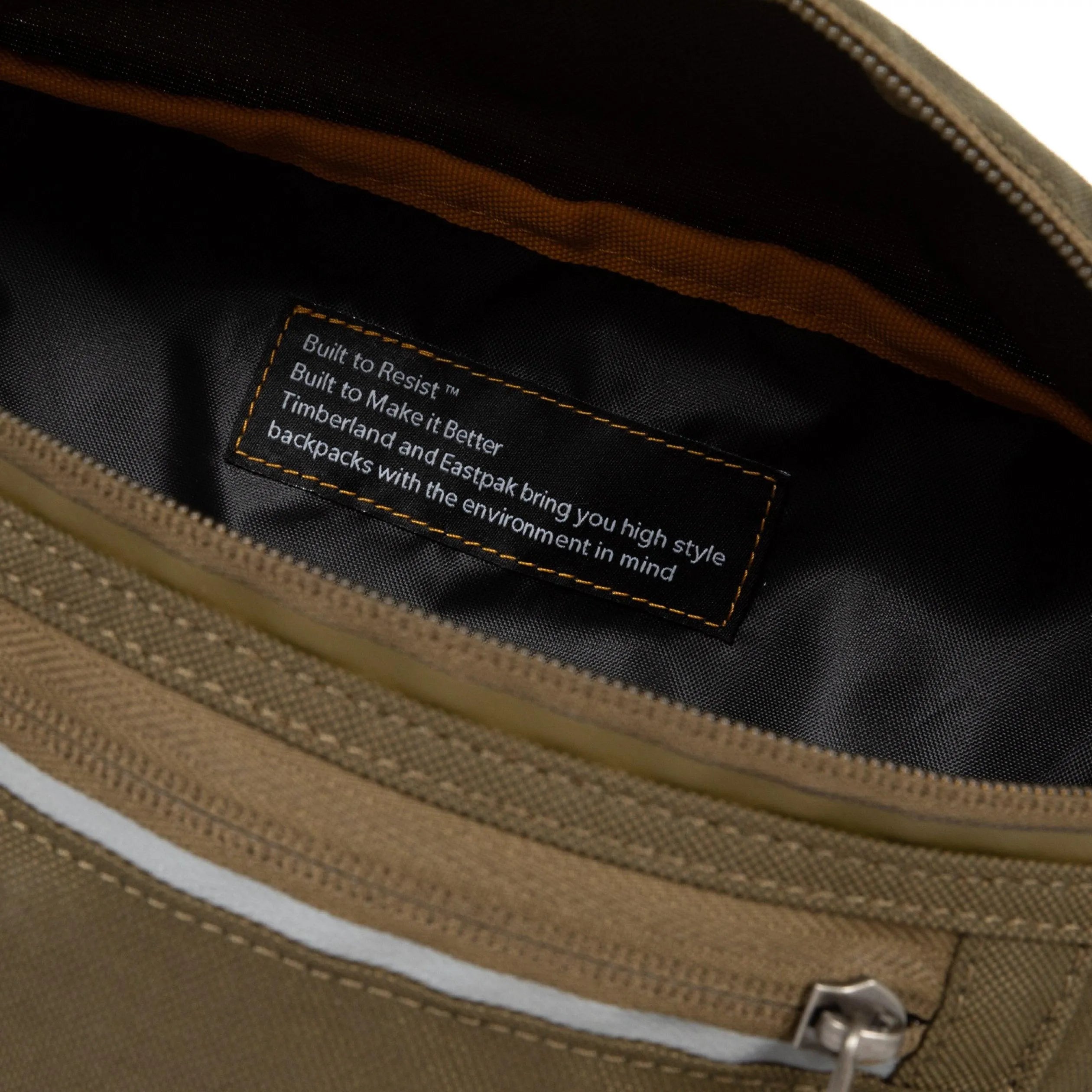 Lleva las manos desocupadas con esta riñonera, en poliéster verde característico de Timberland y acabada con adornos de cuero