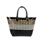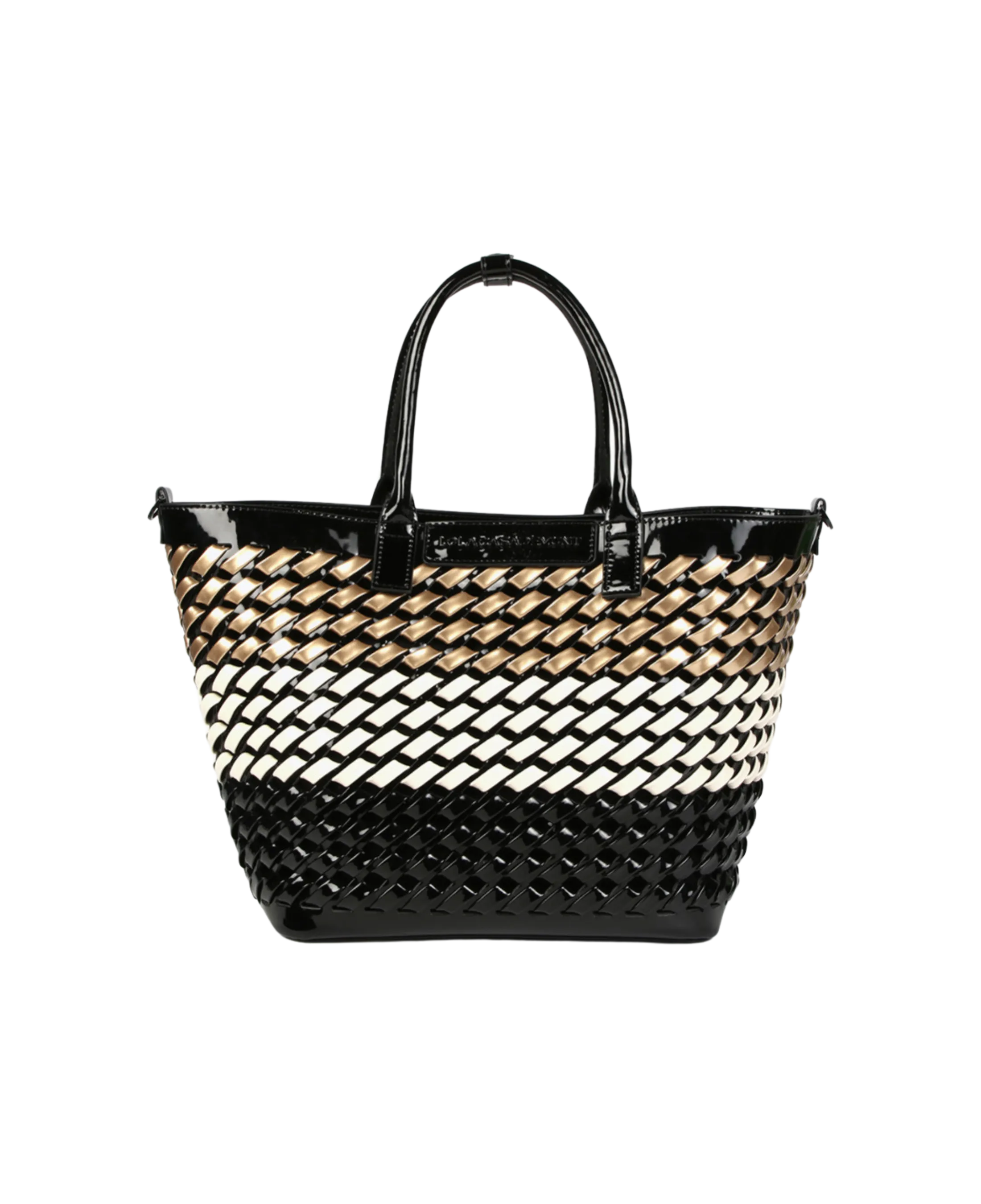 Capazo en charol. Detalle de material trenzado en tres tonos. Contiene asa bandolera logotipada.