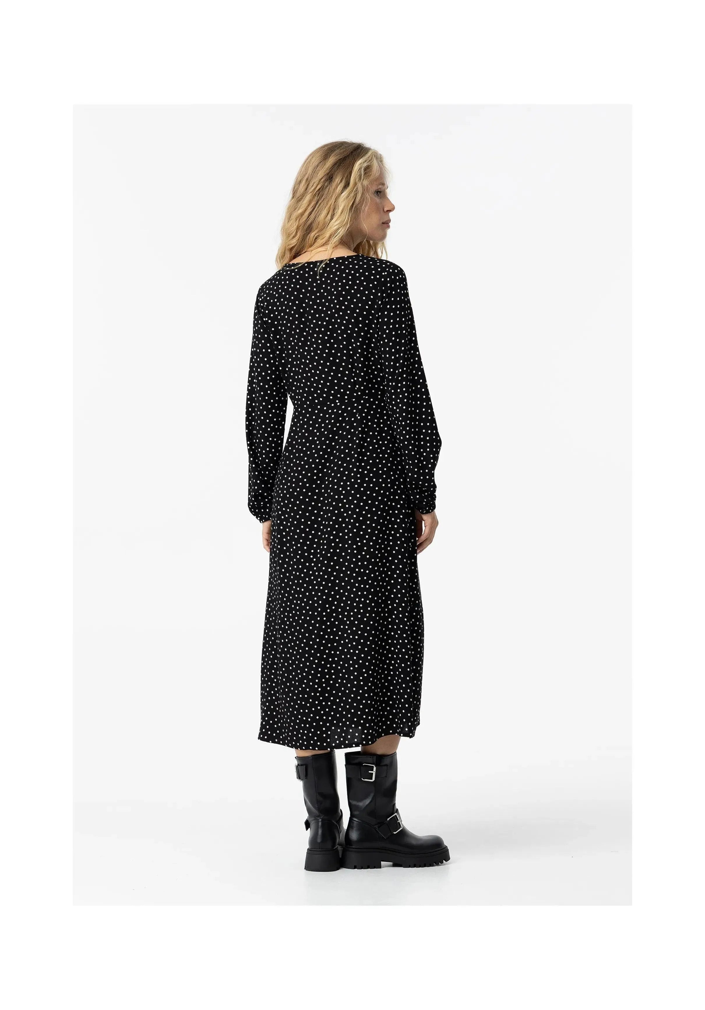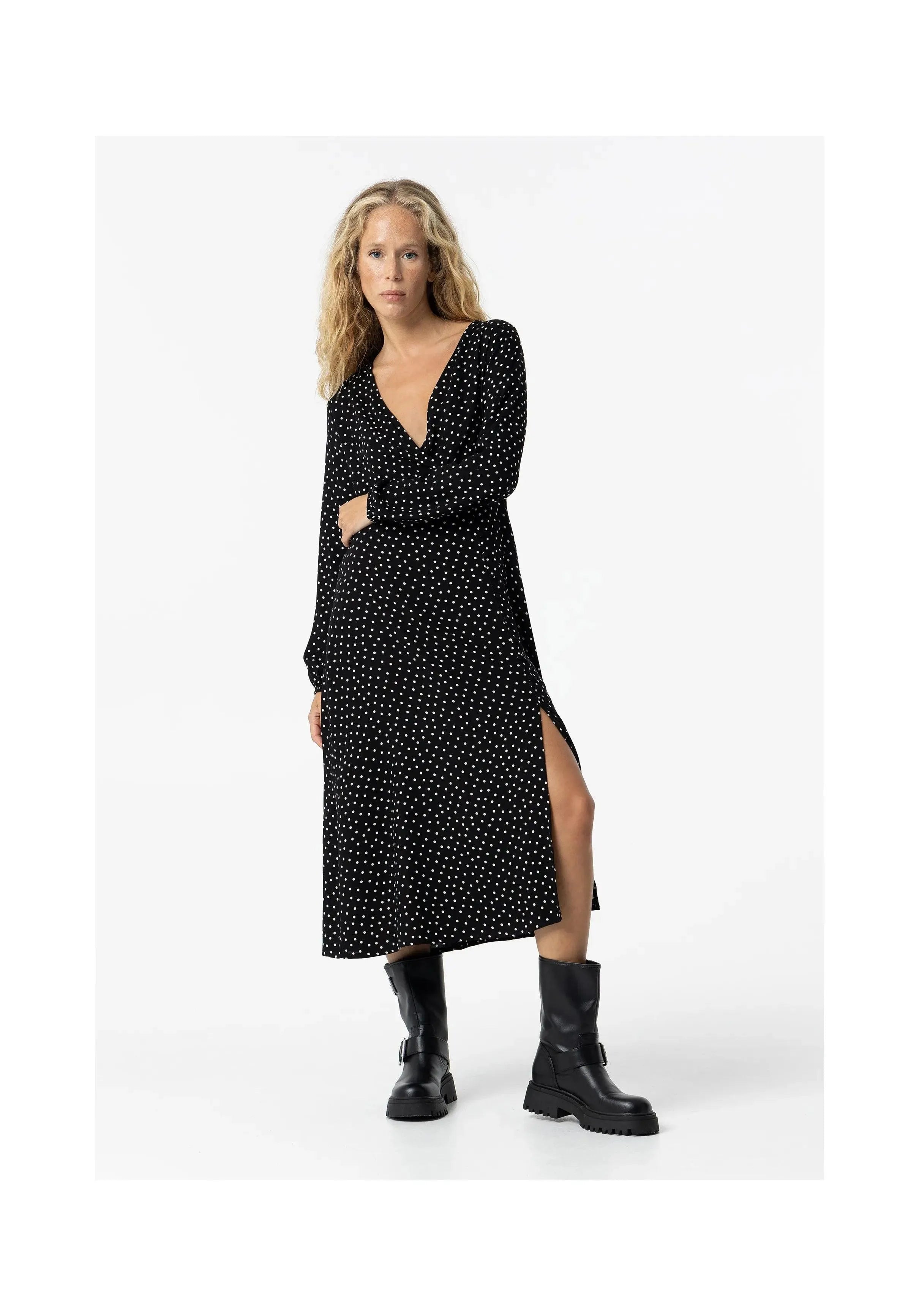 Vestido con escote cruzado y manga larga con elástico en los puños. Estampado all over. Abertura frontal con botones falsos forrados.